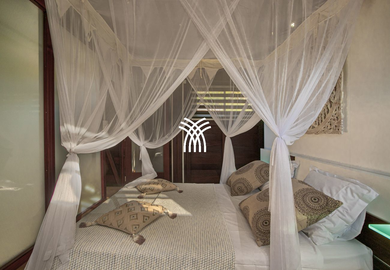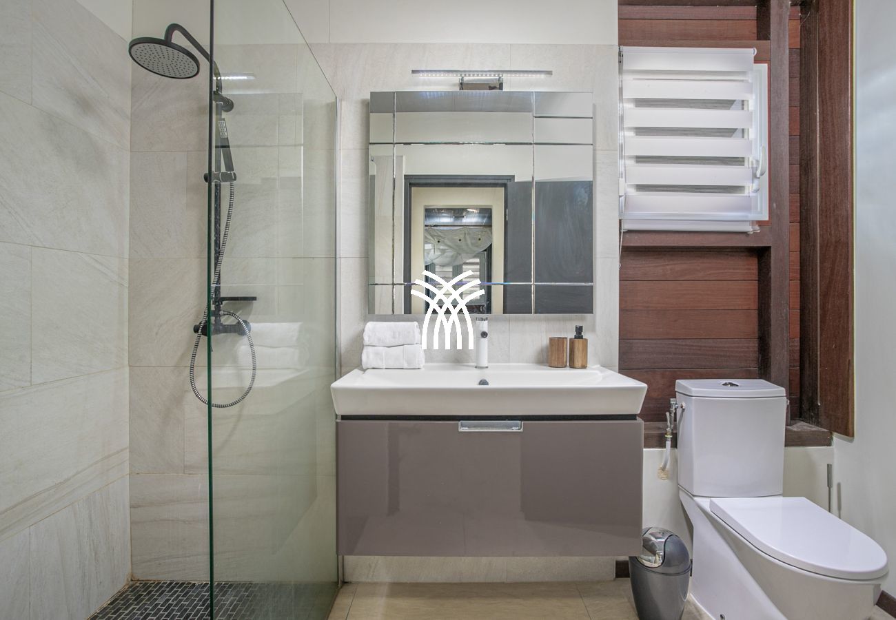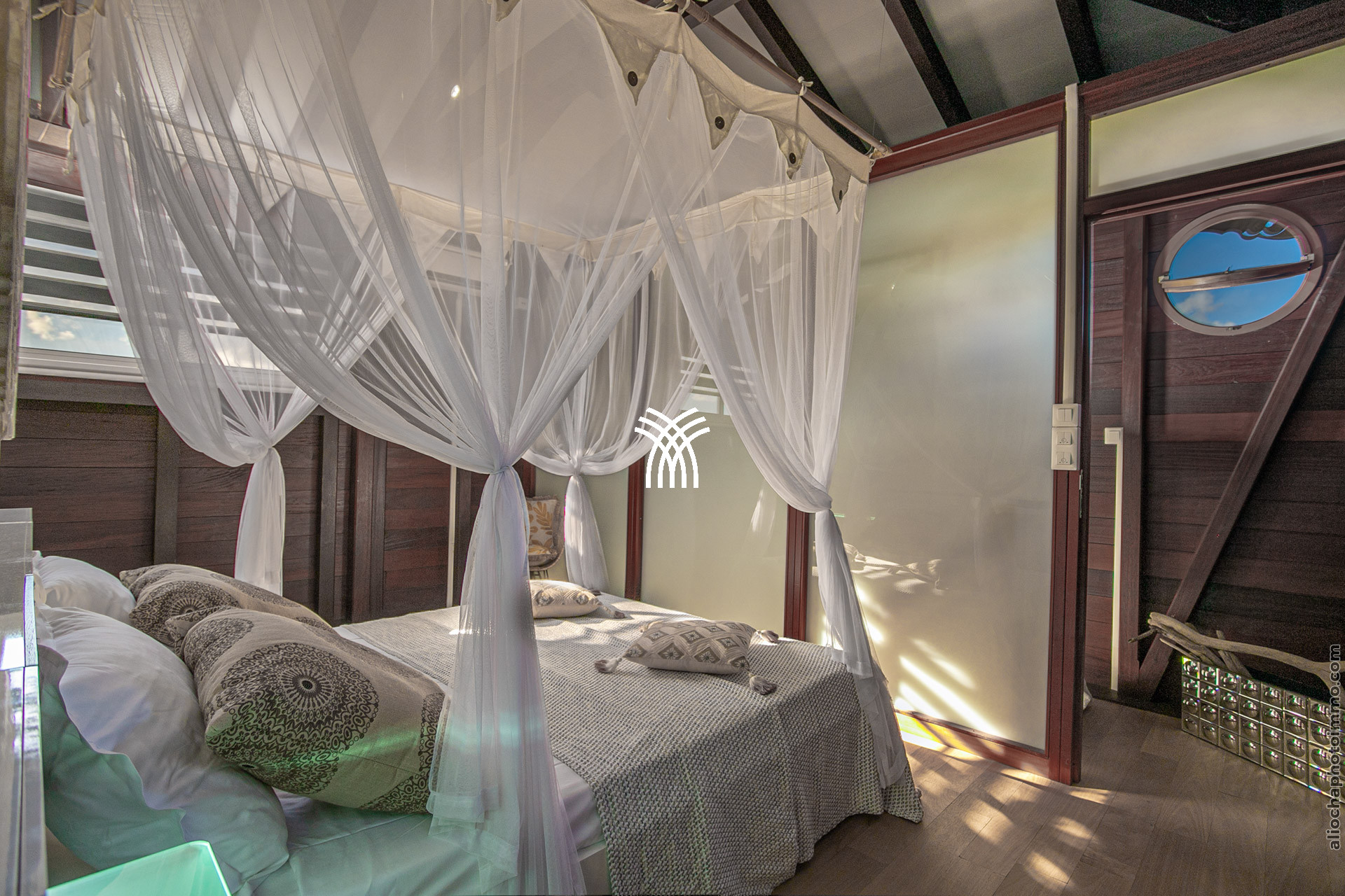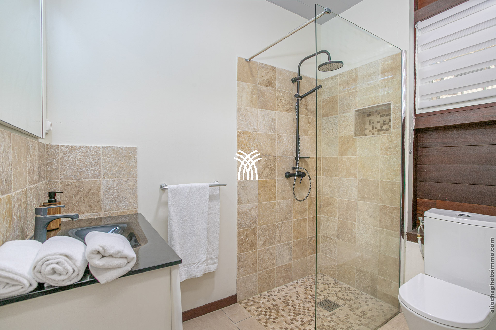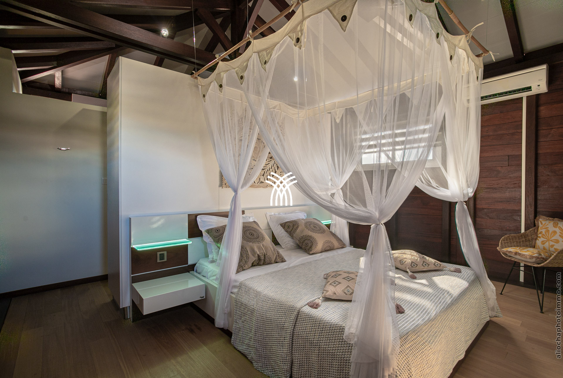 With an area of 220 m², the Villa Bwa Chik can accommodate twelve adults and four children in its six air-conditioned bedrooms, each with a shower room and toilet. Spread over three levels, the bedrooms are elegant and comfortable.