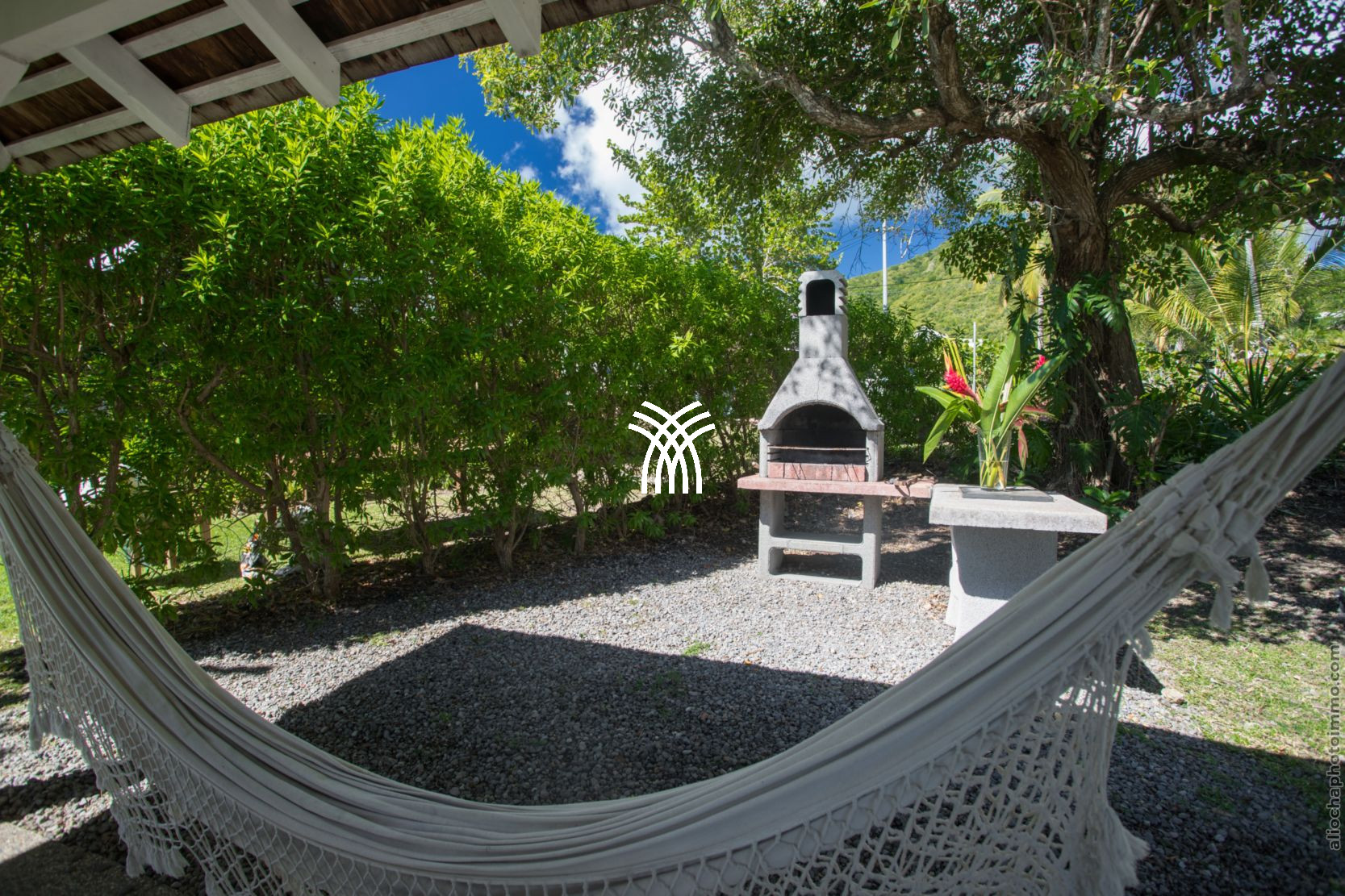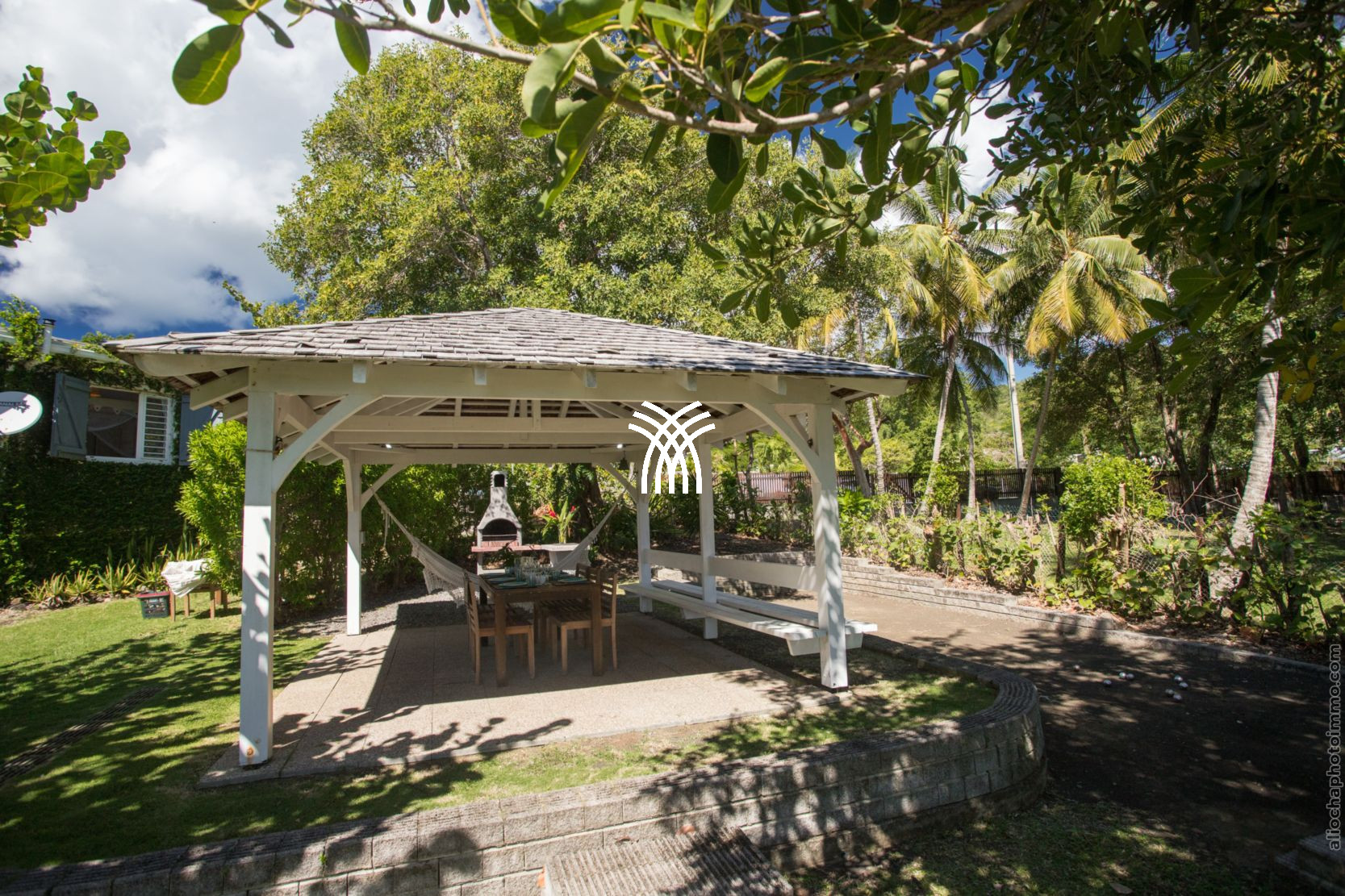 Outside, everything is designed for sensory pleasure: a large terrace with dining area, a lounge under a pergola for aperitifs facing the horizon, a carbet with a barbecue in the heart of the tropical garden, hammocks for shaded naps, and even a pétanque court for convivial games. From the back of the park, a private path leads you directly to turquoise waters, between Dizac beach and the discreet Anse Cafard.