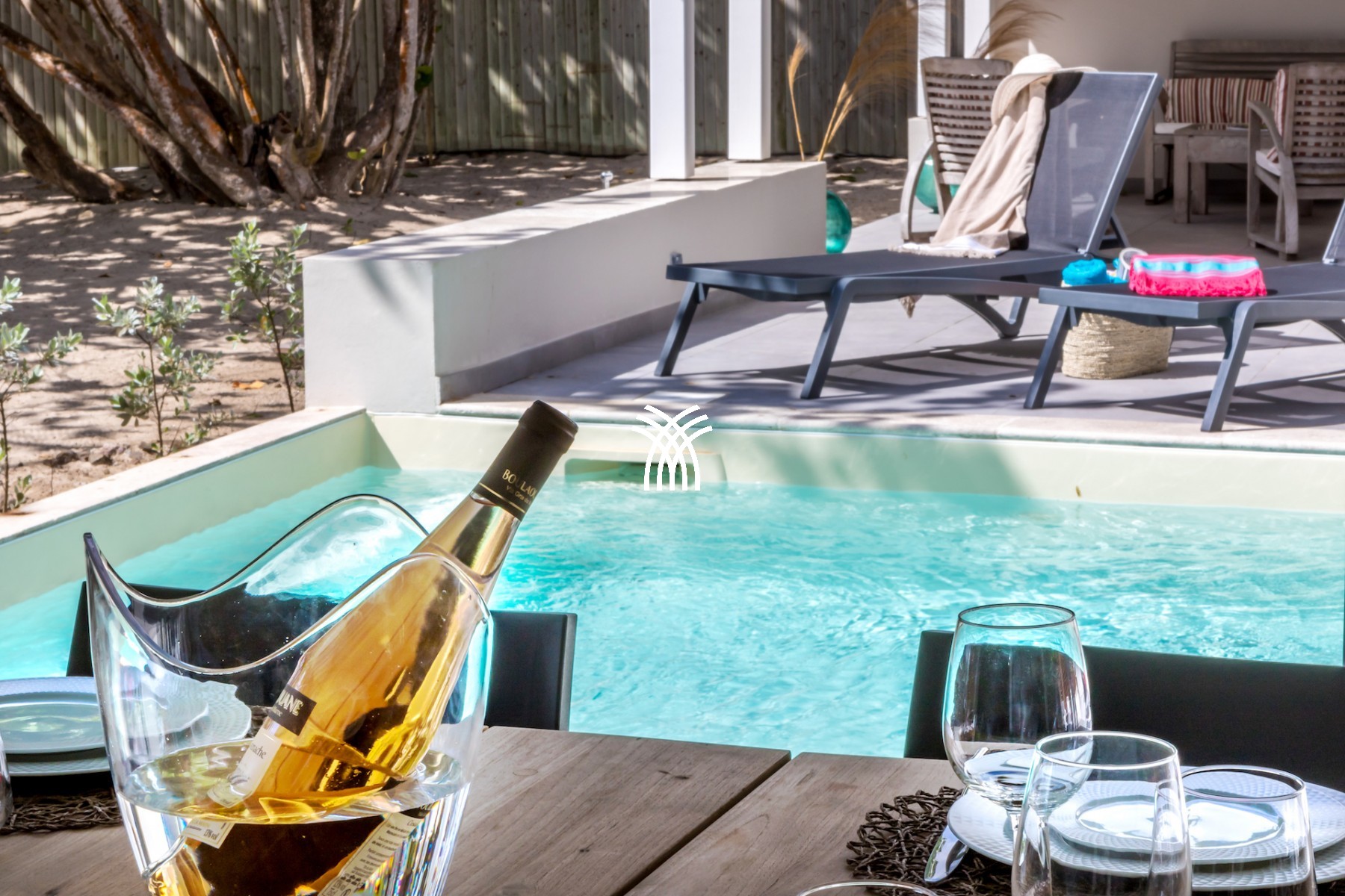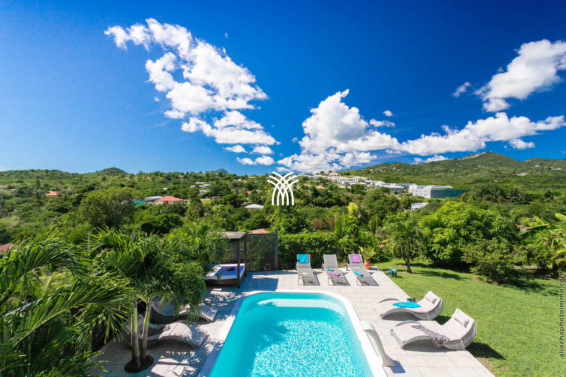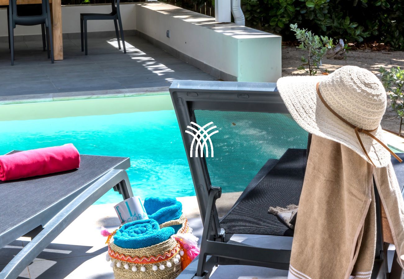 The villa's 60 m² terrace is a true living space, sometimes a lounge, sometimes a dining room, where you can enjoy the softness of the tropical climate. From the terrace, admire the green shades of the surrounding vegetation, a setting conducive to relaxation and daydreaming. Below, a pool beautifully integrated into the tropical garden invites relaxation. With its sun loungers and day bed, this space is designed for you to fully enjoy the surrounding nature.