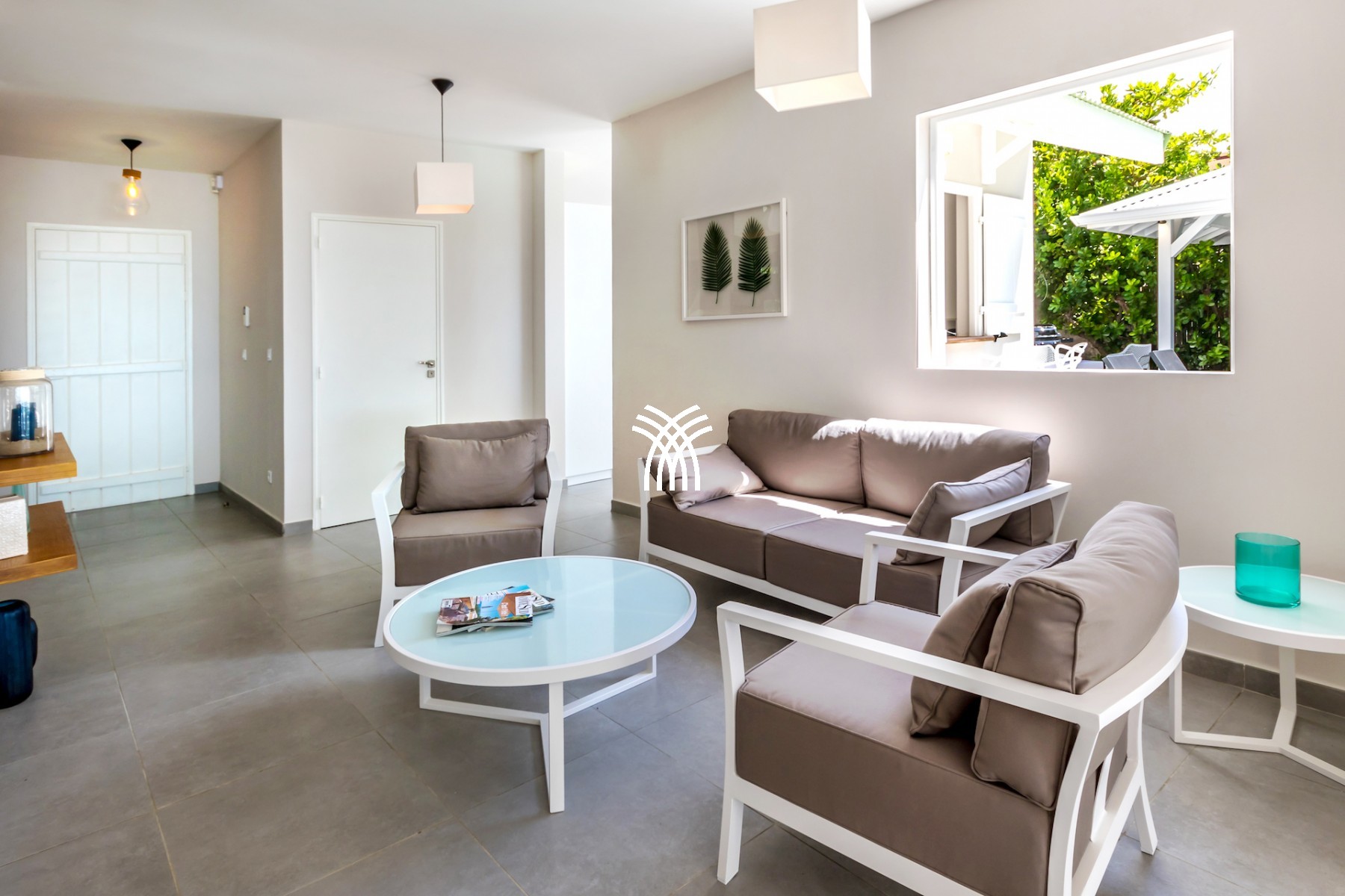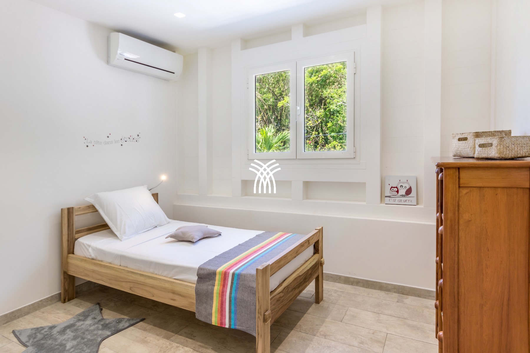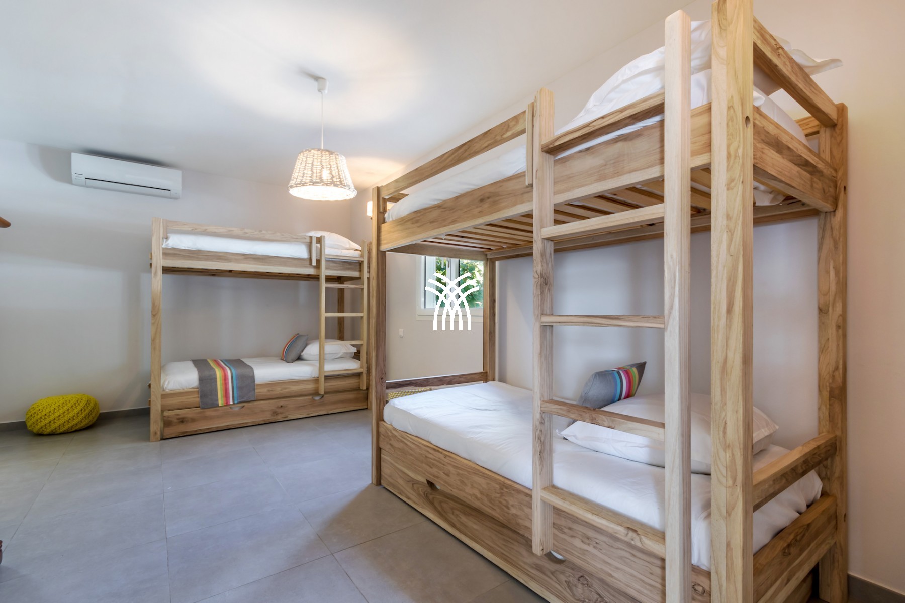 With an area of 220 m², the Villa Bwa Chik can accommodate twelve adults and four children in its six air-conditioned bedrooms, each with a shower room and toilet. Spread over three levels, the bedrooms are elegant and comfortable.