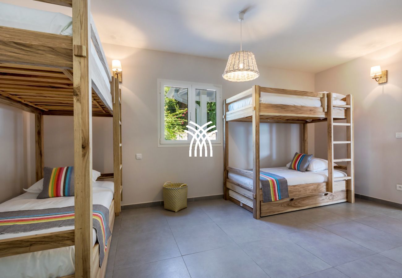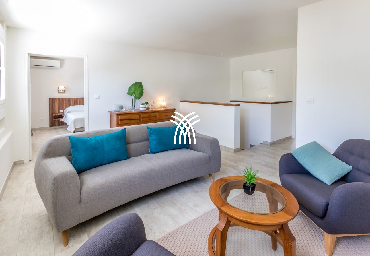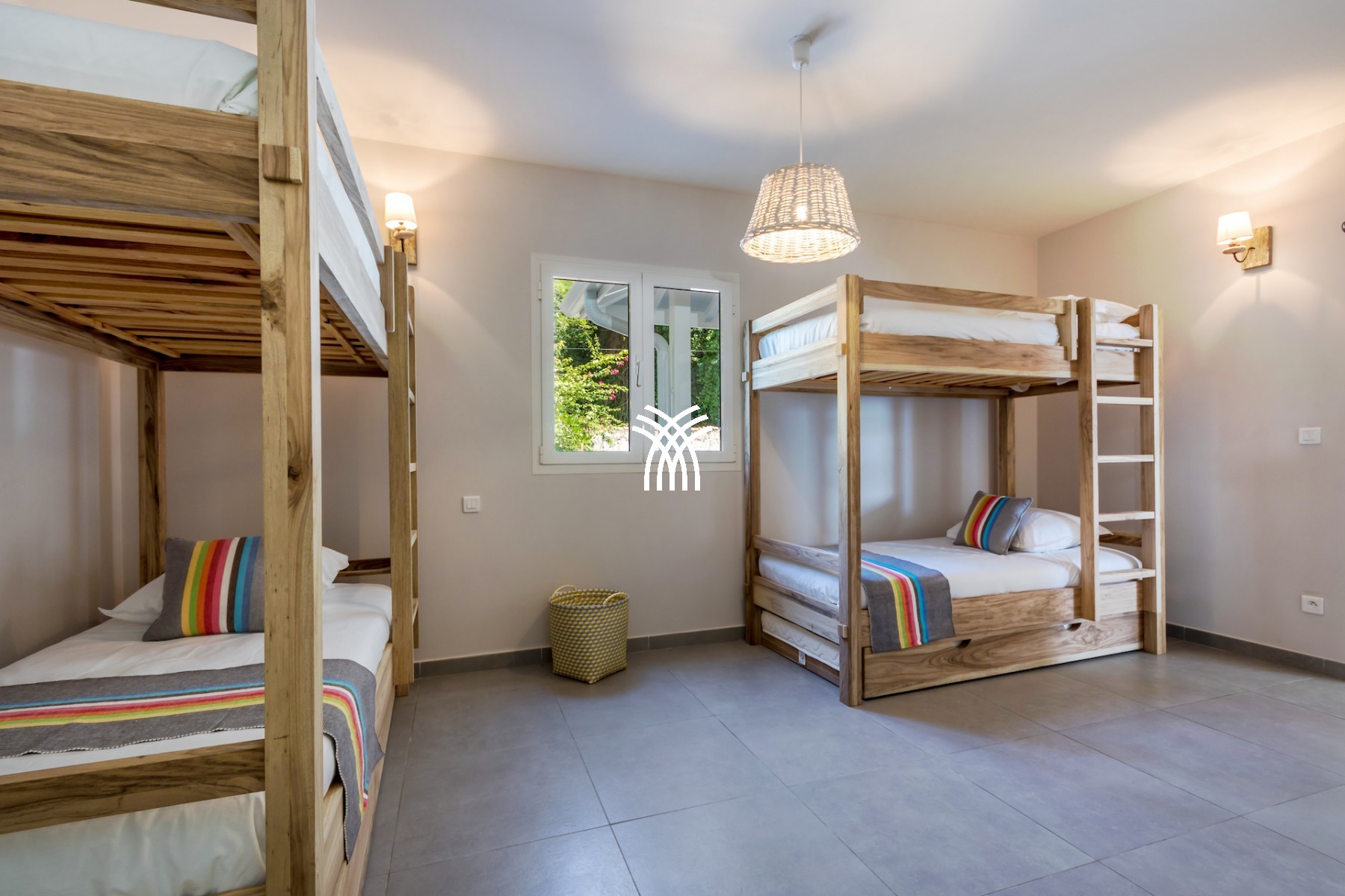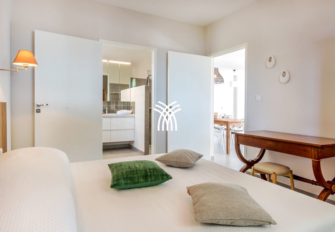 Three bedrooms are located on the terrace level, including two double rooms and one twin room. The master suite, located on the first floor, is spacious and refined. The two other bedrooms are in independent T2 apartments, each with its own living area, a shower room, and a terrace overlooking the pool.