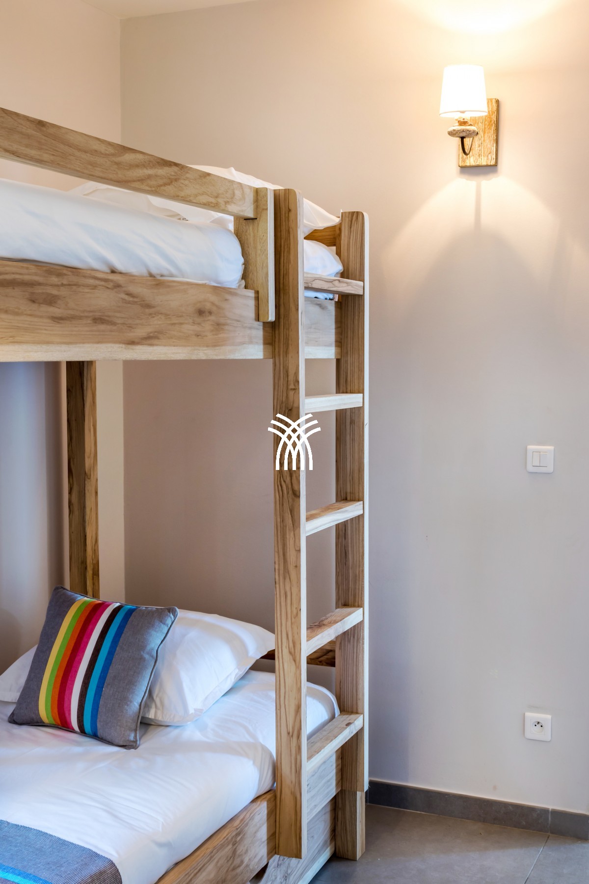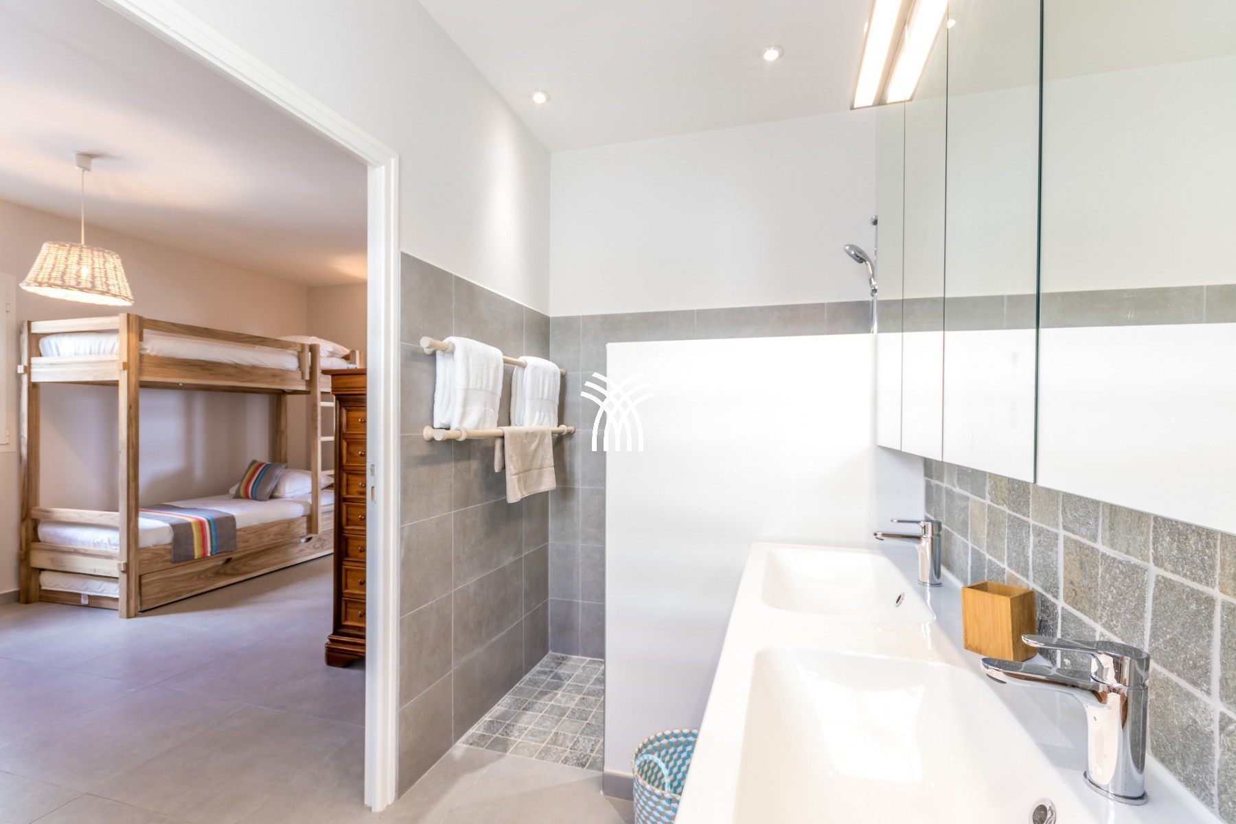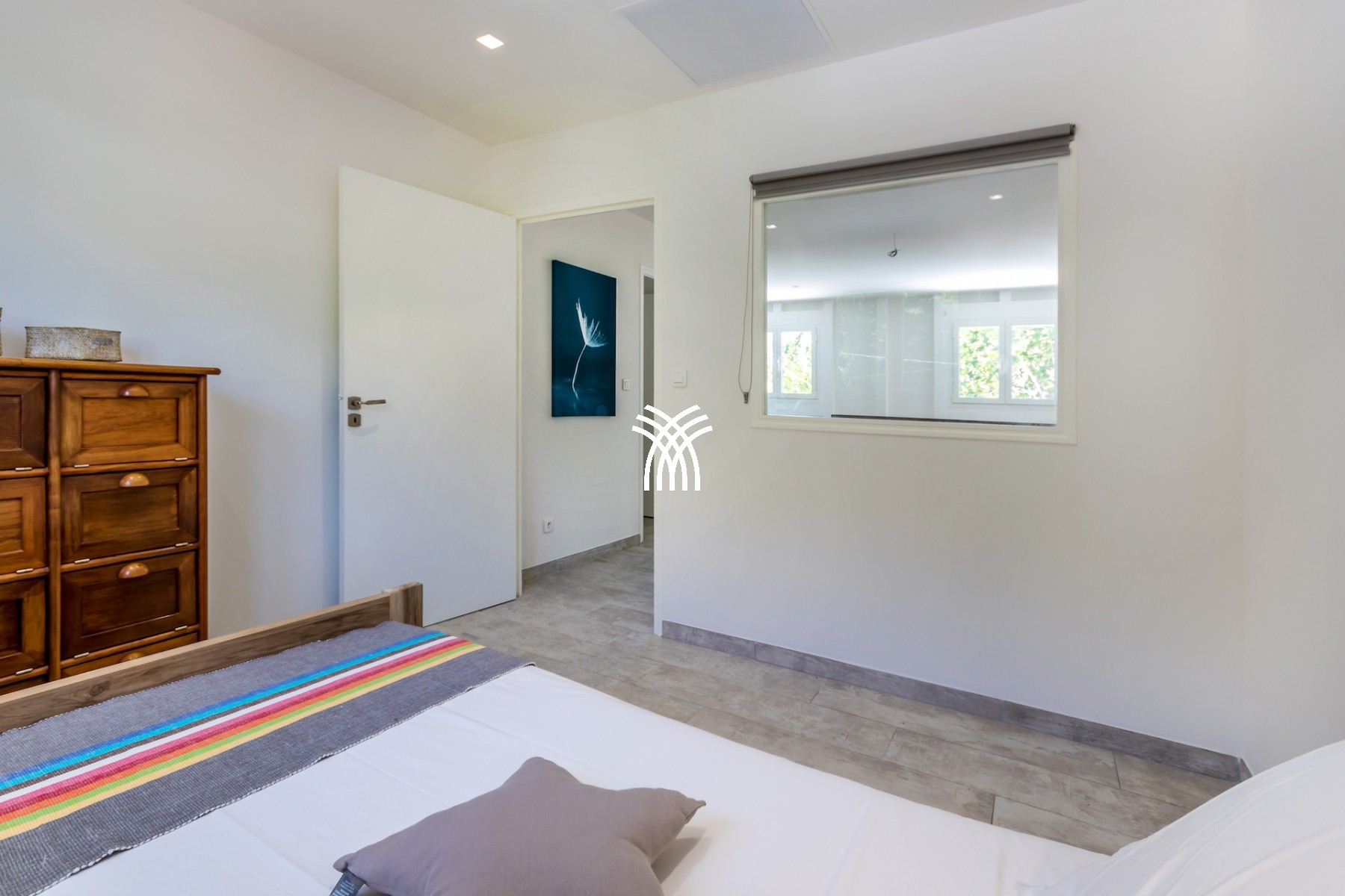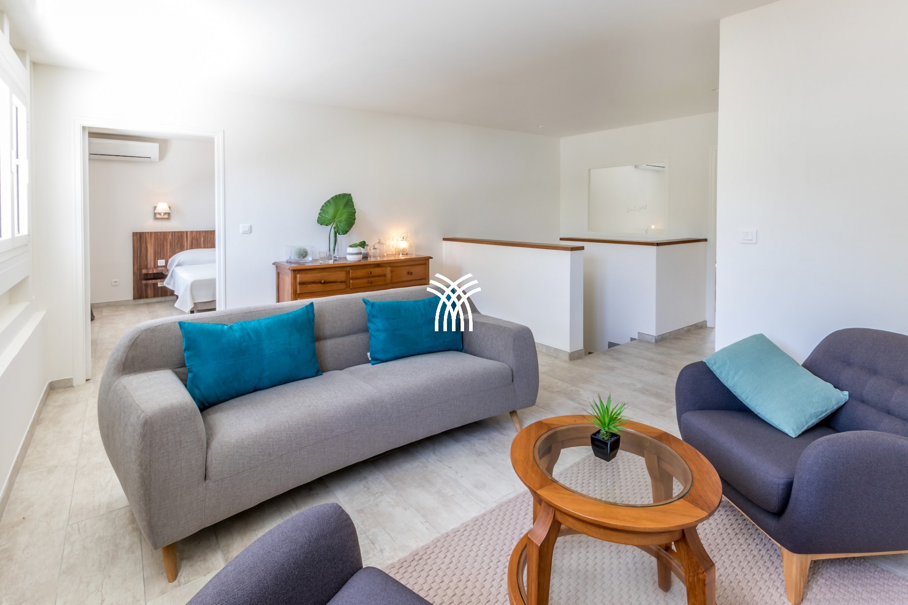 Three bedrooms are located on the terrace level, including two double rooms and one twin room. The master suite, located on the first floor, is spacious and refined. The two other bedrooms are in independent T2 apartments, each with its own living area, a shower room, and a terrace overlooking the pool.