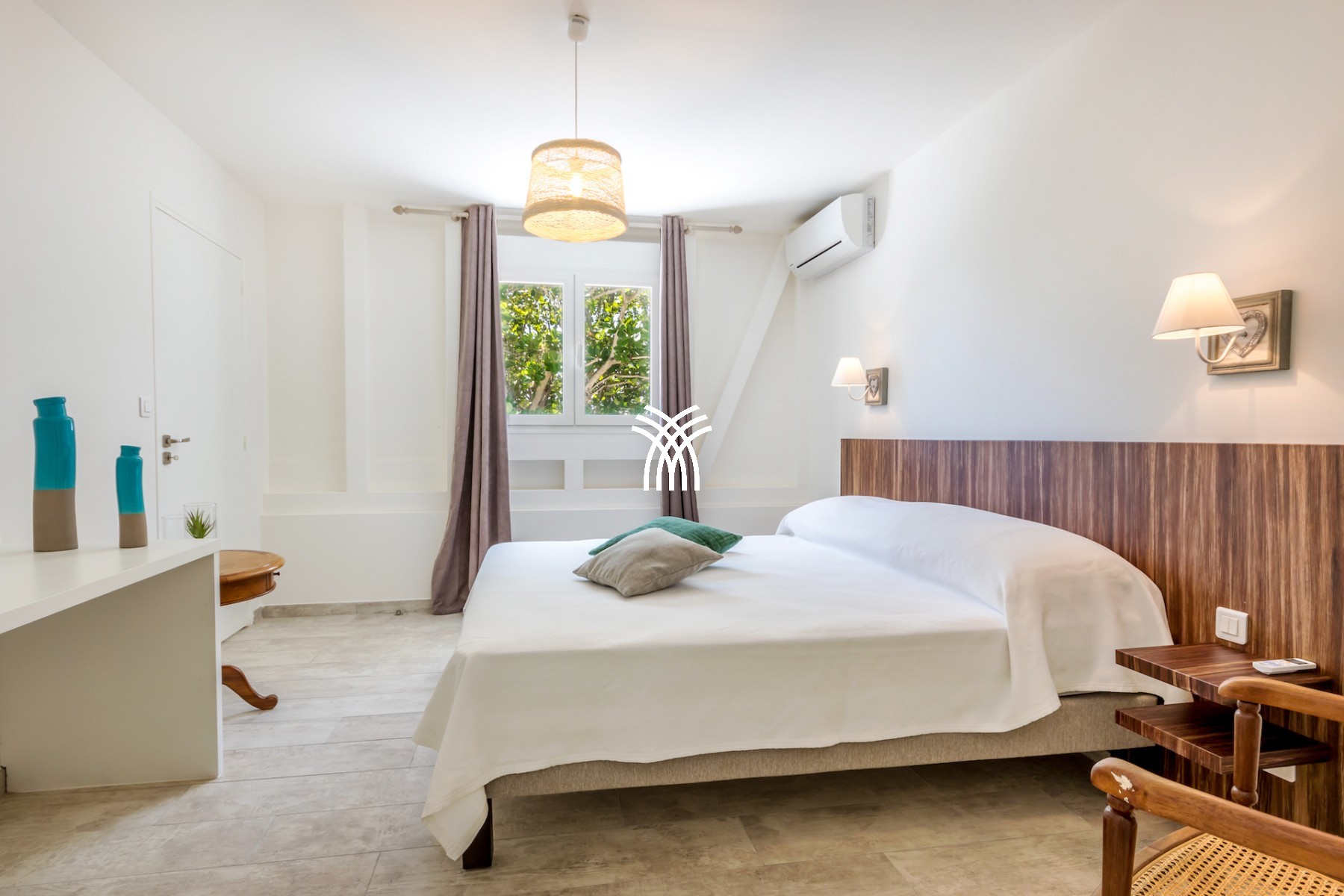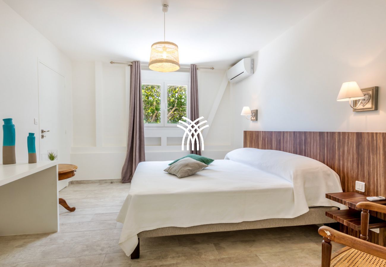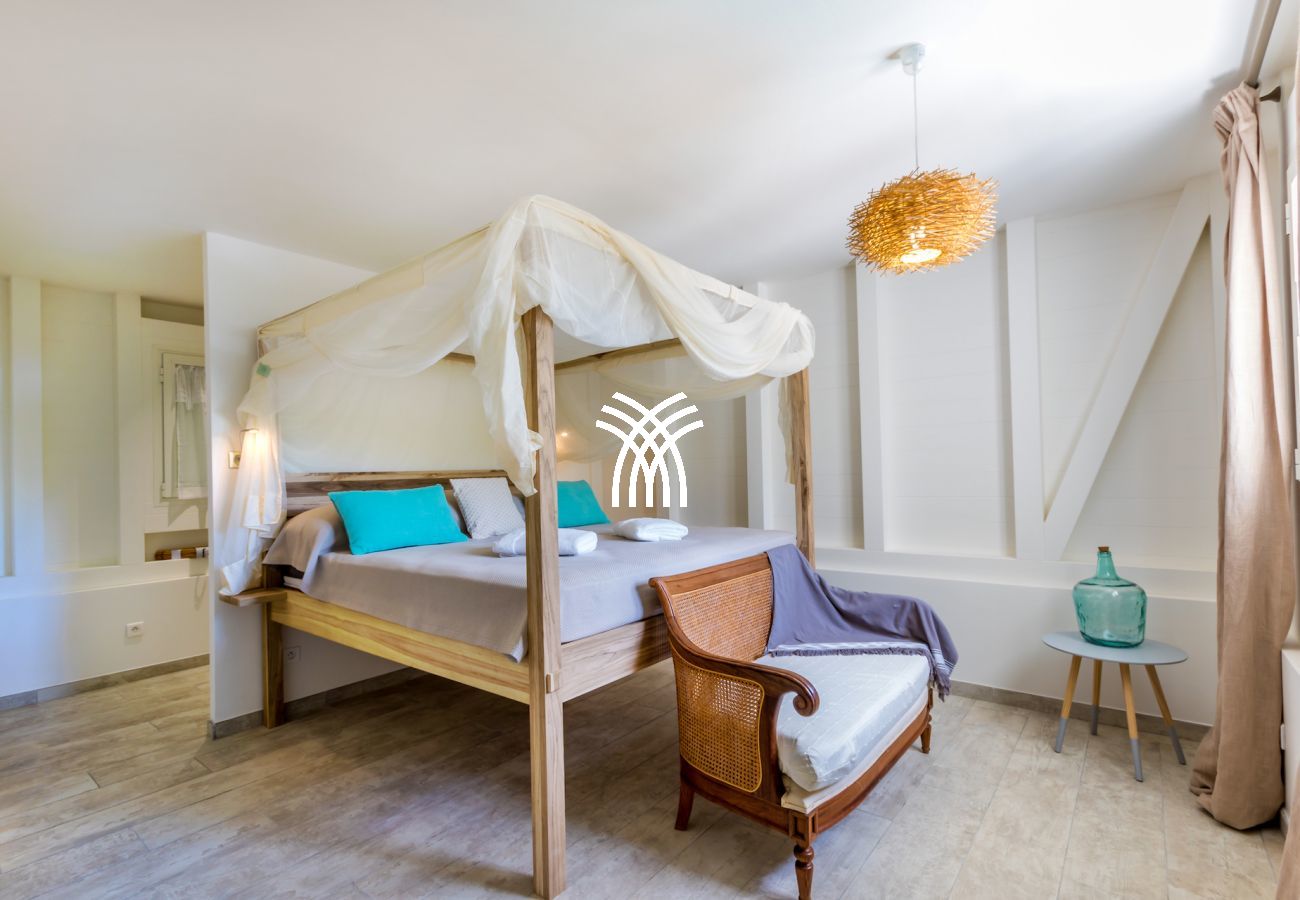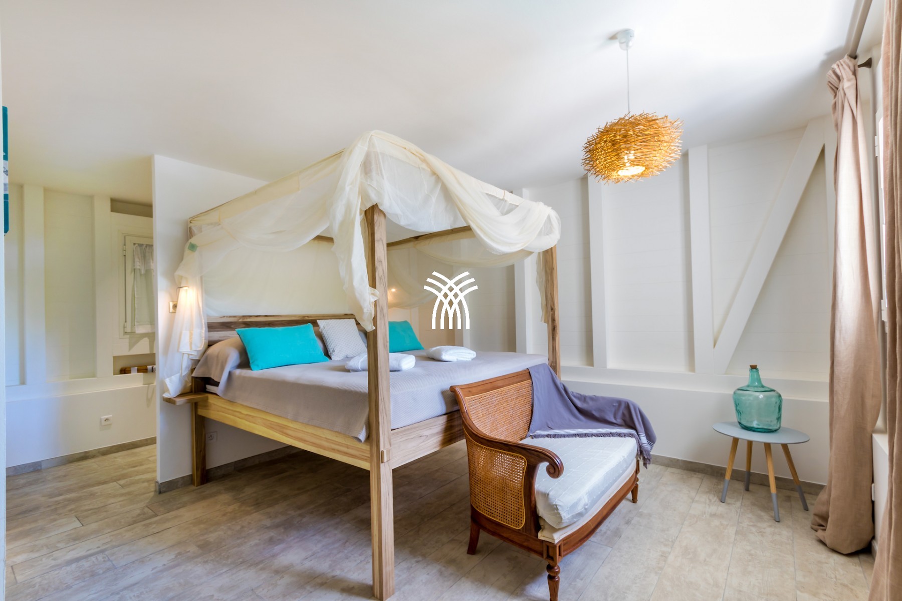 Three bedrooms are located on the terrace level, including two double rooms and one twin room. The master suite, located on the first floor, is spacious and refined. The two other bedrooms are in independent T2 apartments, each with its own living area, a shower room, and a terrace overlooking the pool.