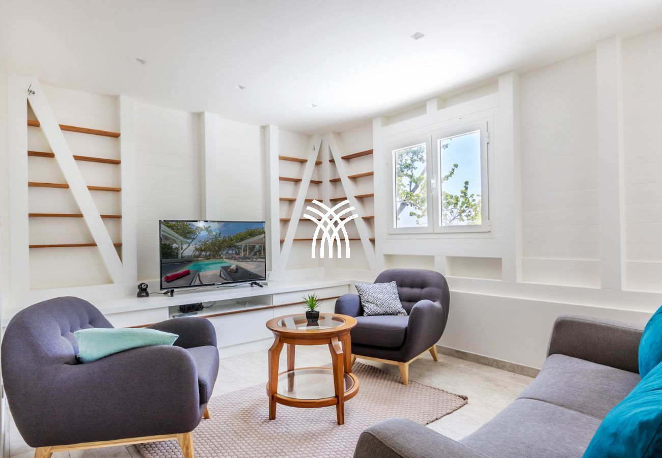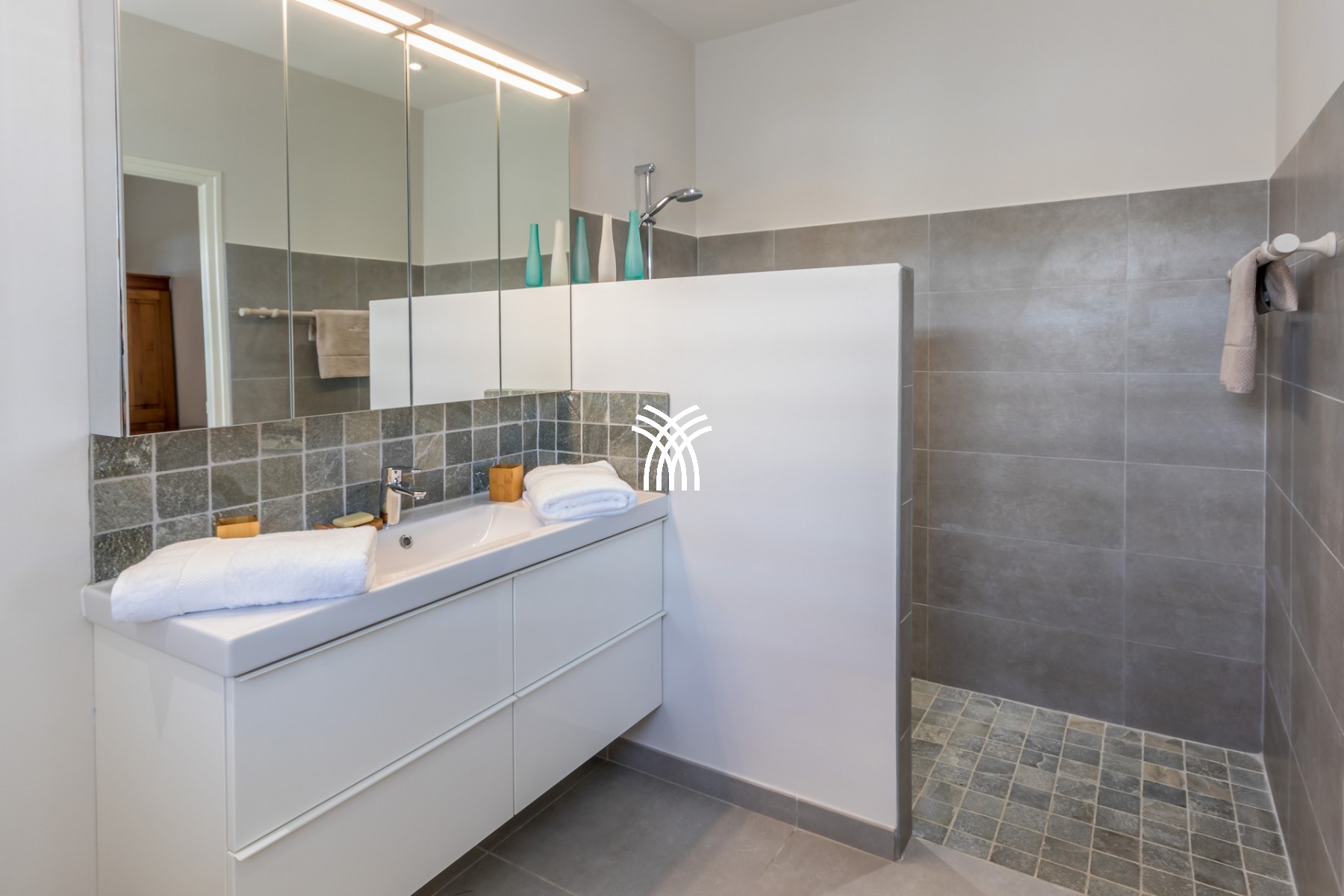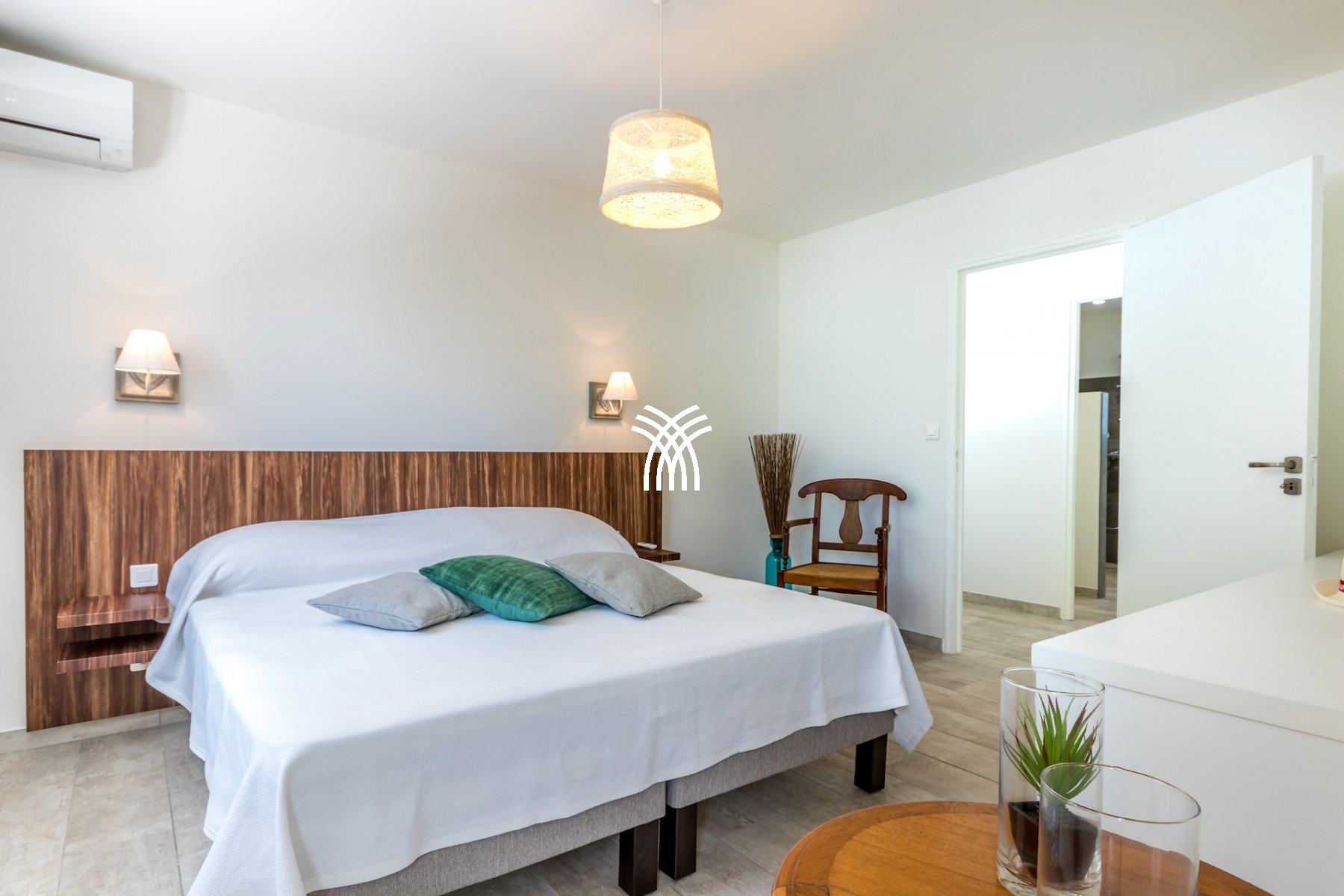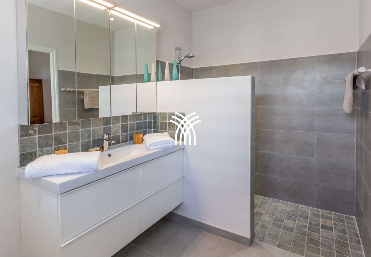 Three bedrooms are located on the terrace level, including two double rooms and one twin room. The master suite, located on the first floor, is spacious and refined. The two other bedrooms are in independent T2 apartments, each with its own living area, a shower room, and a terrace overlooking the pool.