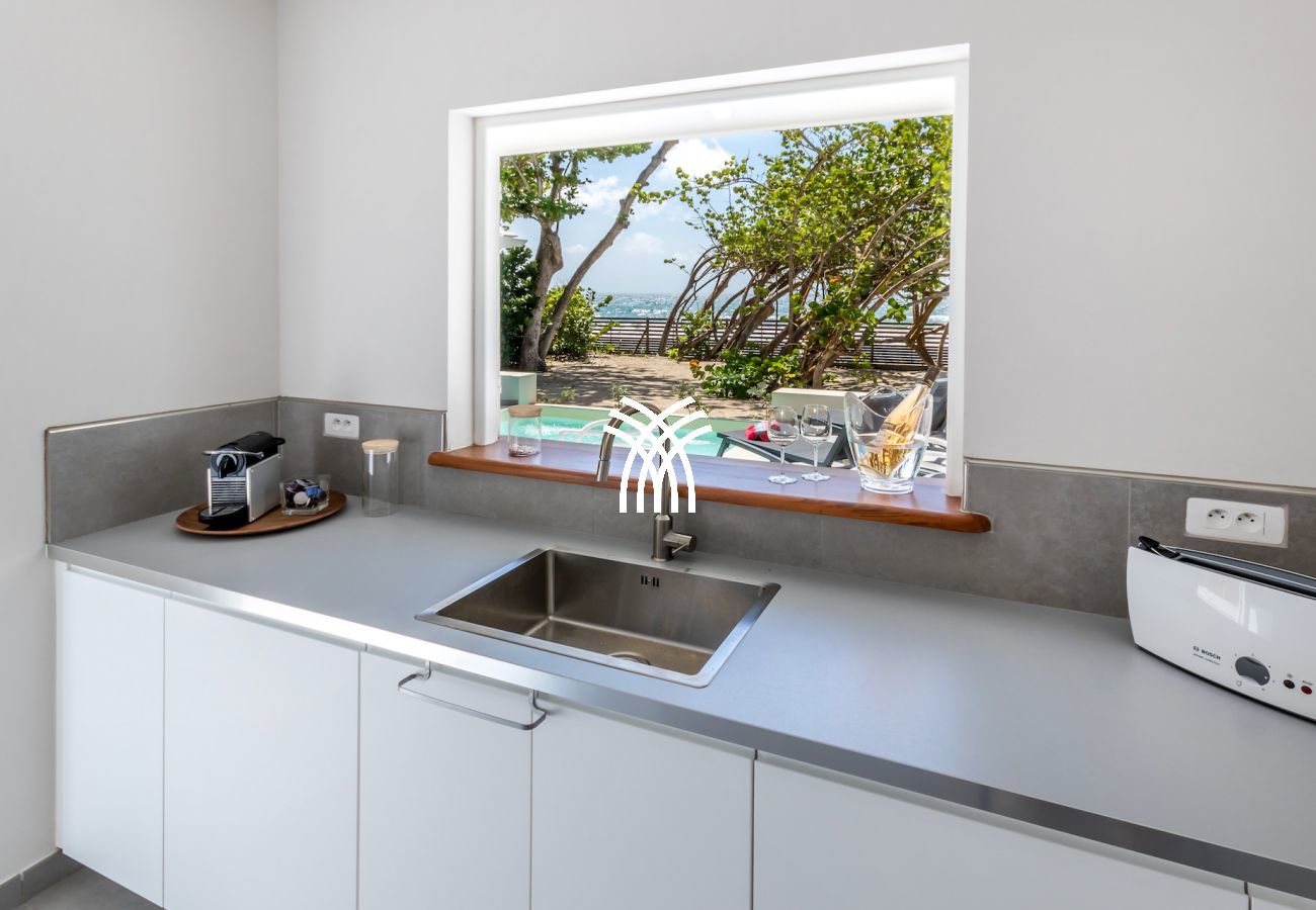 The living room and kitchen merge to create a friendly living space open to the outside. This space allows you to enjoy a relaxing view of the tropical garden and the famous Diamond Rock, also known as the "Lying Woman". In the living room, you'll find a plush sofa, comfortable armchairs, a coconut rug, a wooden coffee table, and a television, creating a place conducive to relaxation. The modern kitchen is fully equipped to meet all your culinary needs, with a bar and stools for convivial moments.