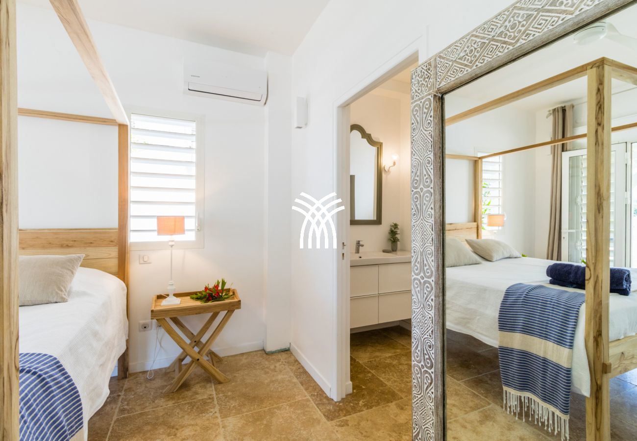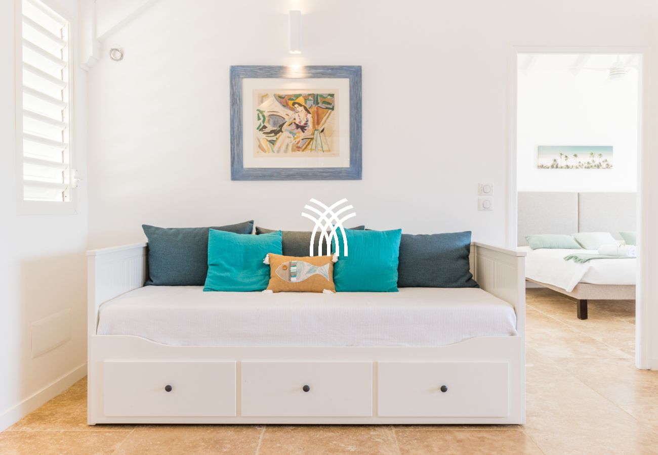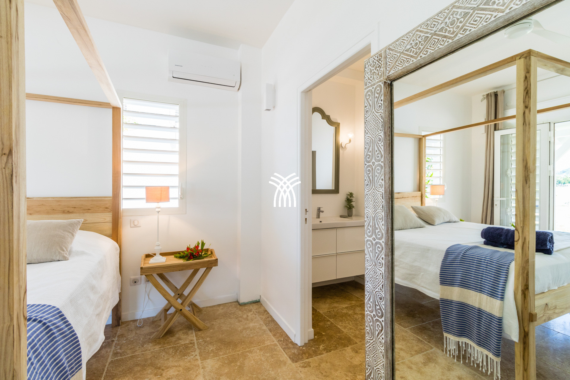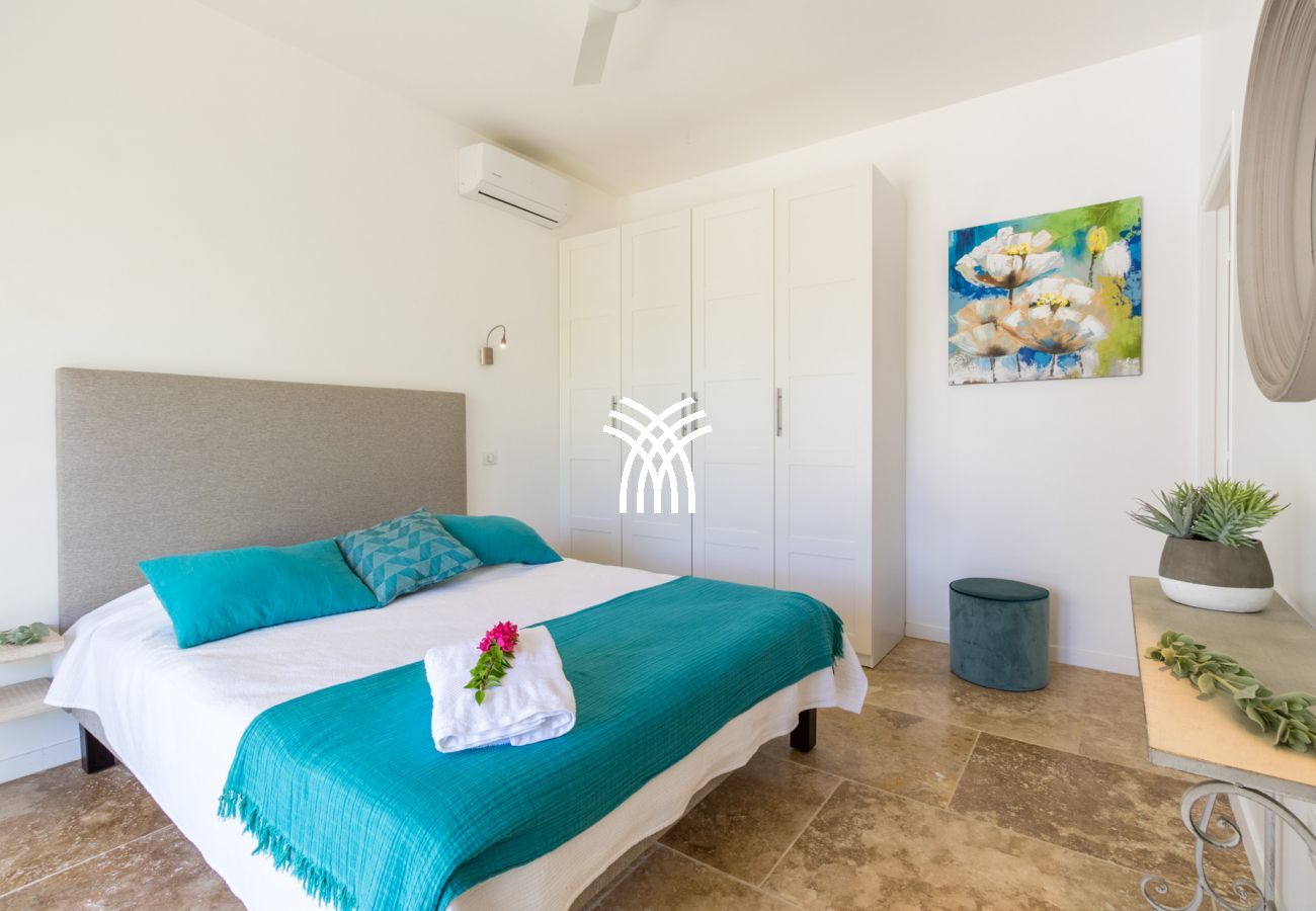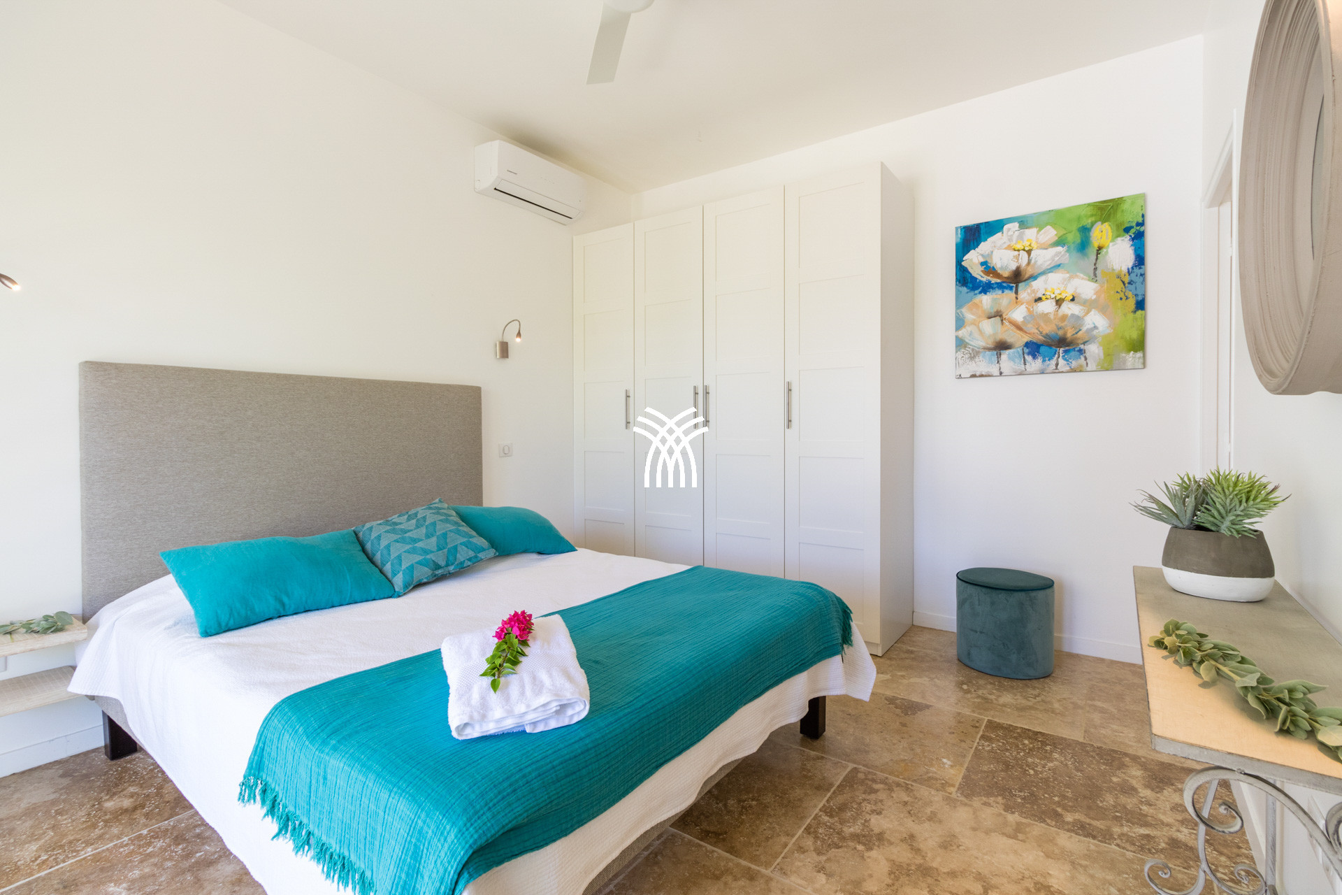 The complete equipment of Villa Alice Bay will satisfy your needs: its design and clean lines, quality materials, a real architect's villa! Built of 2 units, the villa offers a main house (10 guests) with 4 air-conditioned bedrooms, 4 ensuite bathrooms, a cinema room, an air-conditioned office also serving as a bedroom for children / teens (with wifi printer), a storeroom and a large patio. A recently renovated cottage (4 guests) next to the main villa, has 2 bedrooms with their ensuite bathroom, a kitchen, a small living room, a shaded terrace and an outdoor shower.