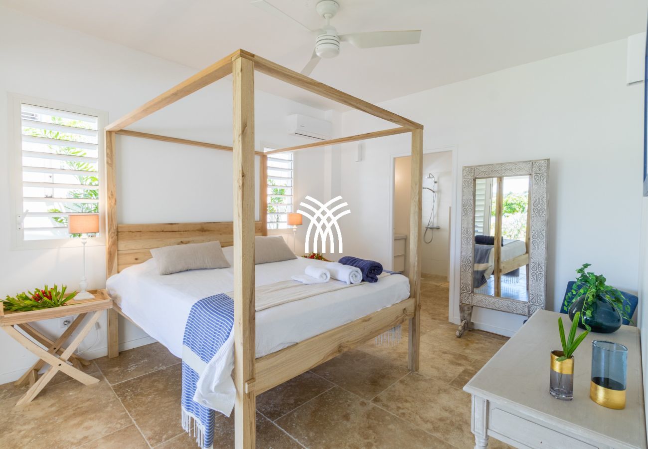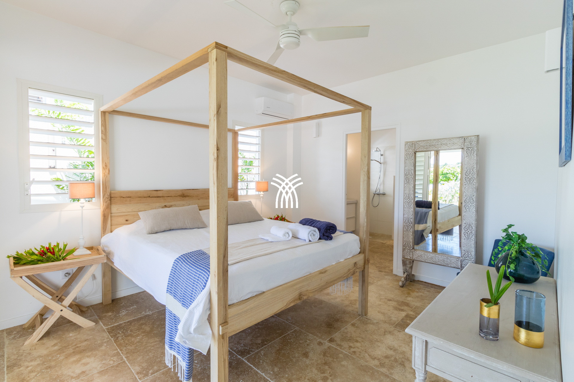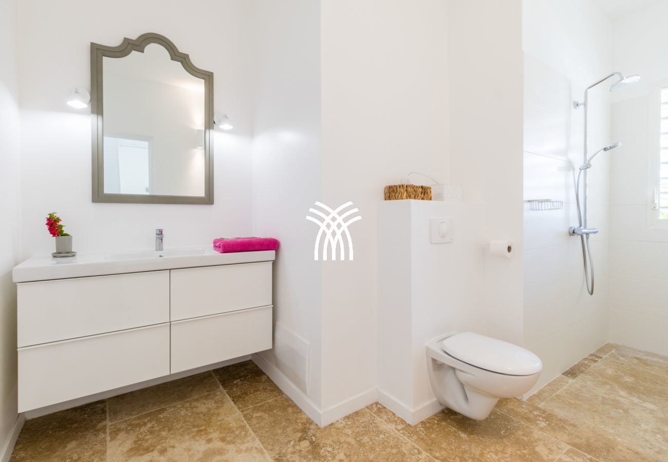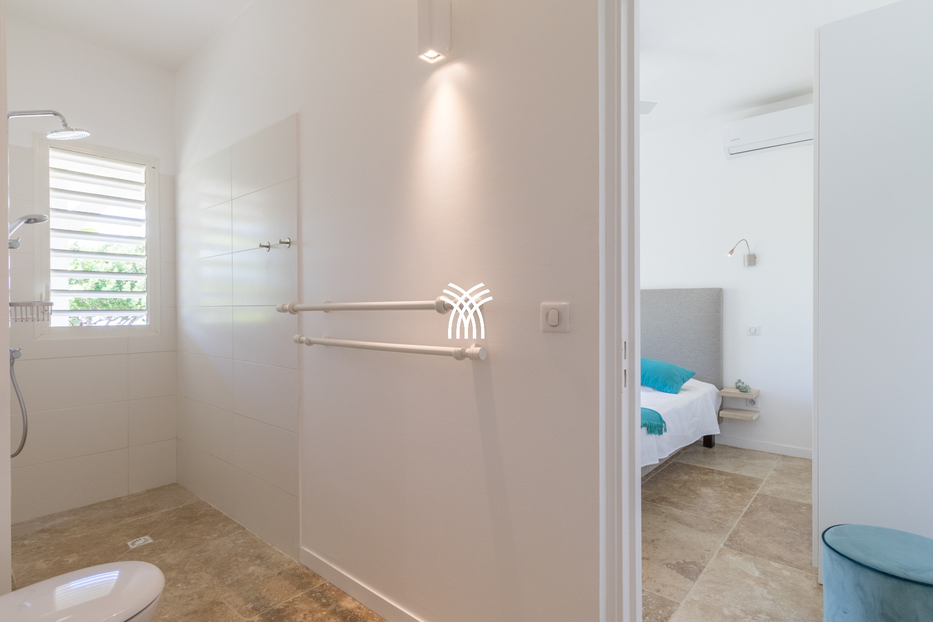 The complete equipment of Villa Alice Bay will satisfy your needs: its design and clean lines, quality materials, a real architect's villa! Built of 2 units, the villa offers a main house (10 guests) with 4 air-conditioned bedrooms, 4 ensuite bathrooms, a cinema room, an air-conditioned office also serving as a bedroom for children / teens (with wifi printer), a storeroom and a large patio. A recently renovated cottage (4 guests) next to the main villa, has 2 bedrooms with their ensuite bathroom, a kitchen, a small living room, a shaded terrace and an outdoor shower.