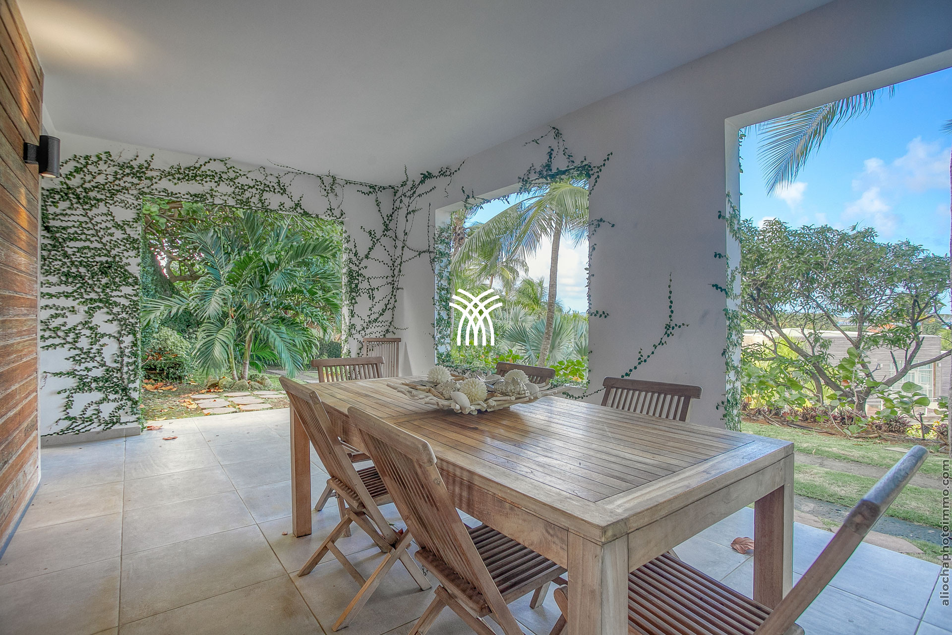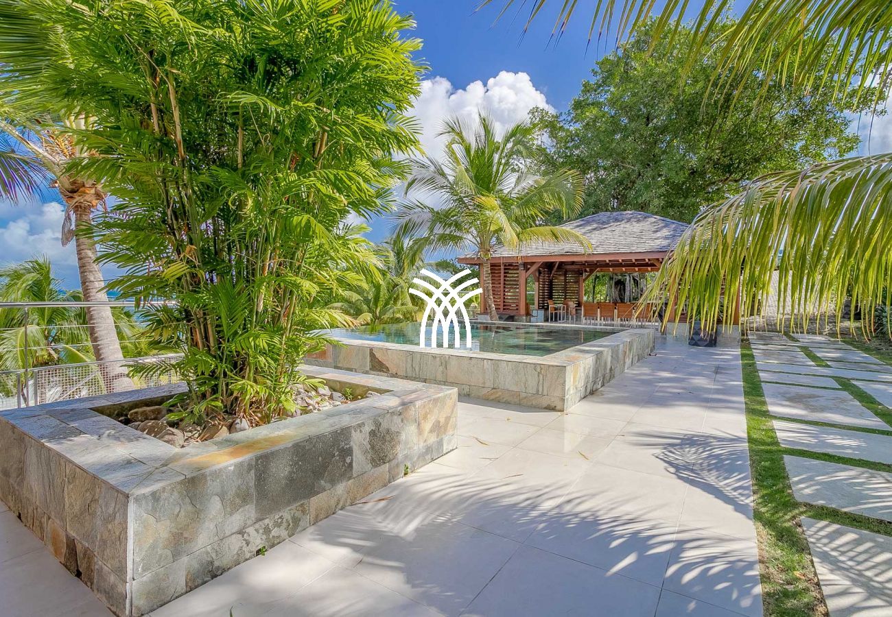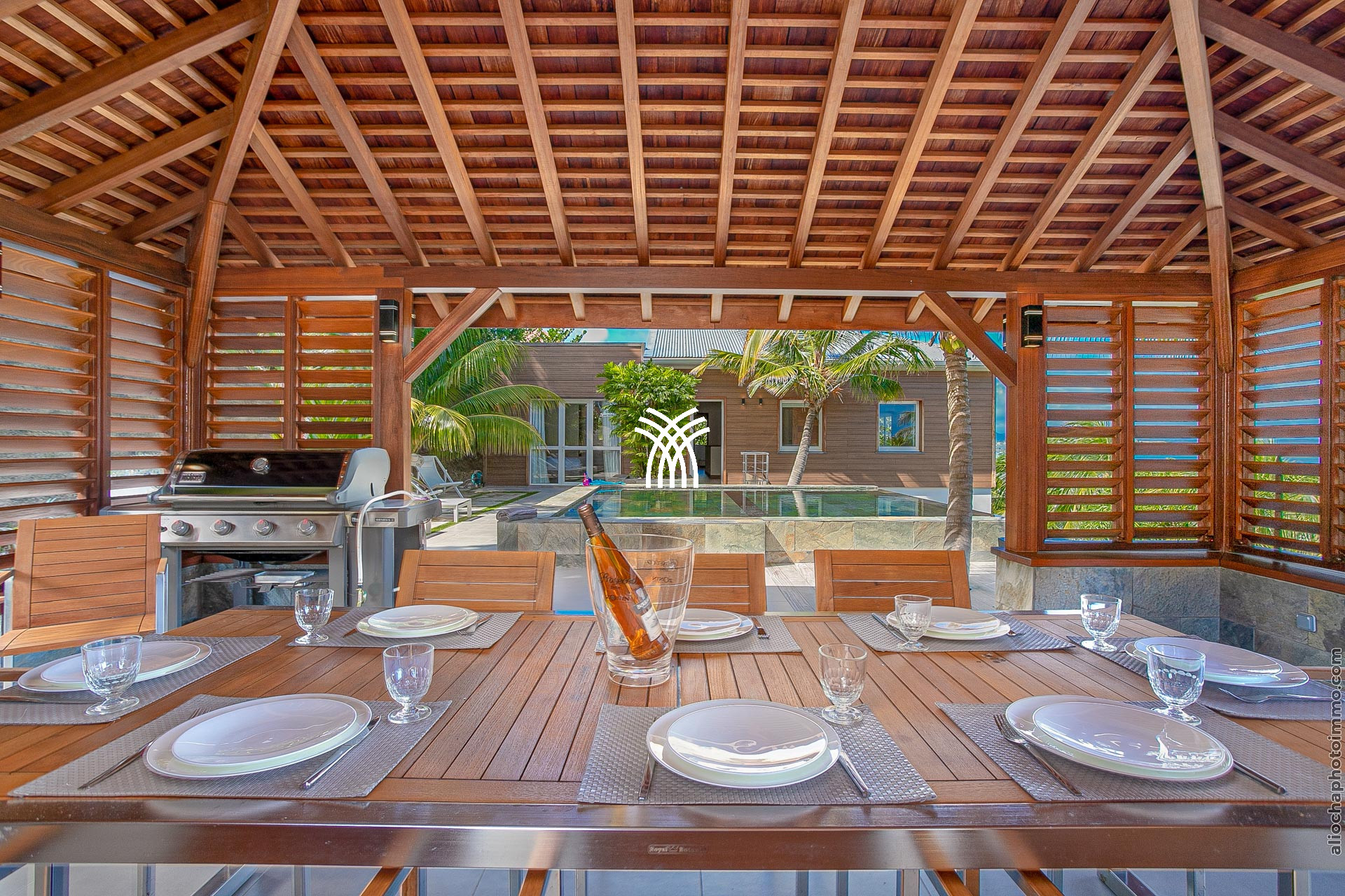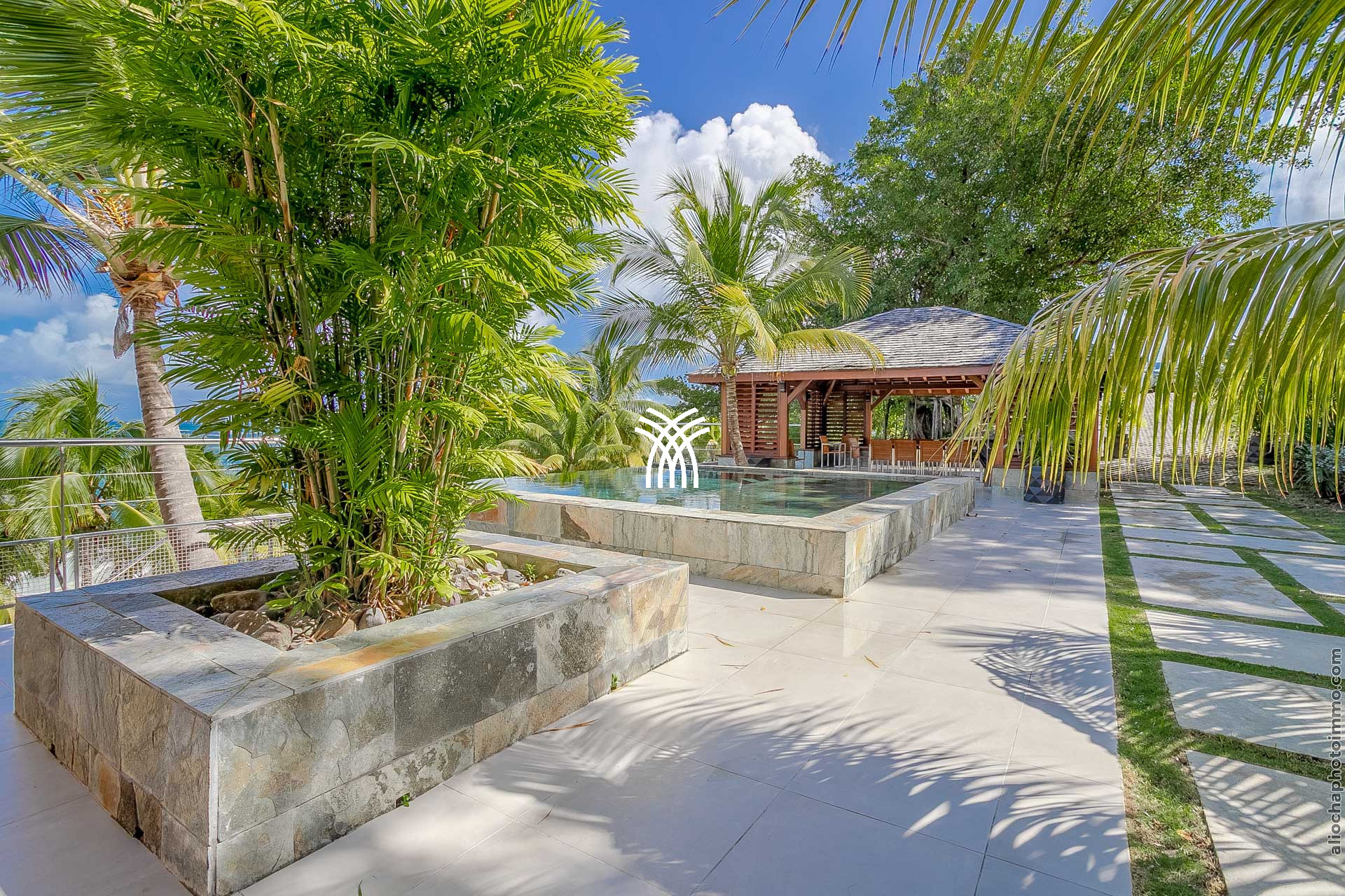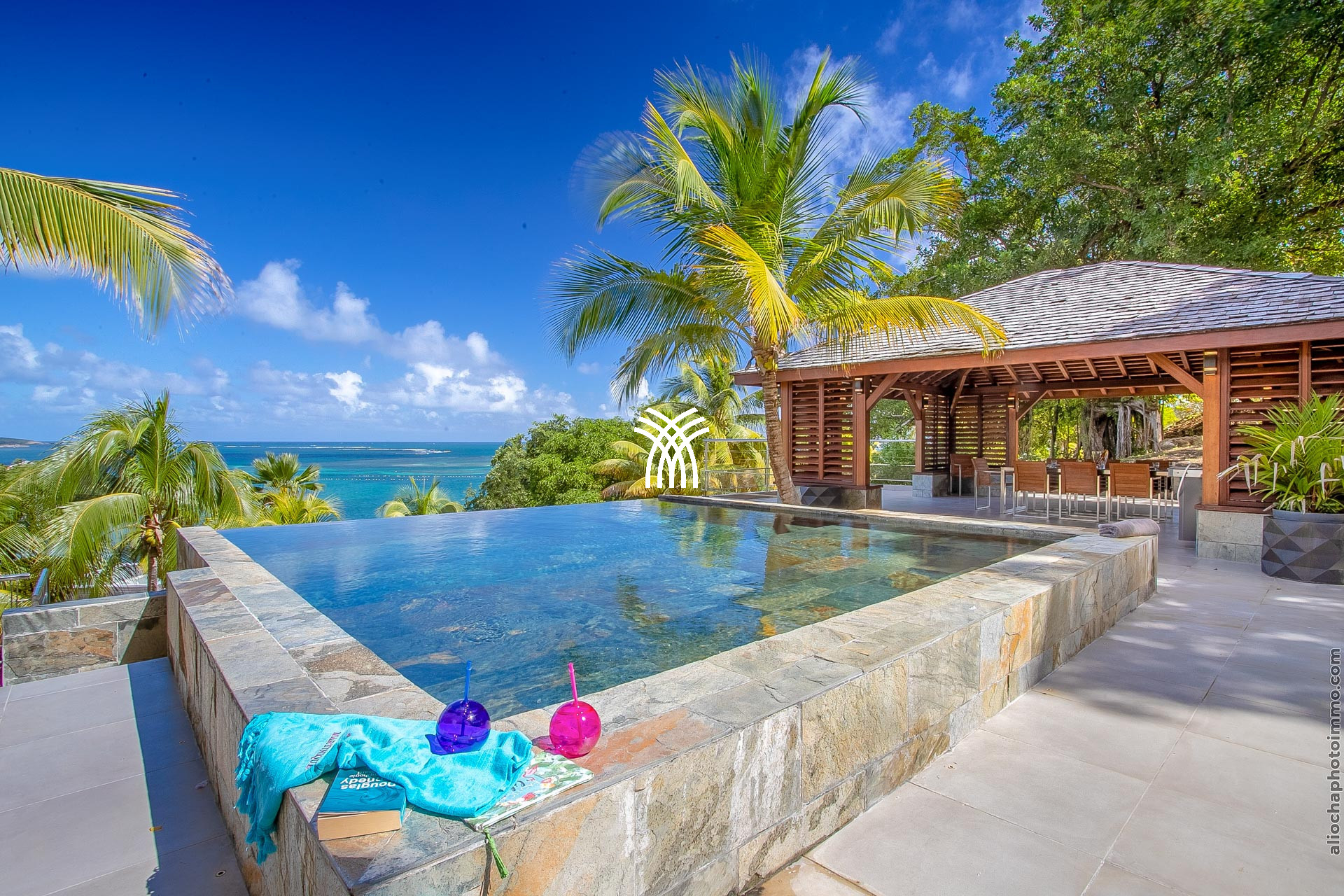 Outside, Villa Coraly offers several relaxation areas. The infinity pool, surrounded by sun loungers, is an ideal place to recharge. Two garden lounges overlook the sea, perfect for enjoying an aperitif while admiring the view. A large outdoor table, located under a carbet, allows meals to be taken in the shade while enjoying the panorama of the lagoon.