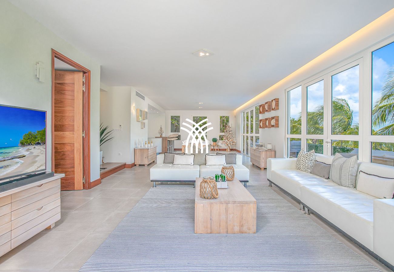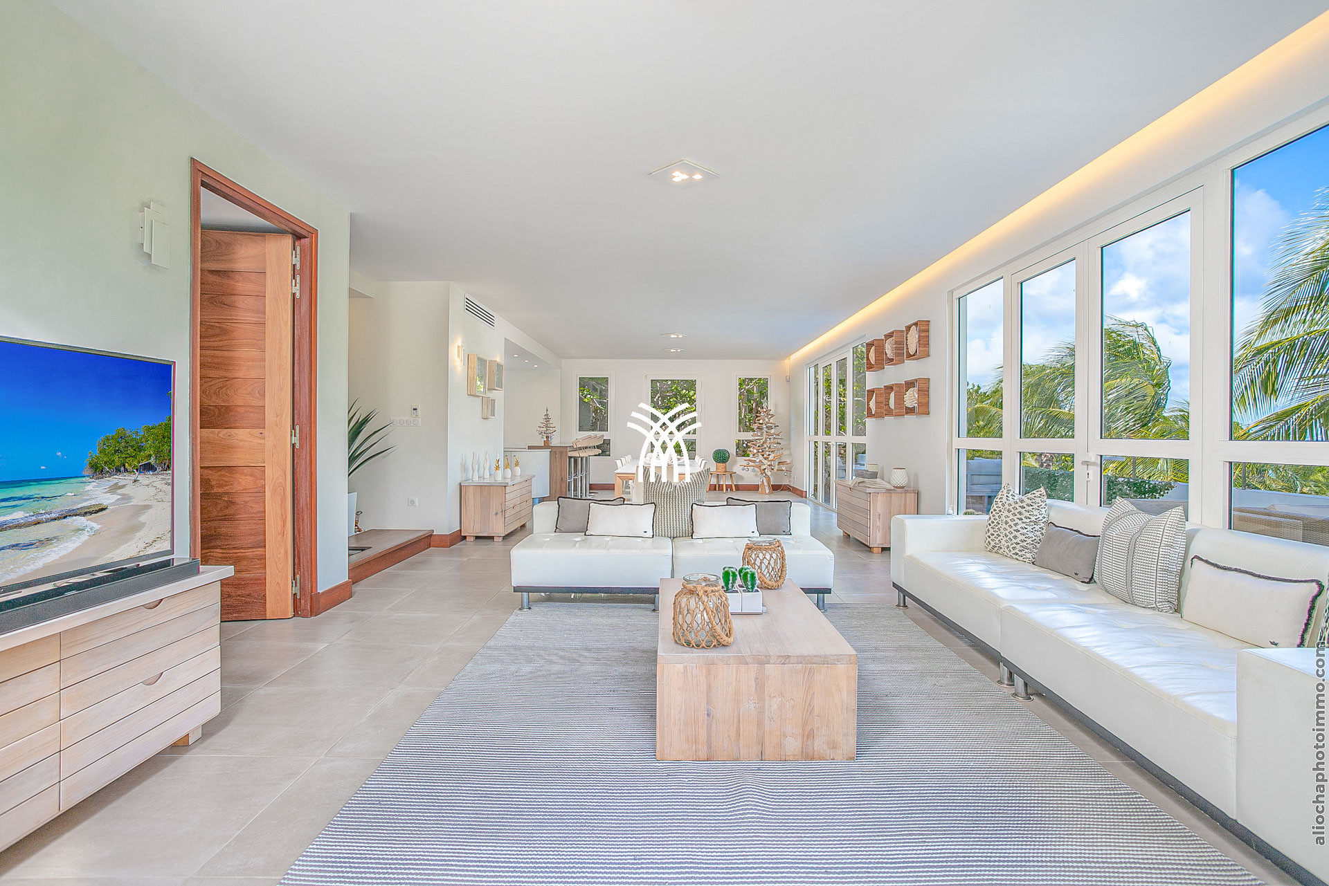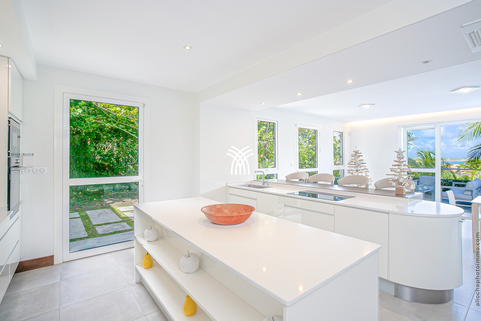 Villa Coraly stands out for its modern architecture and clean lines. The open-plan living spaces, bathed in natural light, offer areas dedicated to relaxation and sharing, ensuring restful holidays. The tastefully decorated living room is equipped with two white sofas that accentuate the soft and relaxing atmosphere of the room. The dining room, with its lacquered table, invites convivial meals while enjoying the breathtaking ocean view. The open kitchen is fully equipped, with a wooden bar that adds a warm and friendly touch.