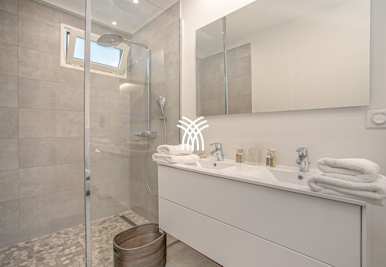 The villa has seven bedrooms, including one on the ground floor, offering a 160x200 bed and a large bay window with sea view. This room benefits from a desk area and a private shower room. Upstairs, four other bedrooms, elegantly decorated, are equipped with large bay windows. The master suite, with its 200x200 bed and sofa bed for children, has two walk-in closets and a private shower room. Two additional rooms are equipped with 90x200 beds and also have private shower rooms, with views of the pool and garden. A final upstairs bedroom has a 140x190 bed and a garden view. Finally, two interconnecting rooms on the ground floor are equipped with 90x200 beds and offer direct access to the terrace with sea view.