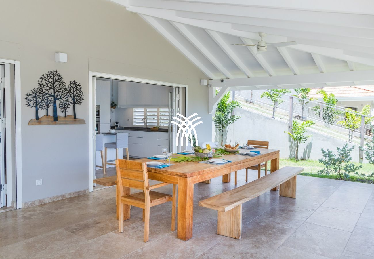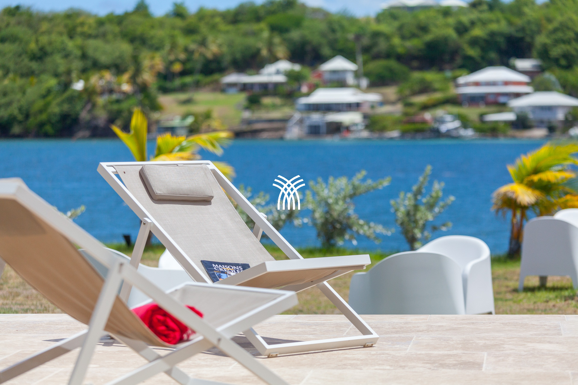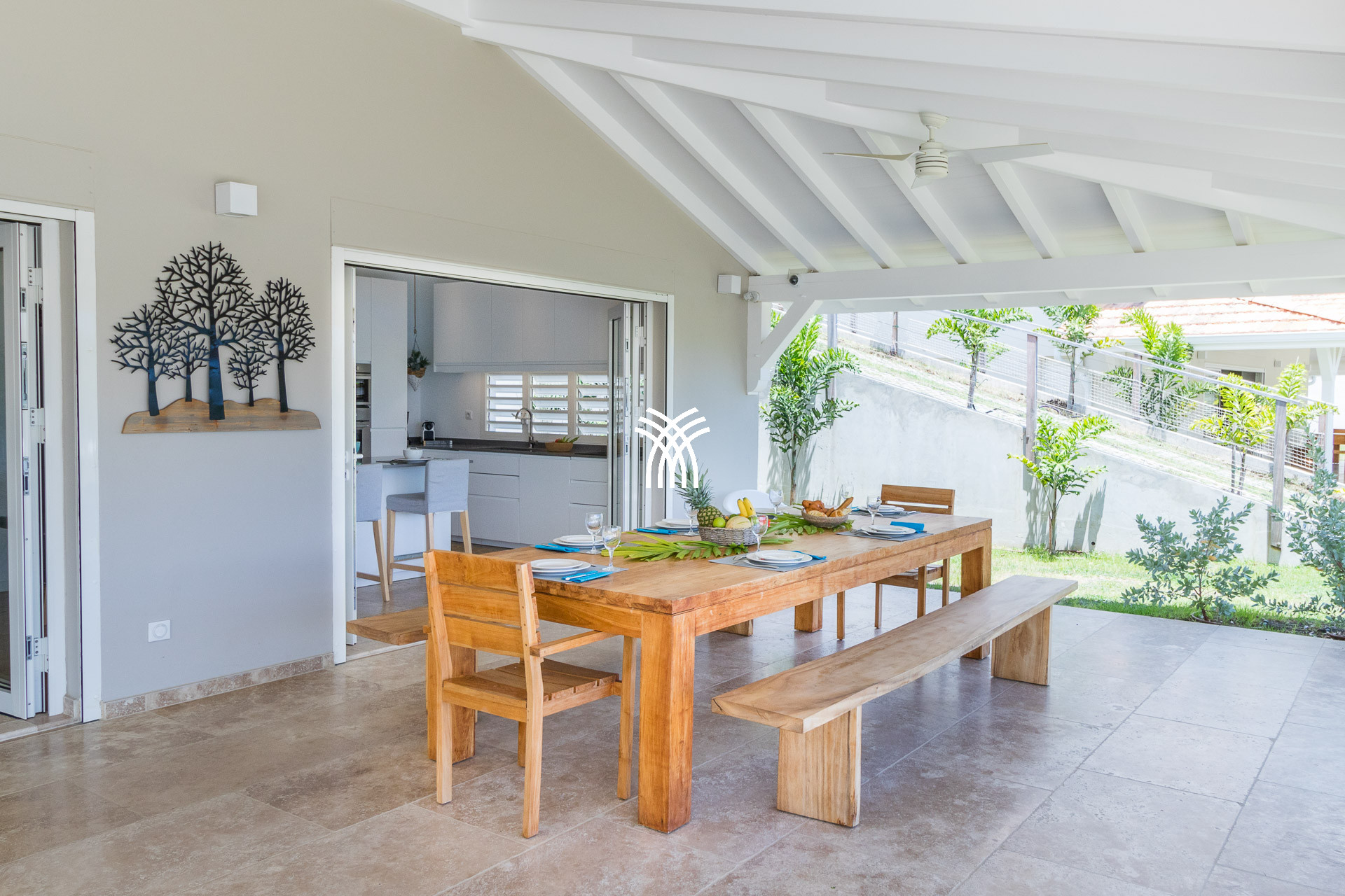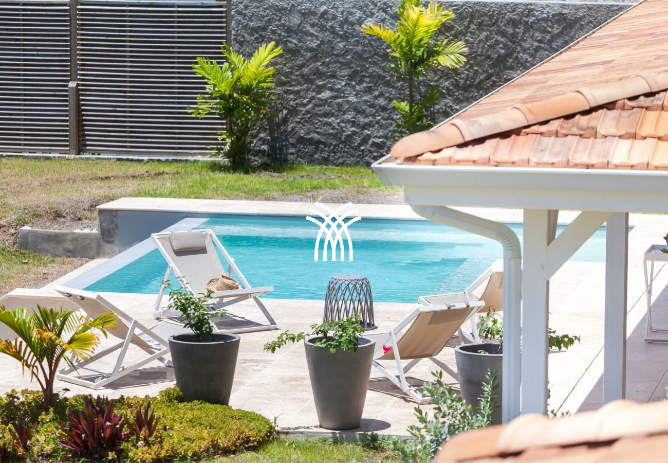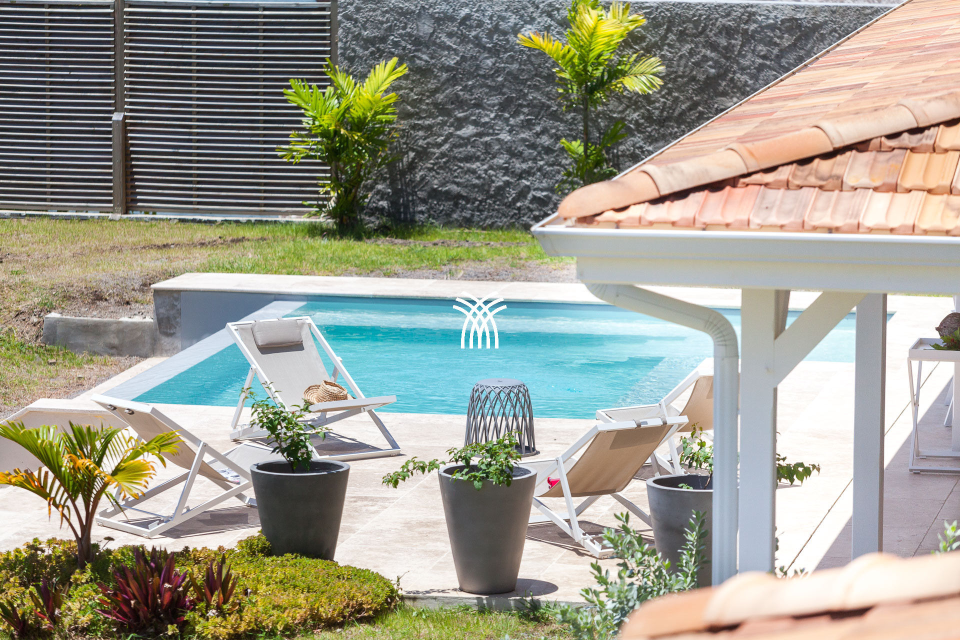 Outside, Villa Coraly offers several relaxation areas. The infinity pool, surrounded by sun loungers, is an ideal place to recharge. Two garden lounges overlook the sea, perfect for enjoying an aperitif while admiring the view. A large outdoor table, located under a carbet, allows meals to be taken in the shade while enjoying the panorama of the lagoon.
