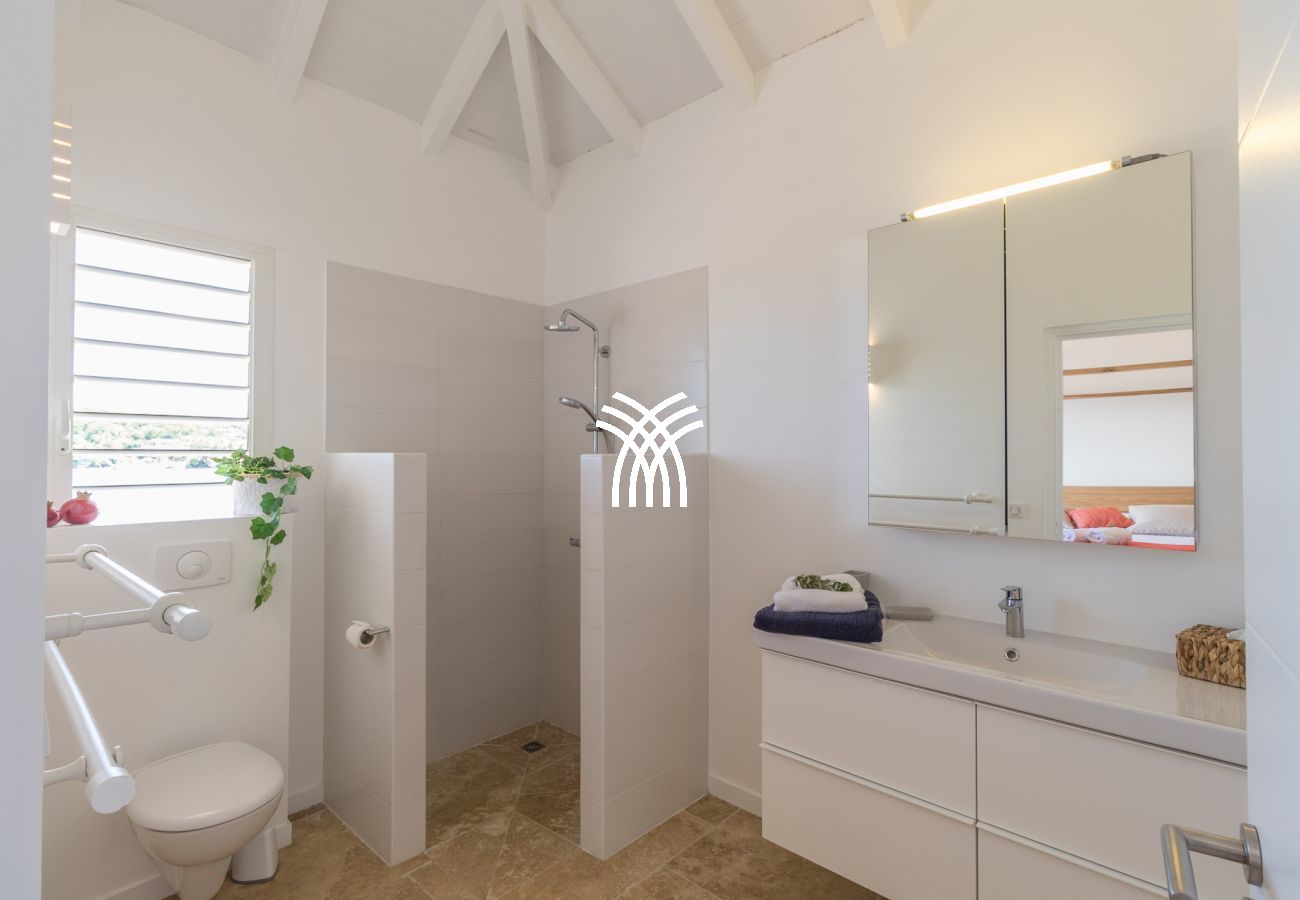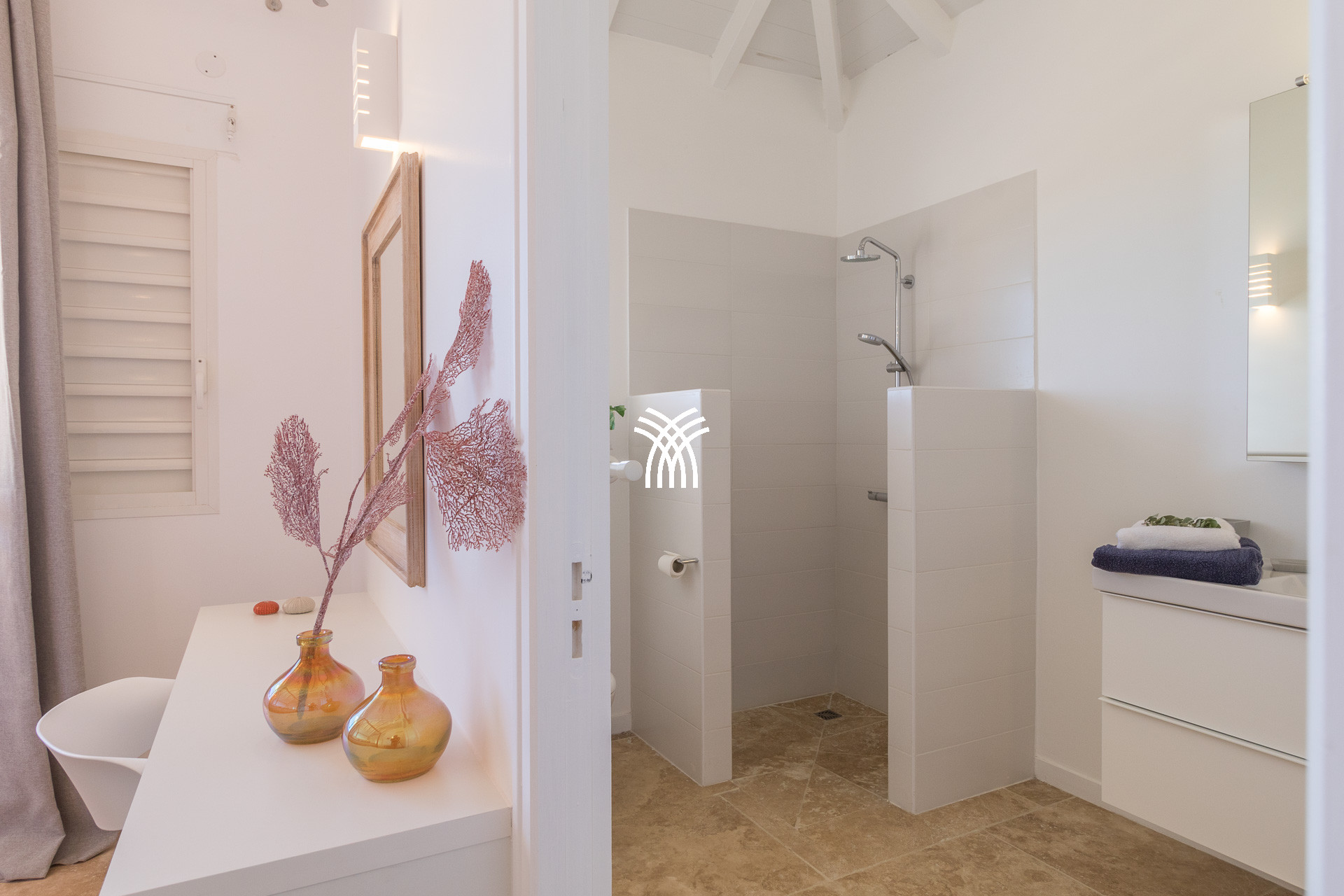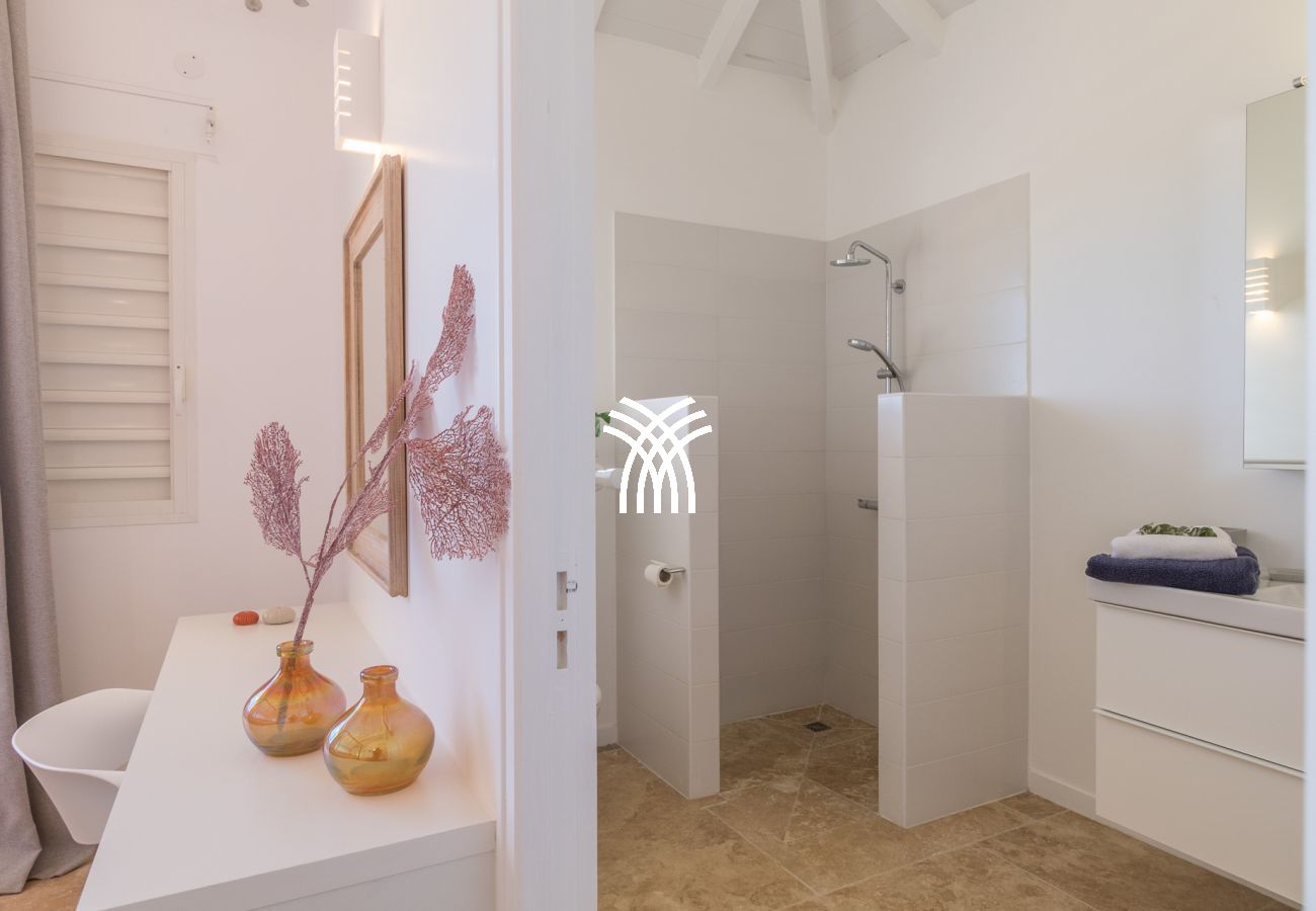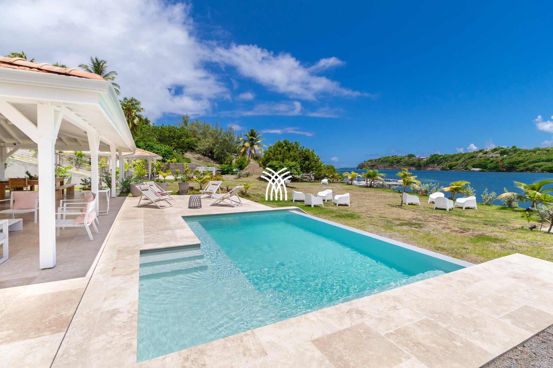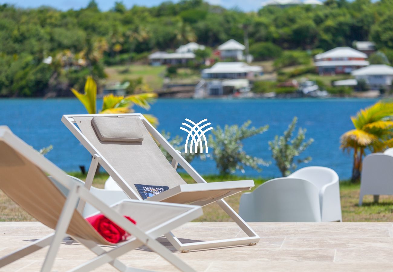 Outside, Villa Coraly offers several relaxation areas. The infinity pool, surrounded by sun loungers, is an ideal place to recharge. Two garden lounges overlook the sea, perfect for enjoying an aperitif while admiring the view. A large outdoor table, located under a carbet, allows meals to be taken in the shade while enjoying the panorama of the lagoon.