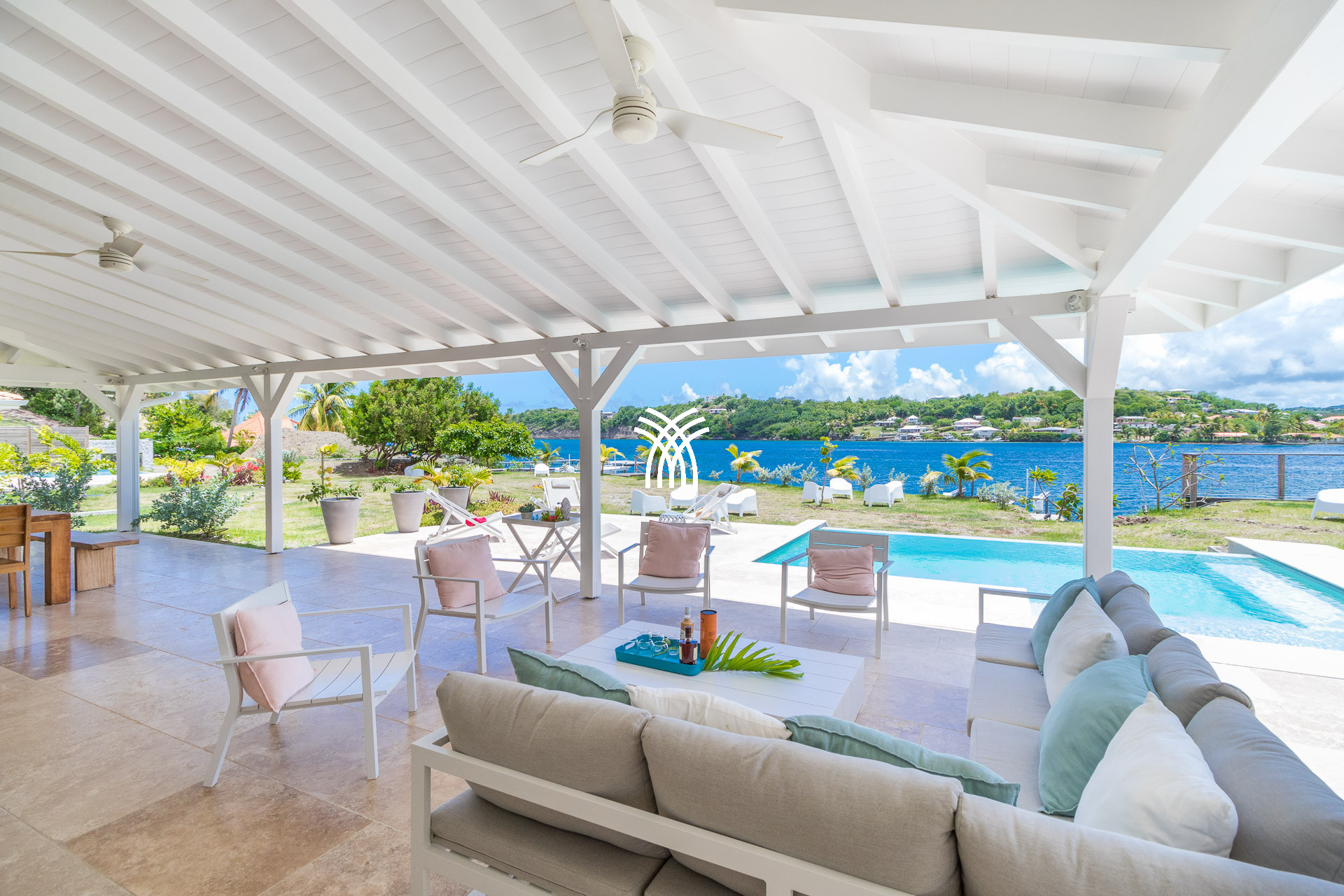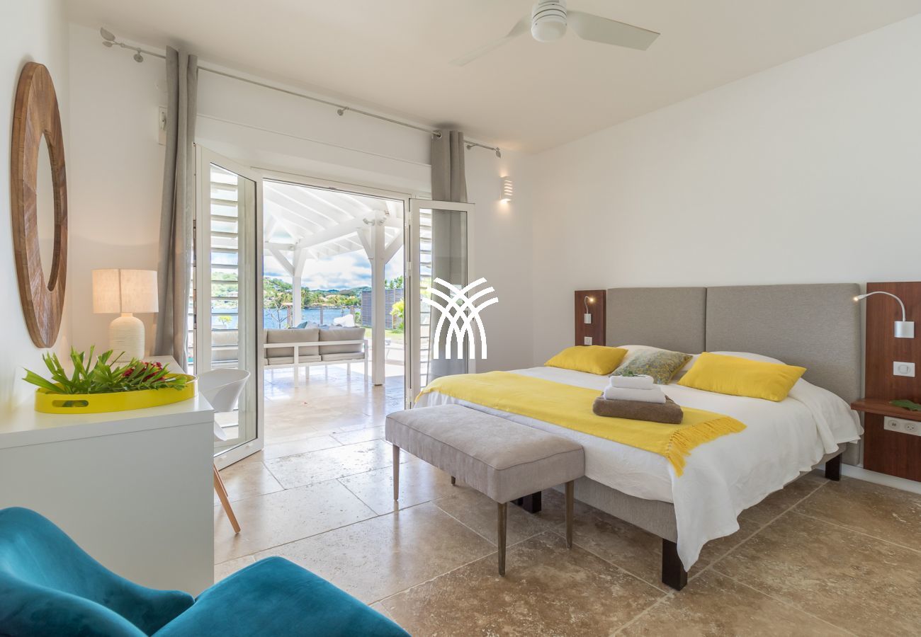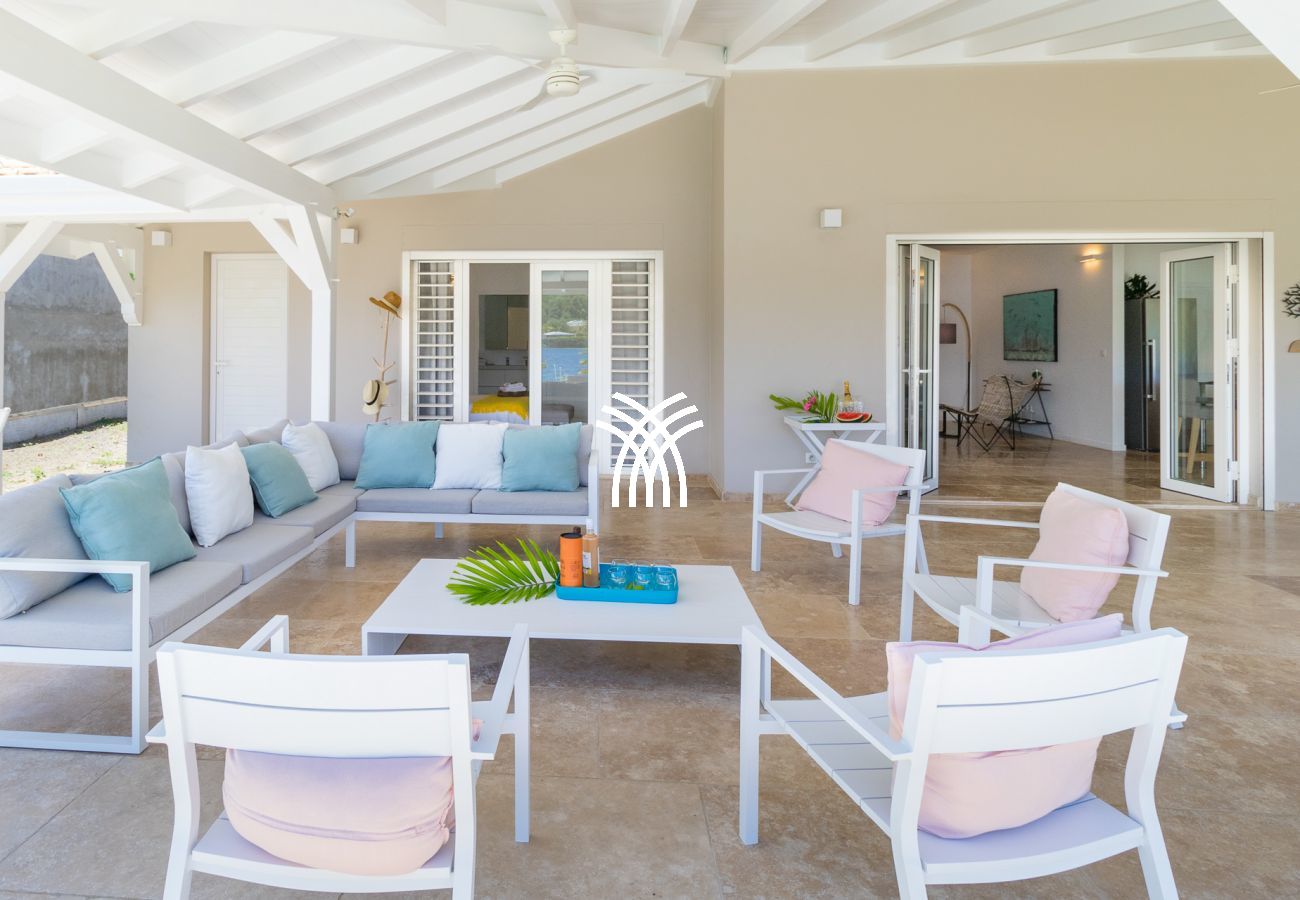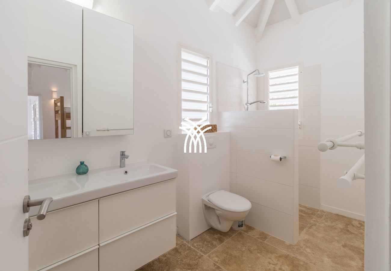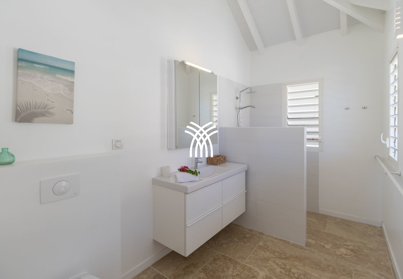 Outside, Villa Coraly offers several relaxation areas. The infinity pool, surrounded by sun loungers, is an ideal place to recharge. Two garden lounges overlook the sea, perfect for enjoying an aperitif while admiring the view. A large outdoor table, located under a carbet, allows meals to be taken in the shade while enjoying the panorama of the lagoon.