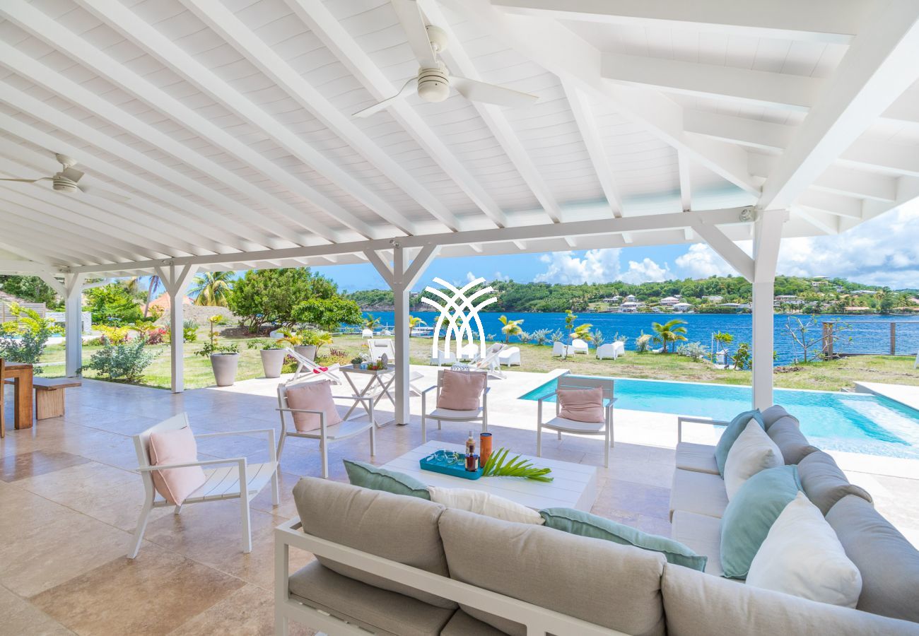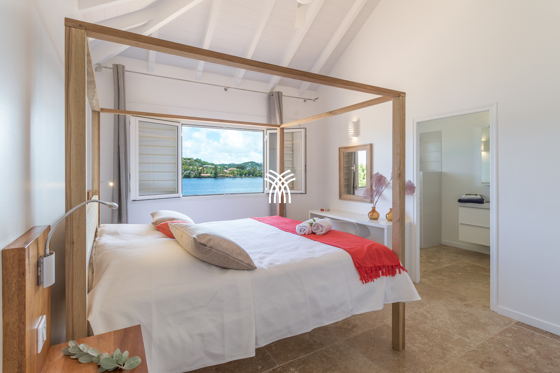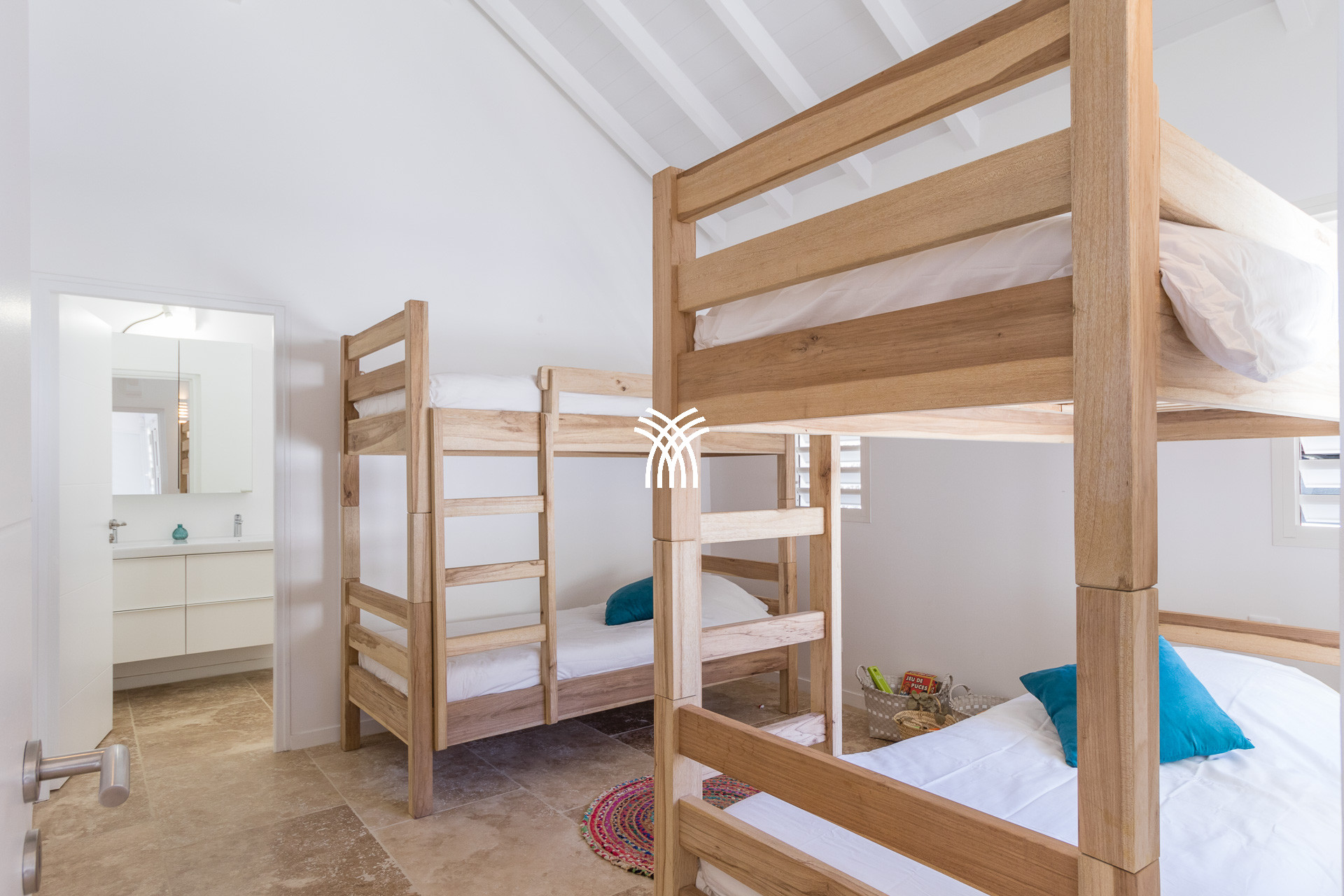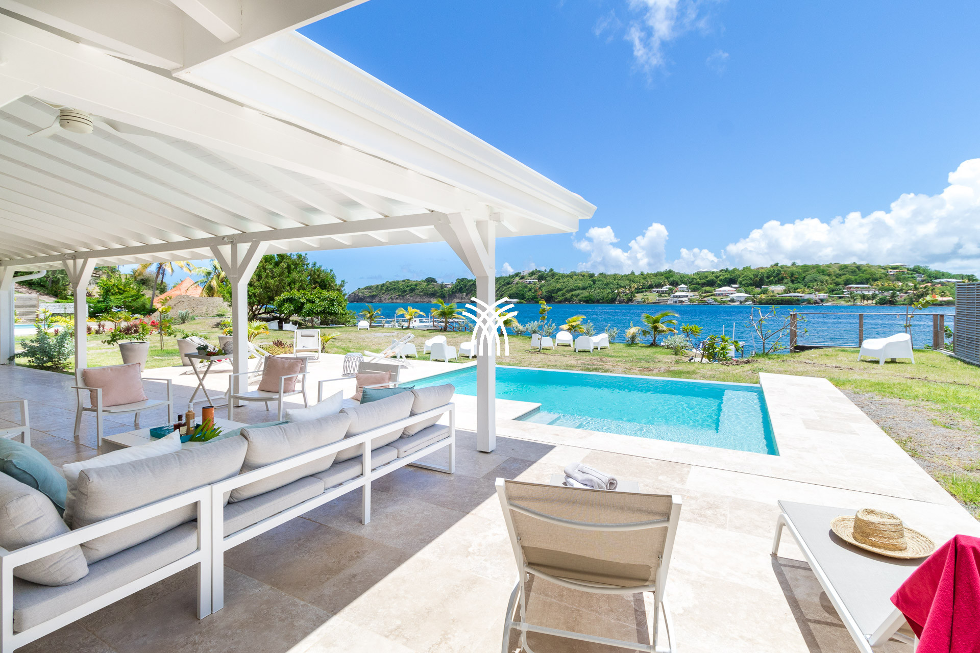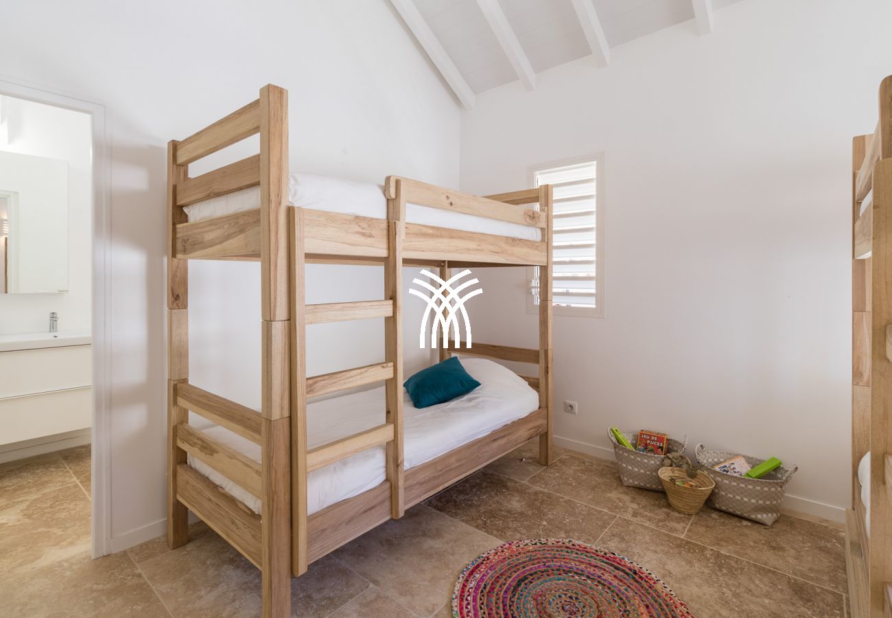 Outside, Villa Coraly offers several relaxation areas. The infinity pool, surrounded by sun loungers, is an ideal place to recharge. Two garden lounges overlook the sea, perfect for enjoying an aperitif while admiring the view. A large outdoor table, located under a carbet, allows meals to be taken in the shade while enjoying the panorama of the lagoon.