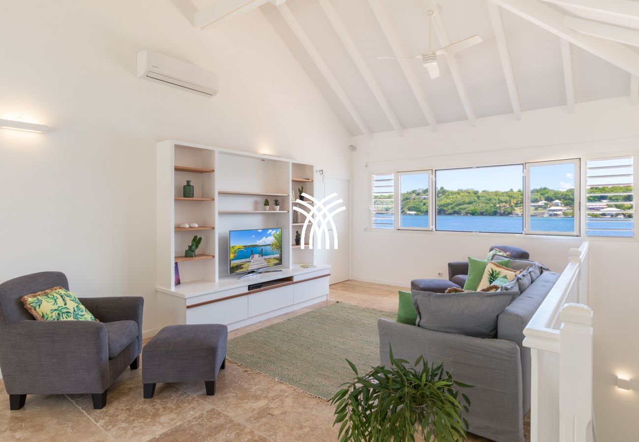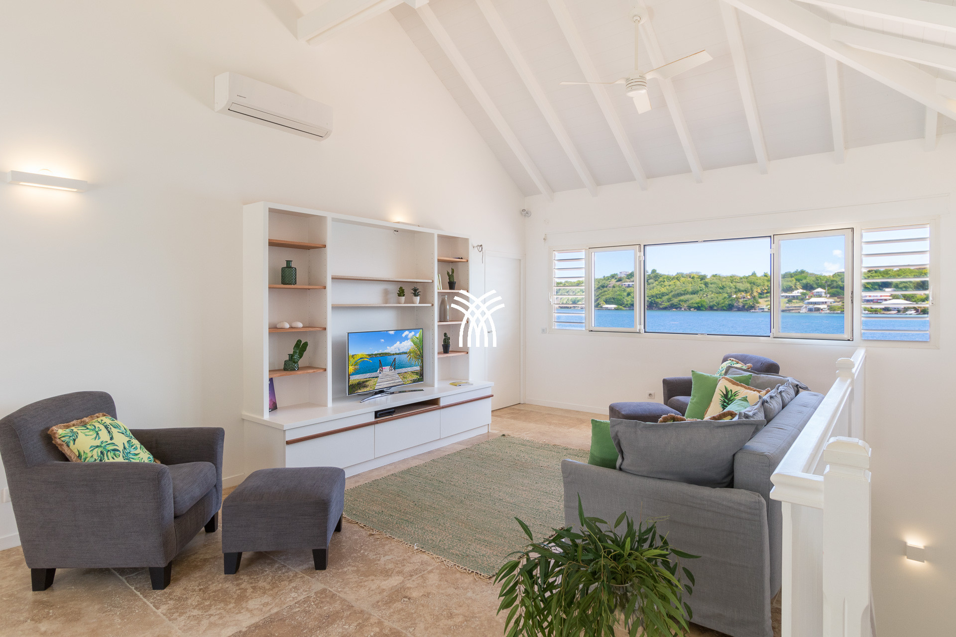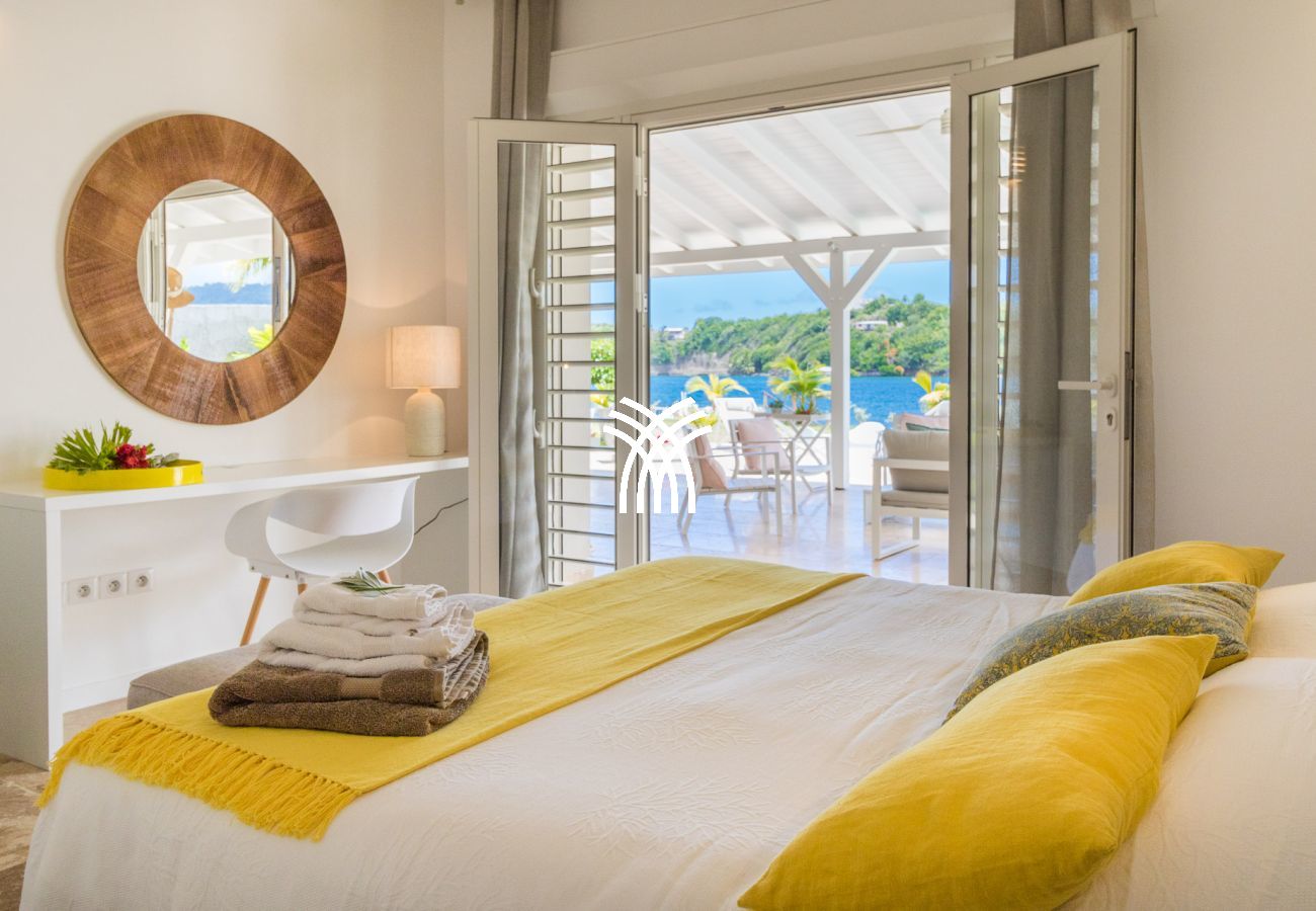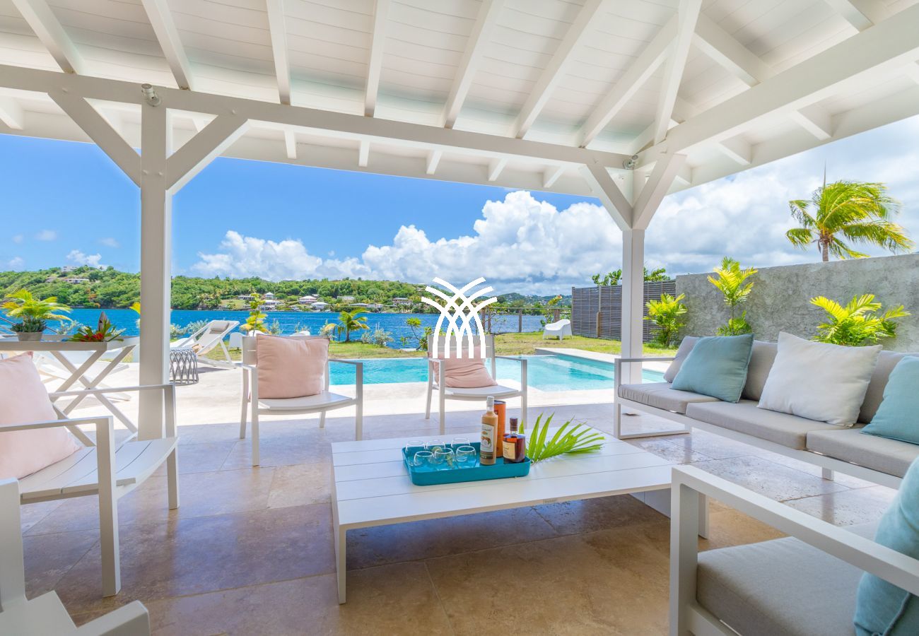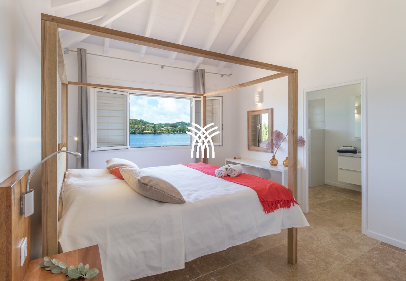 Outside, Villa Coraly offers several relaxation areas. The infinity pool, surrounded by sun loungers, is an ideal place to recharge. Two garden lounges overlook the sea, perfect for enjoying an aperitif while admiring the view. A large outdoor table, located under a carbet, allows meals to be taken in the shade while enjoying the panorama of the lagoon.