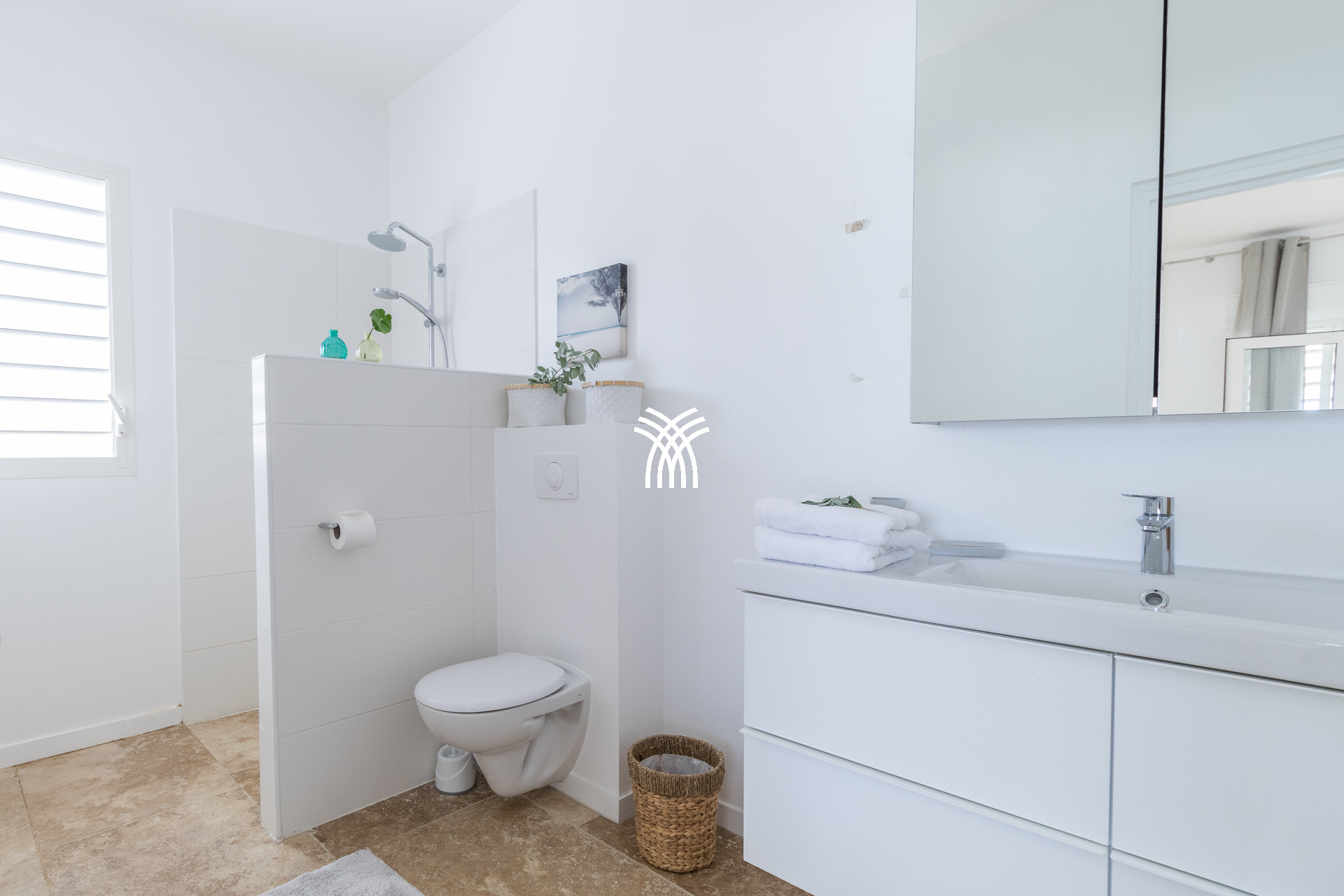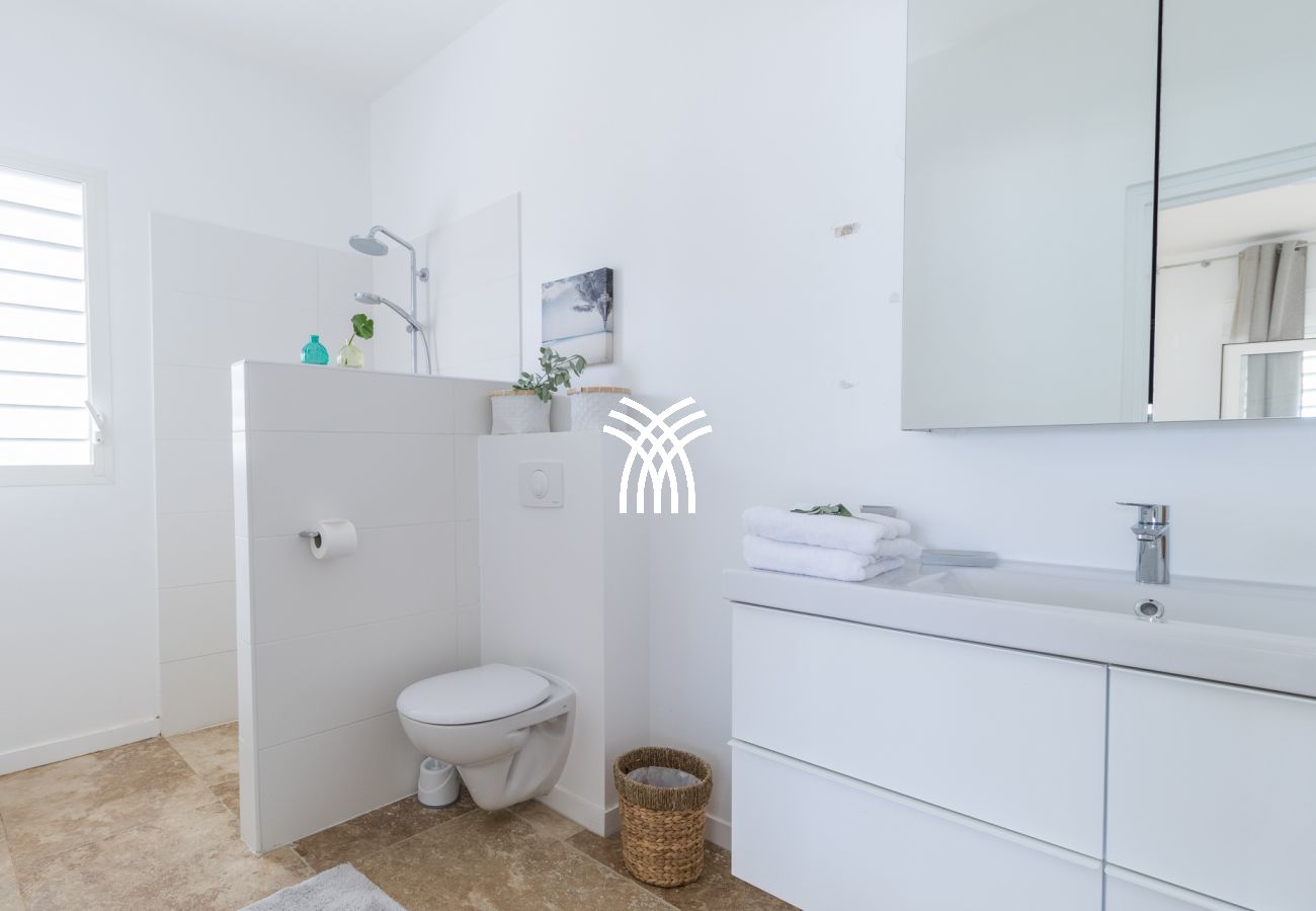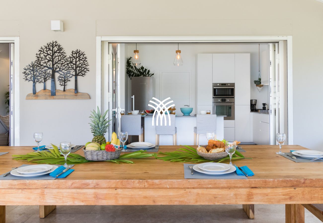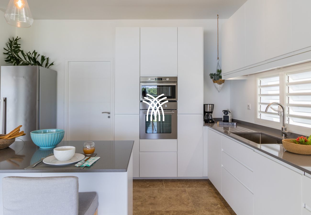 Villa Coraly stands out for its modern architecture and clean lines. The open-plan living spaces, bathed in natural light, offer areas dedicated to relaxation and sharing, ensuring restful holidays. The tastefully decorated living room is equipped with two white sofas that accentuate the soft and relaxing atmosphere of the room. The dining room, with its lacquered table, invites convivial meals while enjoying the breathtaking ocean view. The open kitchen is fully equipped, with a wooden bar that adds a warm and friendly touch.