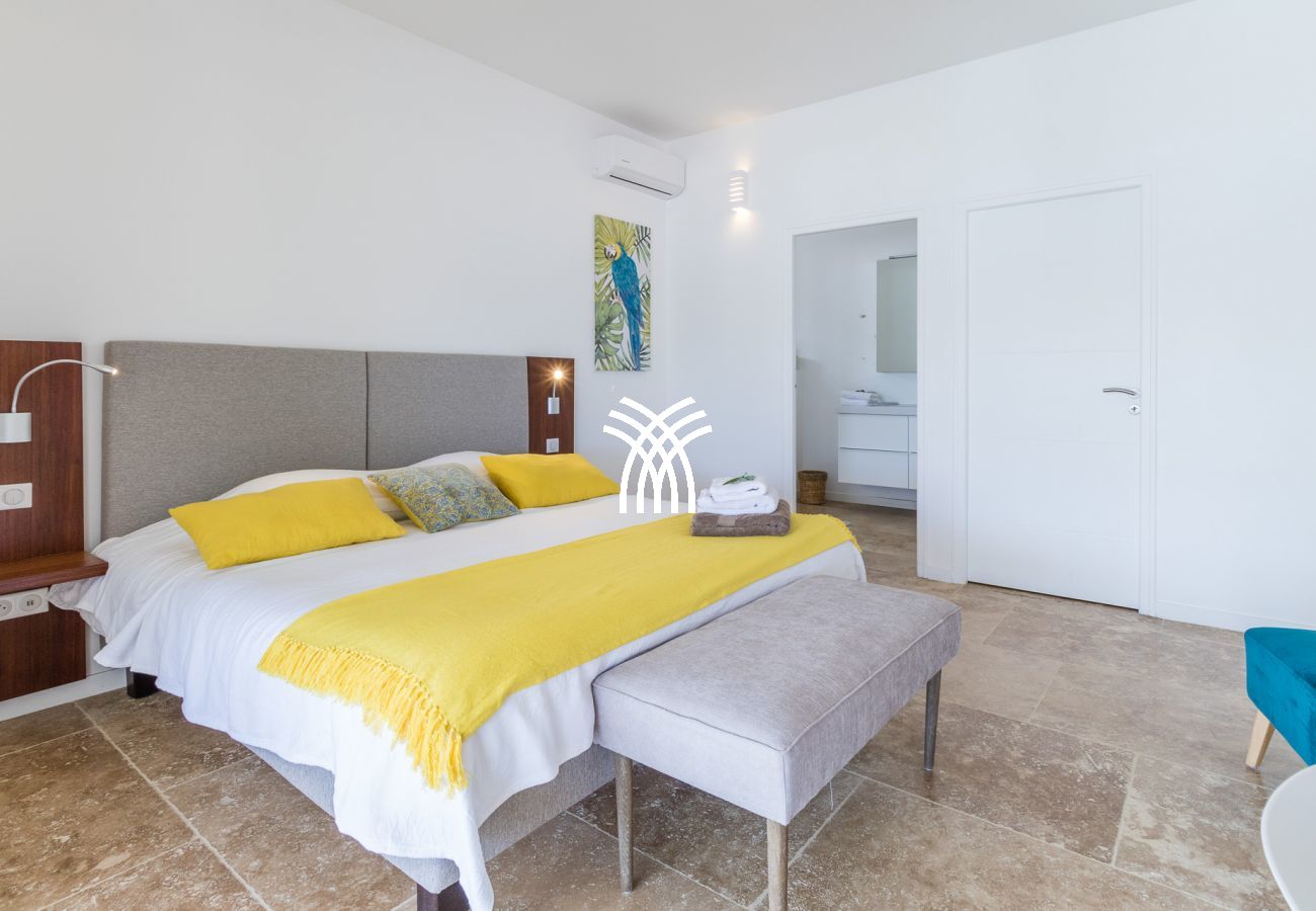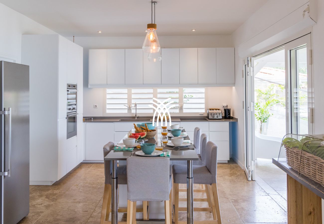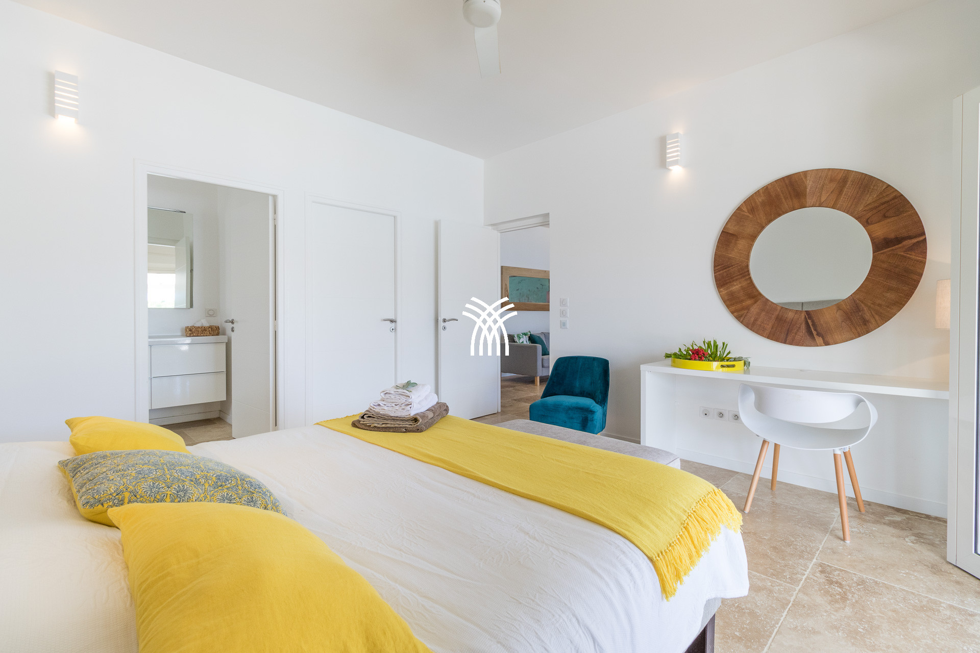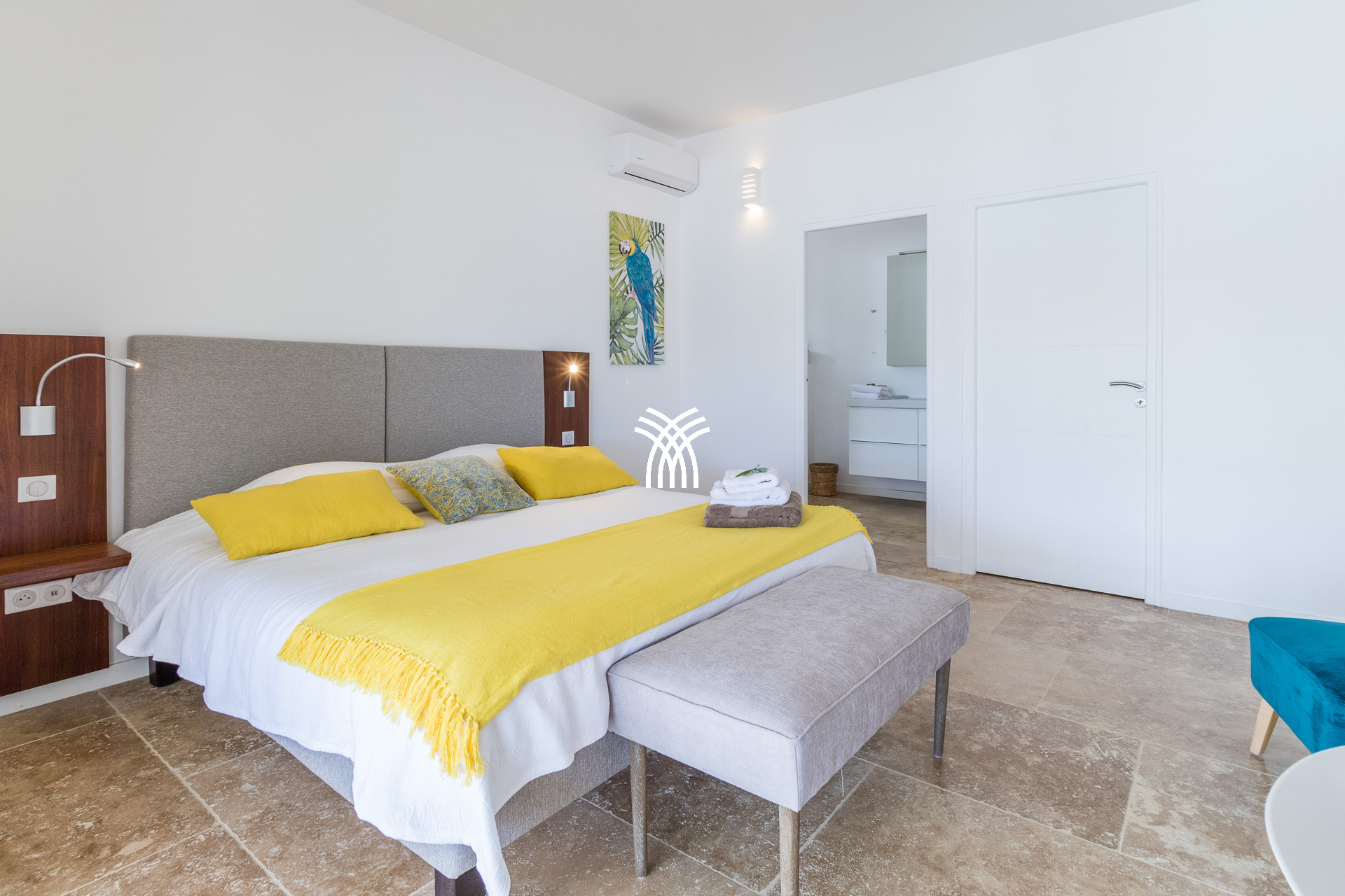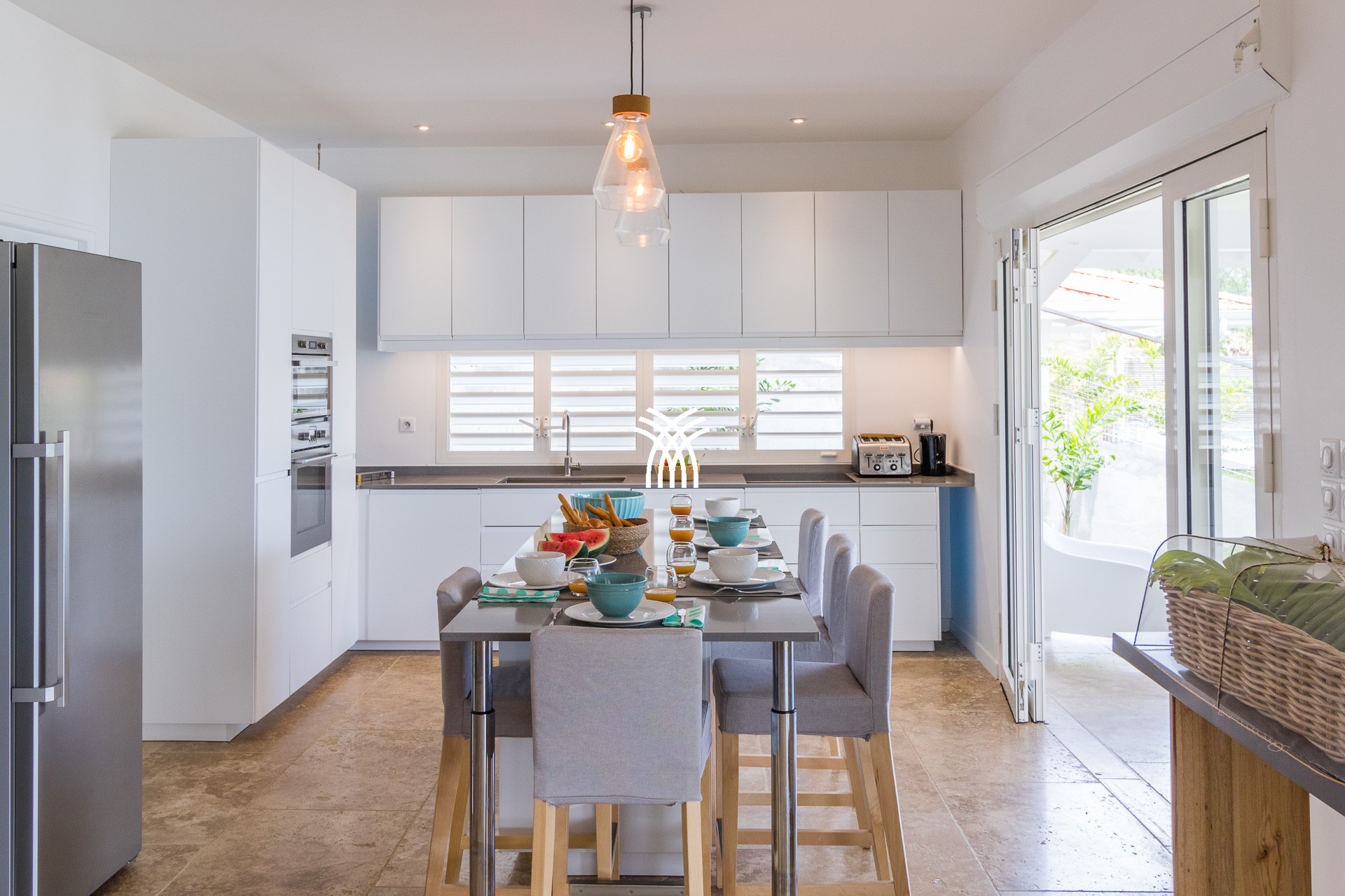 Villa Coraly stands out for its modern architecture and clean lines. The open-plan living spaces, bathed in natural light, offer areas dedicated to relaxation and sharing, ensuring restful holidays. The tastefully decorated living room is equipped with two white sofas that accentuate the soft and relaxing atmosphere of the room. The dining room, with its lacquered table, invites convivial meals while enjoying the breathtaking ocean view. The open kitchen is fully equipped, with a wooden bar that adds a warm and friendly touch.