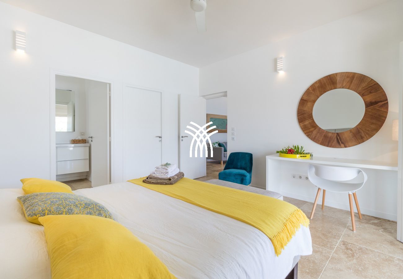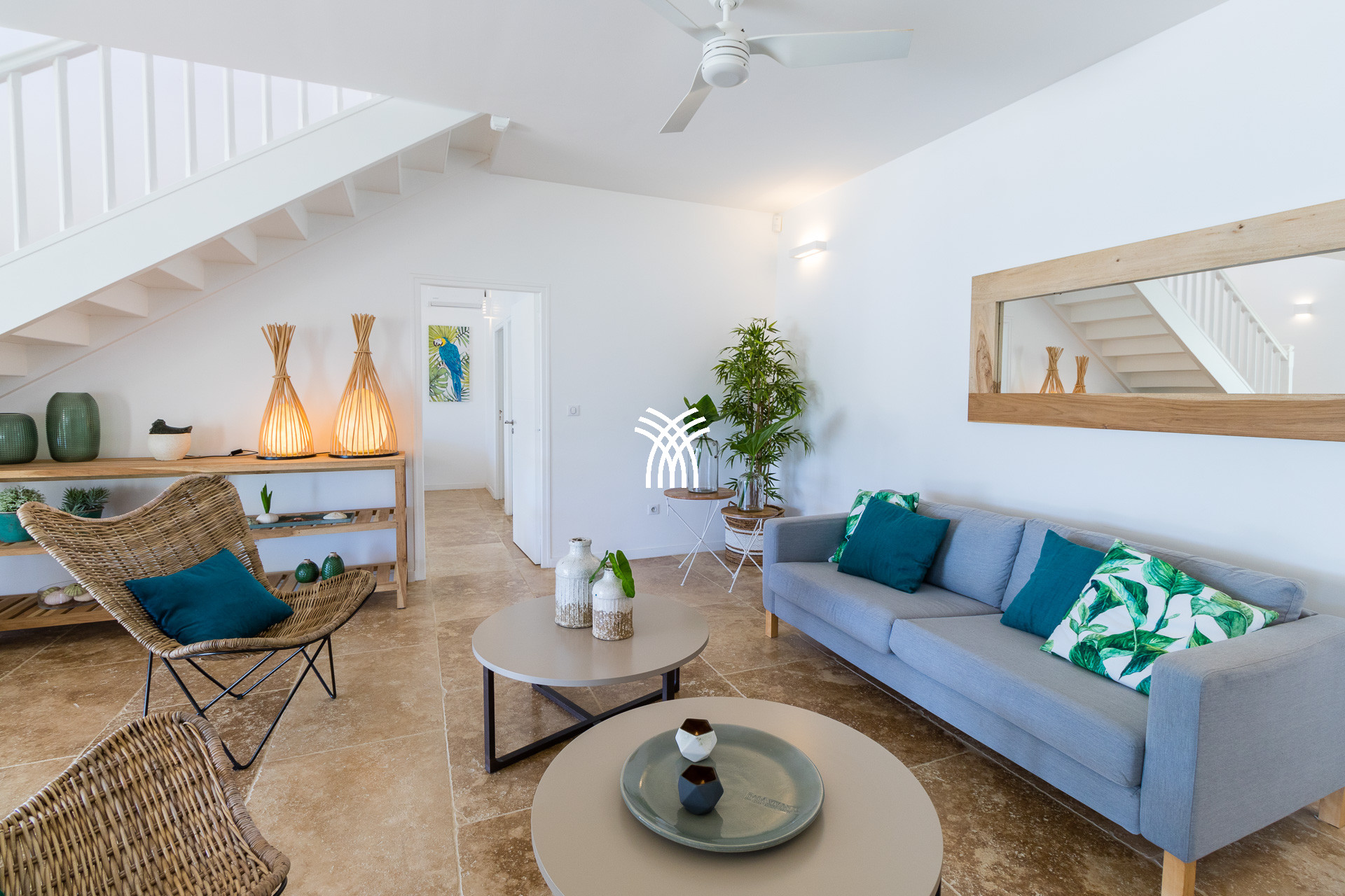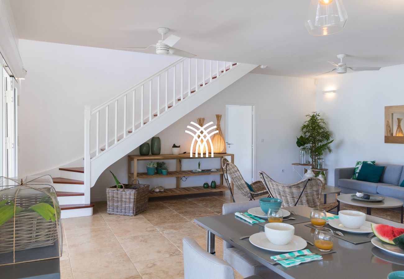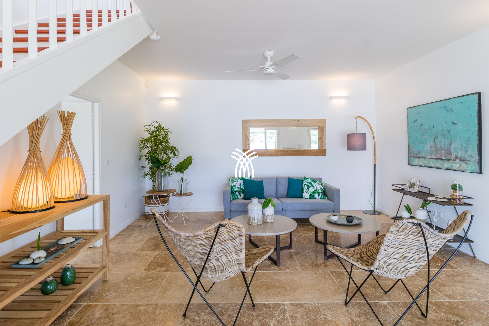 Villa Coraly stands out for its modern architecture and clean lines. The open-plan living spaces, bathed in natural light, offer areas dedicated to relaxation and sharing, ensuring restful holidays. The tastefully decorated living room is equipped with two white sofas that accentuate the soft and relaxing atmosphere of the room. The dining room, with its lacquered table, invites convivial meals while enjoying the breathtaking ocean view. The open kitchen is fully equipped, with a wooden bar that adds a warm and friendly touch.