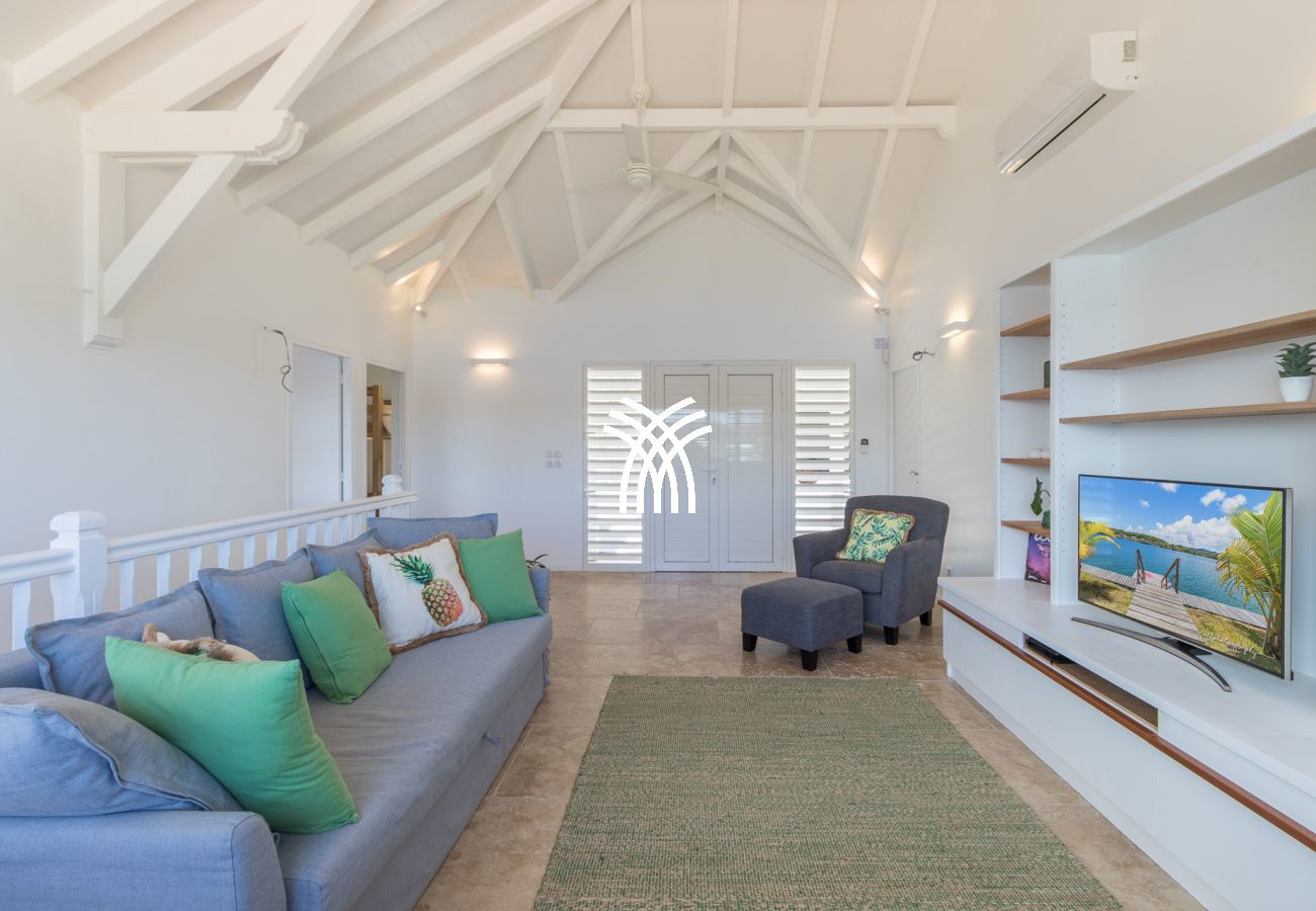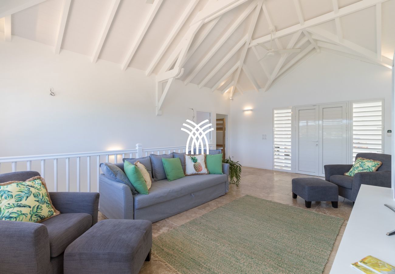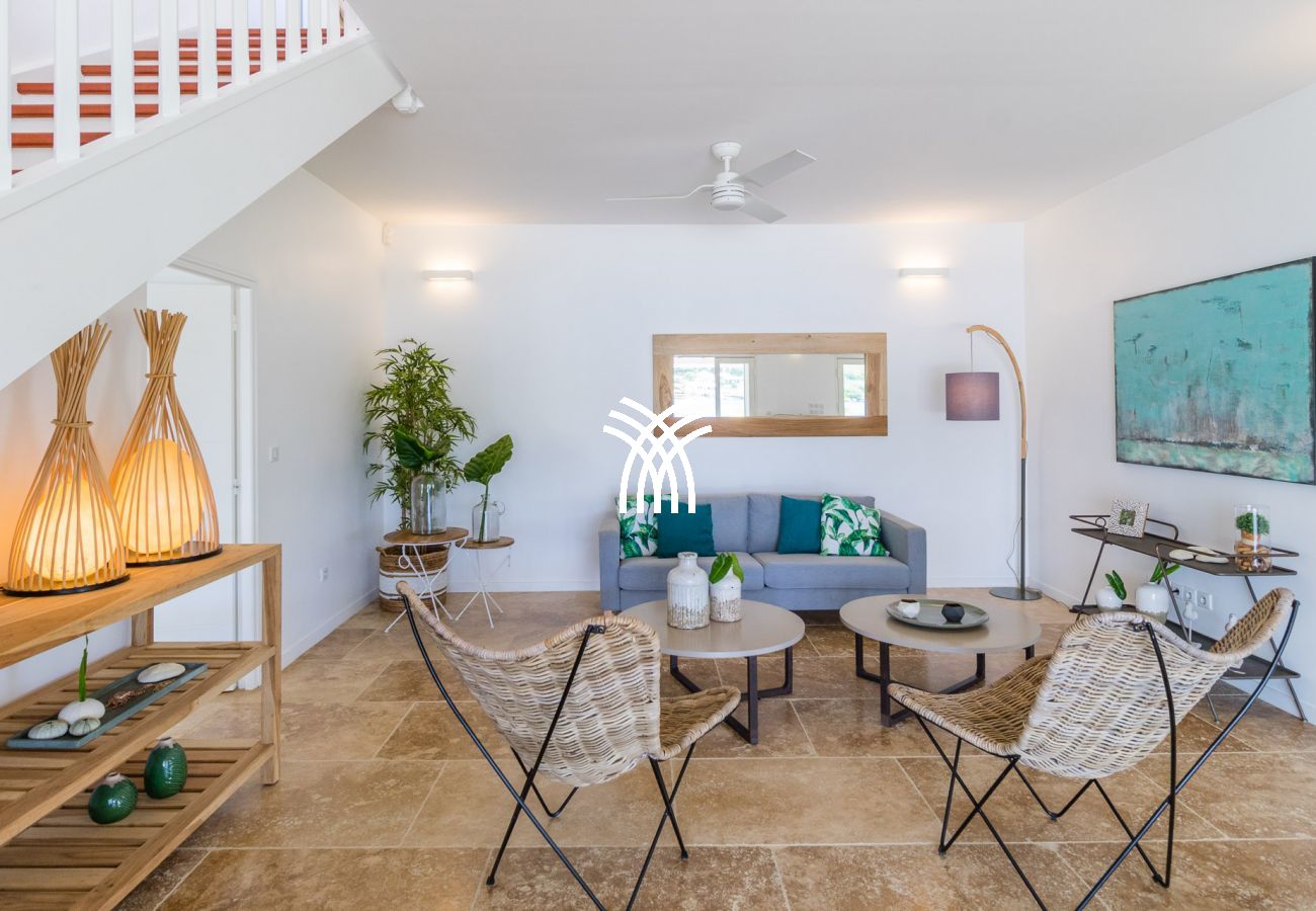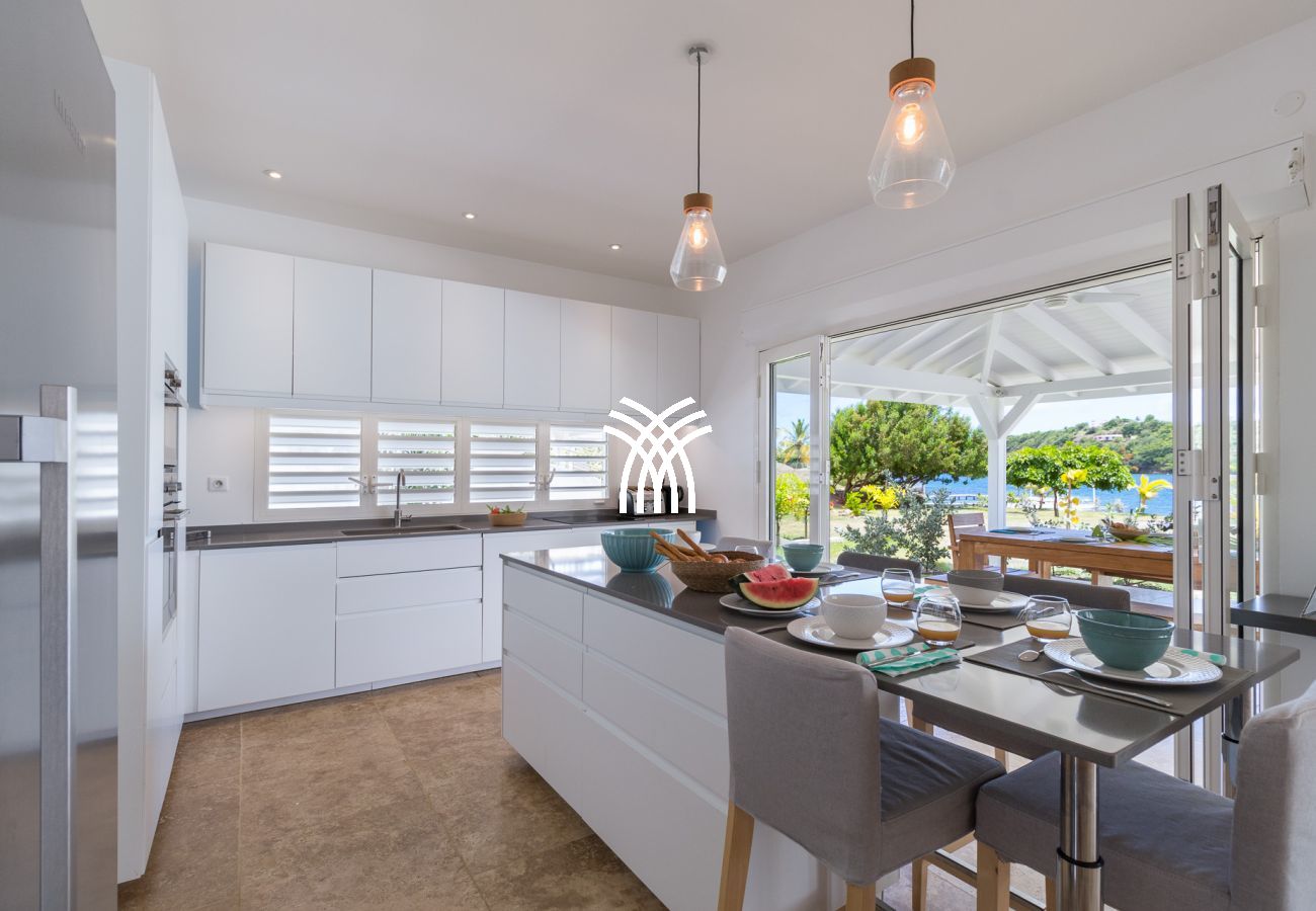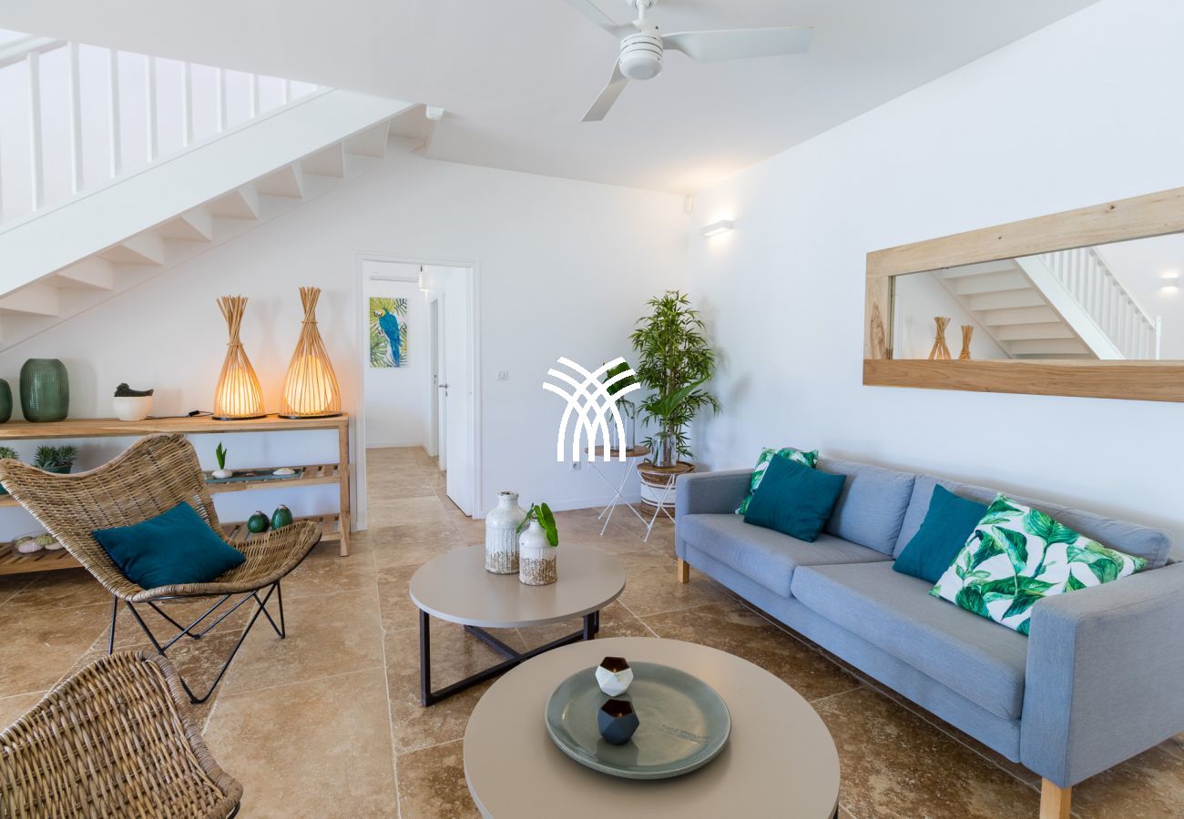 Villa Coraly stands out for its modern architecture and clean lines. The open-plan living spaces, bathed in natural light, offer areas dedicated to relaxation and sharing, ensuring restful holidays. The tastefully decorated living room is equipped with two white sofas that accentuate the soft and relaxing atmosphere of the room. The dining room, with its lacquered table, invites convivial meals while enjoying the breathtaking ocean view. The open kitchen is fully equipped, with a wooden bar that adds a warm and friendly touch.