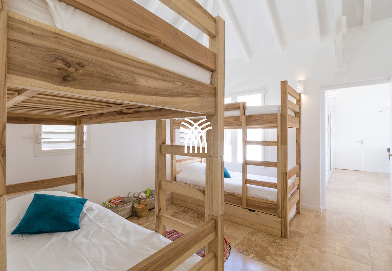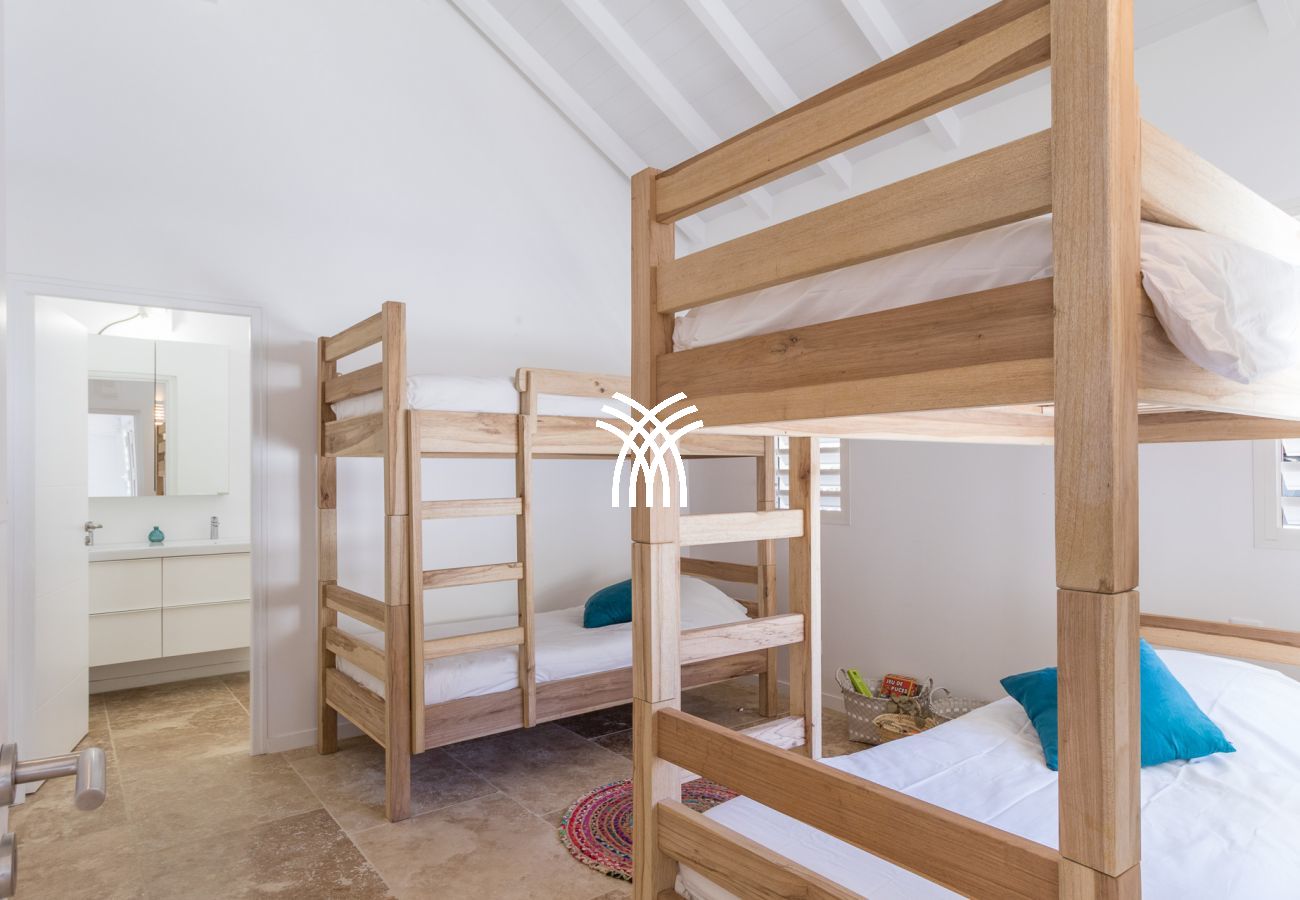 The villa has seven bedrooms, including one on the ground floor, offering a 160x200 bed and a large bay window with sea view. This room benefits from a desk area and a private shower room. Upstairs, four other bedrooms, elegantly decorated, are equipped with large bay windows. The master suite, with its 200x200 bed and sofa bed for children, has two walk-in closets and a private shower room. Two additional rooms are equipped with 90x200 beds and also have private shower rooms, with views of the pool and garden. A final upstairs bedroom has a 140x190 bed and a garden view. Finally, two interconnecting rooms on the ground floor are equipped with 90x200 beds and offer direct access to the terrace with sea view.