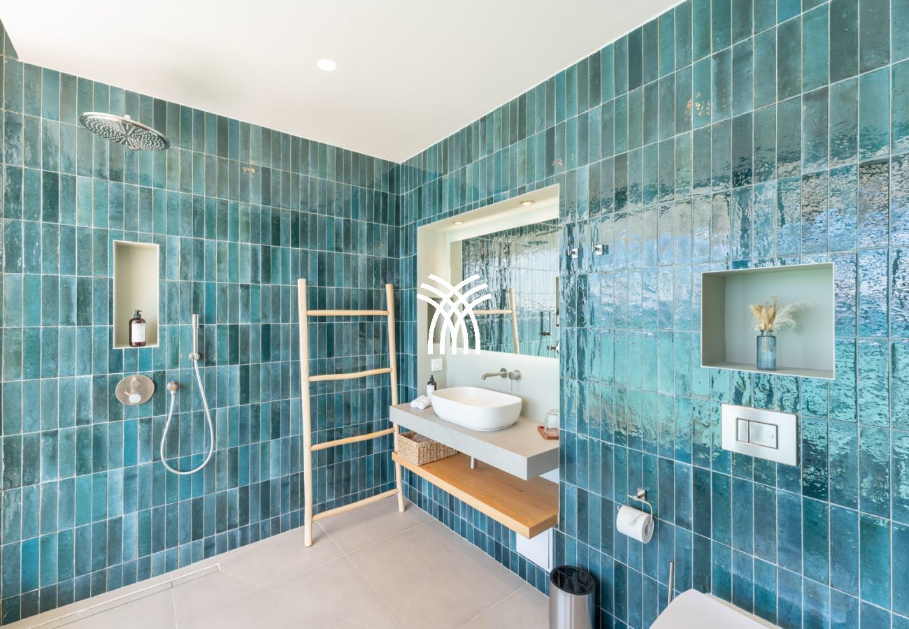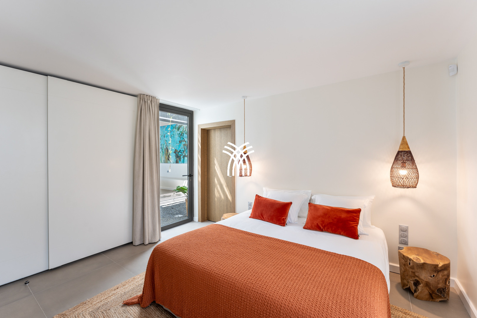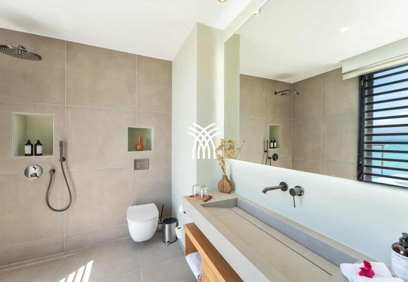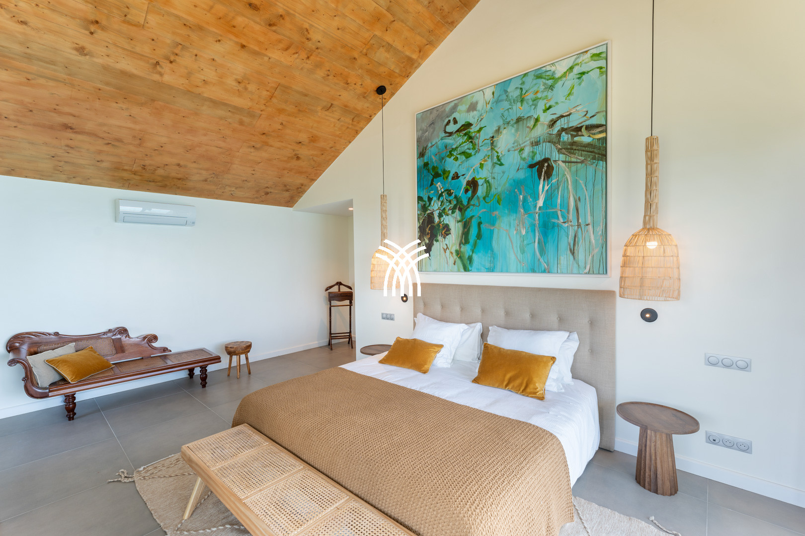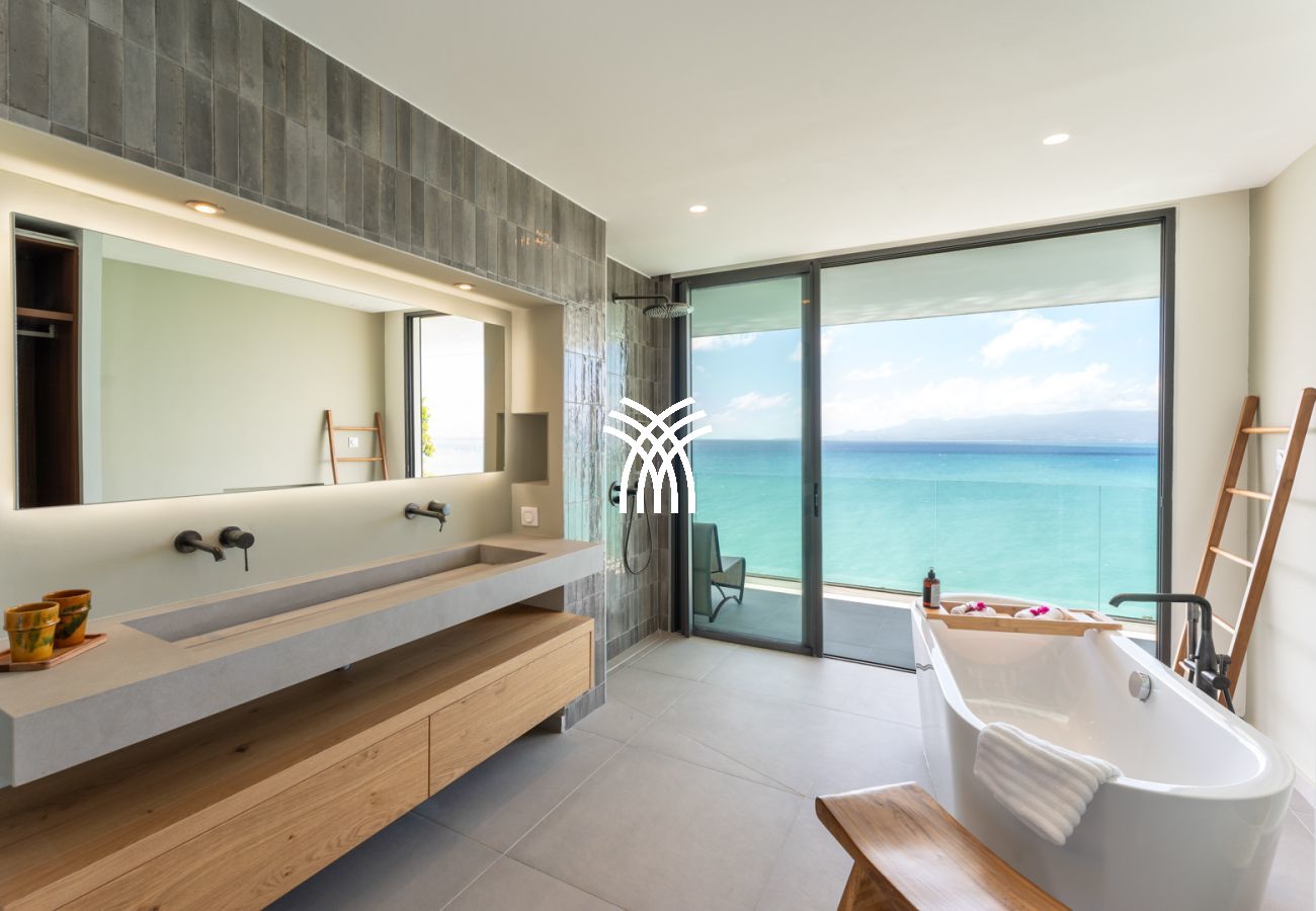 The bedrooms, distributed between the ground floor and the first floor, are havens of comfort and privacy. The floor-to-ceiling windows on the upper floor offer a magnificent view of the sea and surrounding islands. Four bedrooms are equipped with a king-size bed, a closet, a television, and a bathroom with an Italian shower, while the master suite has a dressing room, a bathroom with ocean views, and access to the terrace.