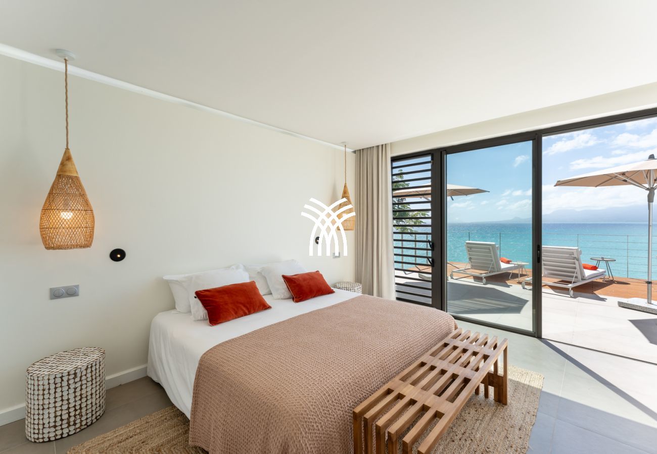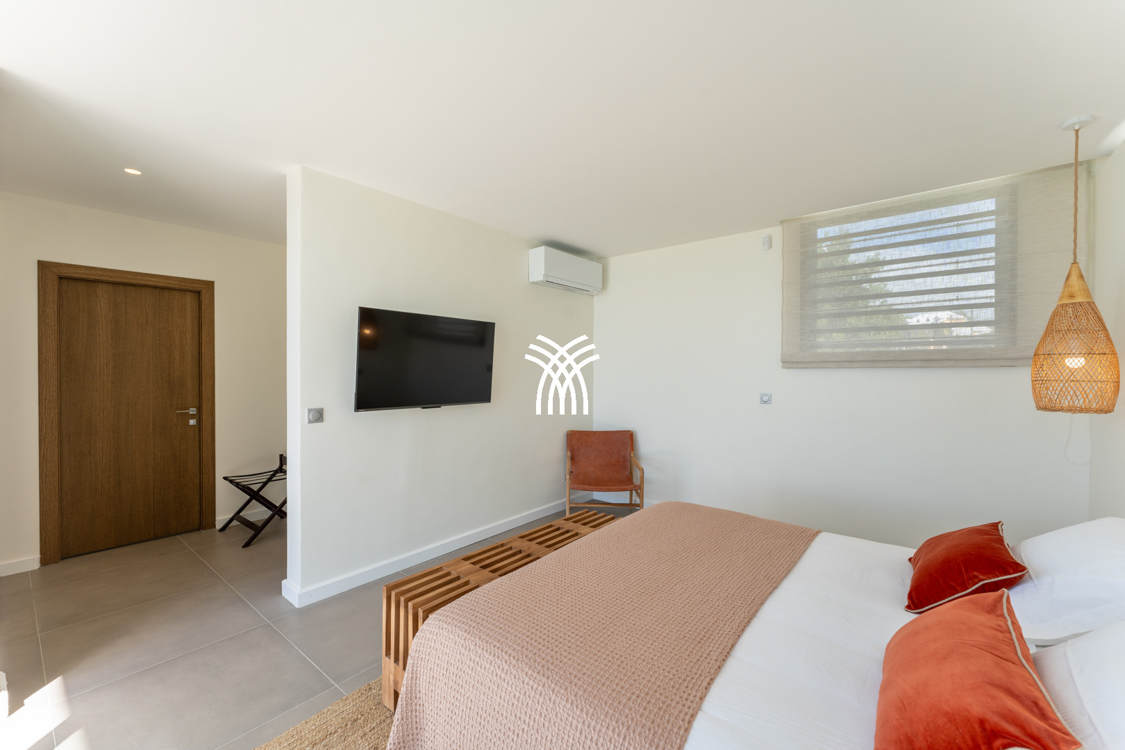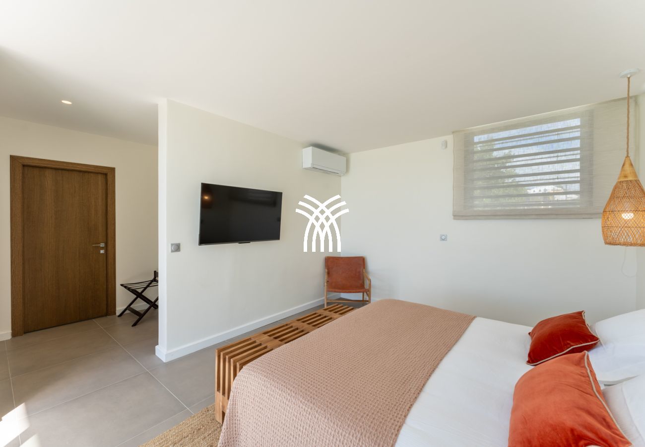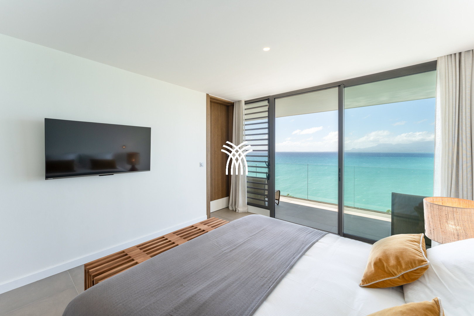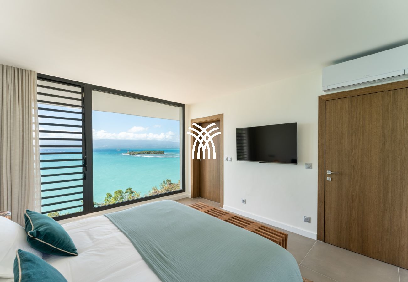 The bedrooms, distributed between the ground floor and the first floor, are havens of comfort and privacy. The floor-to-ceiling windows on the upper floor offer a magnificent view of the sea and surrounding islands. Four bedrooms are equipped with a king-size bed, a closet, a television, and a bathroom with an Italian shower, while the master suite has a dressing room, a bathroom with ocean views, and access to the terrace.