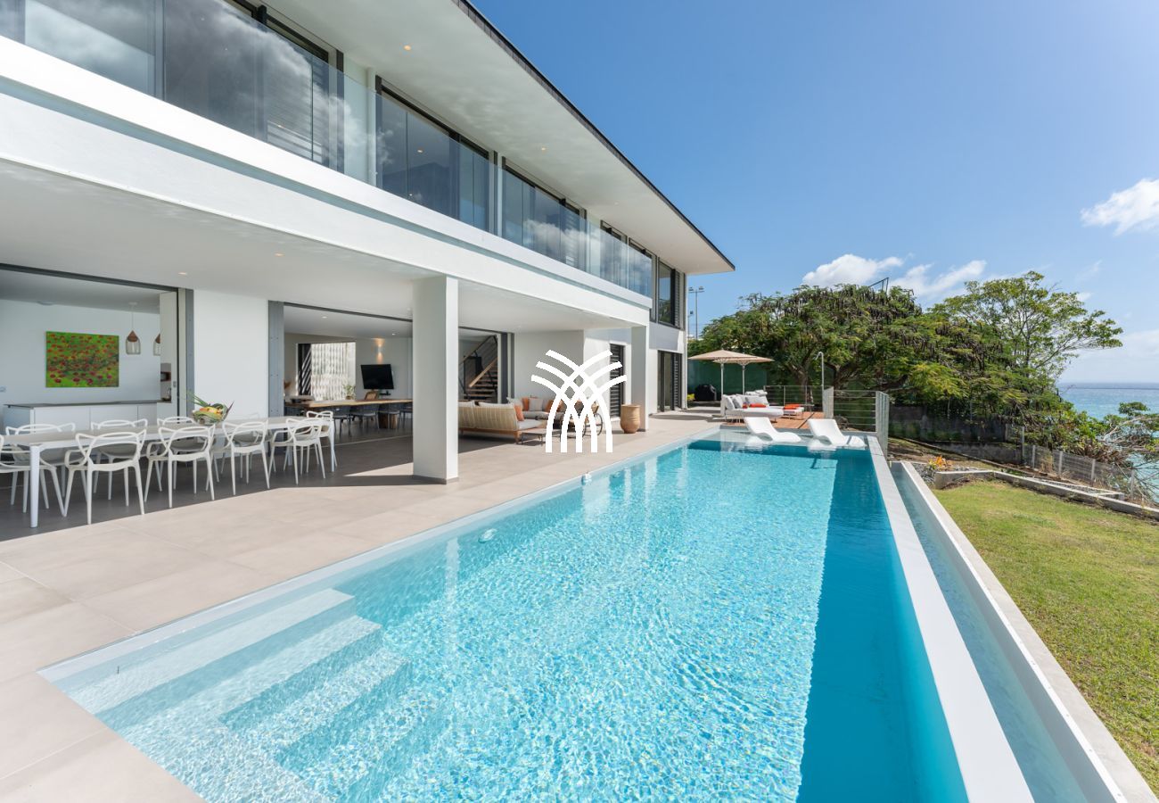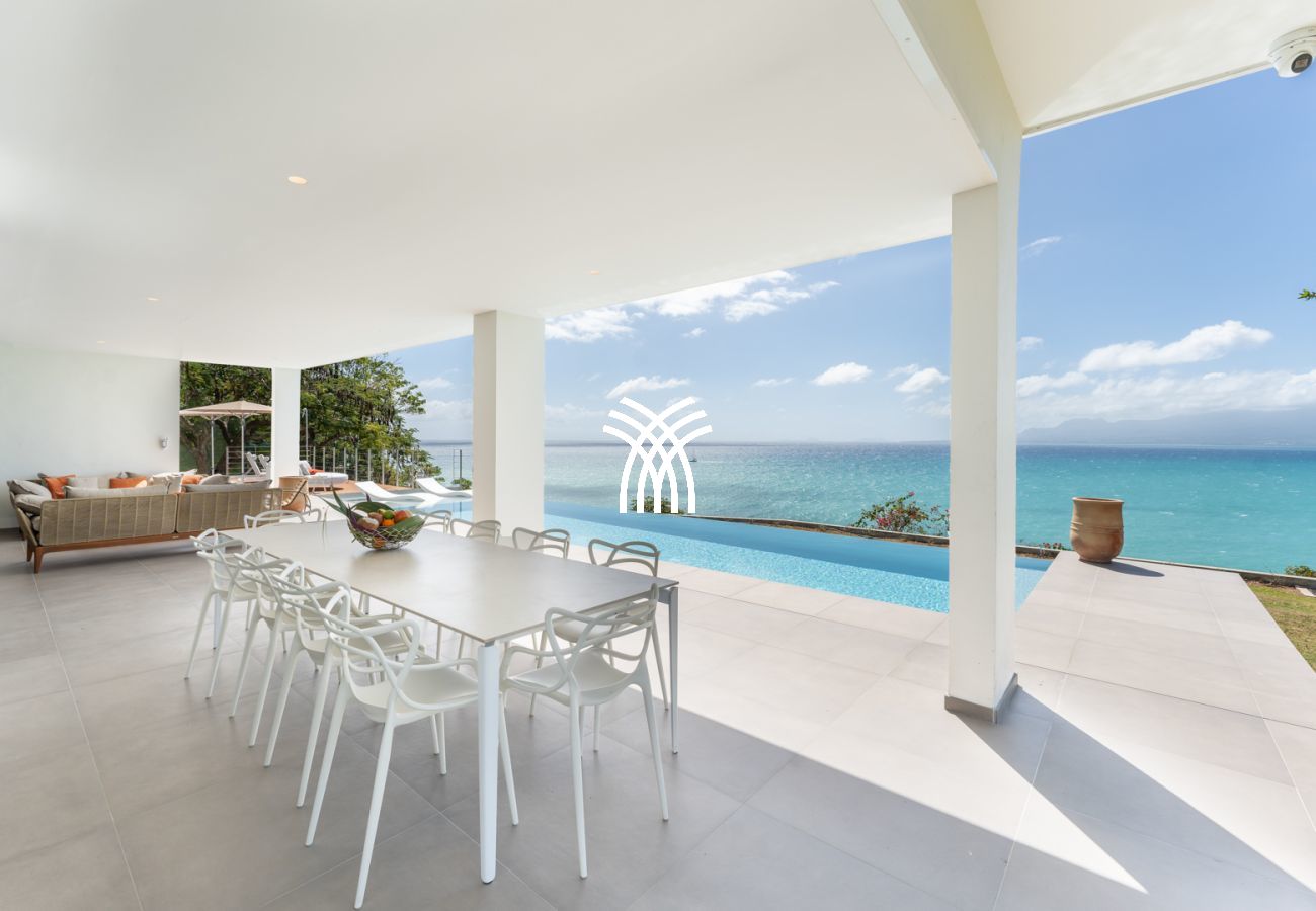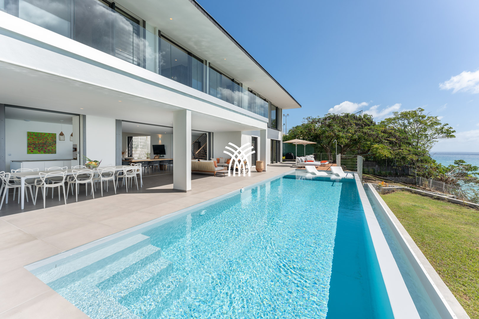 Built on two levels, the villa has five bedrooms, each with its own bathroom, and includes six toilets. Located in the heart of Le Gosier town, on the edge of a cliff, it offers an unobstructed view of the sea, which you can admire from the infinity pool or the various terraces.