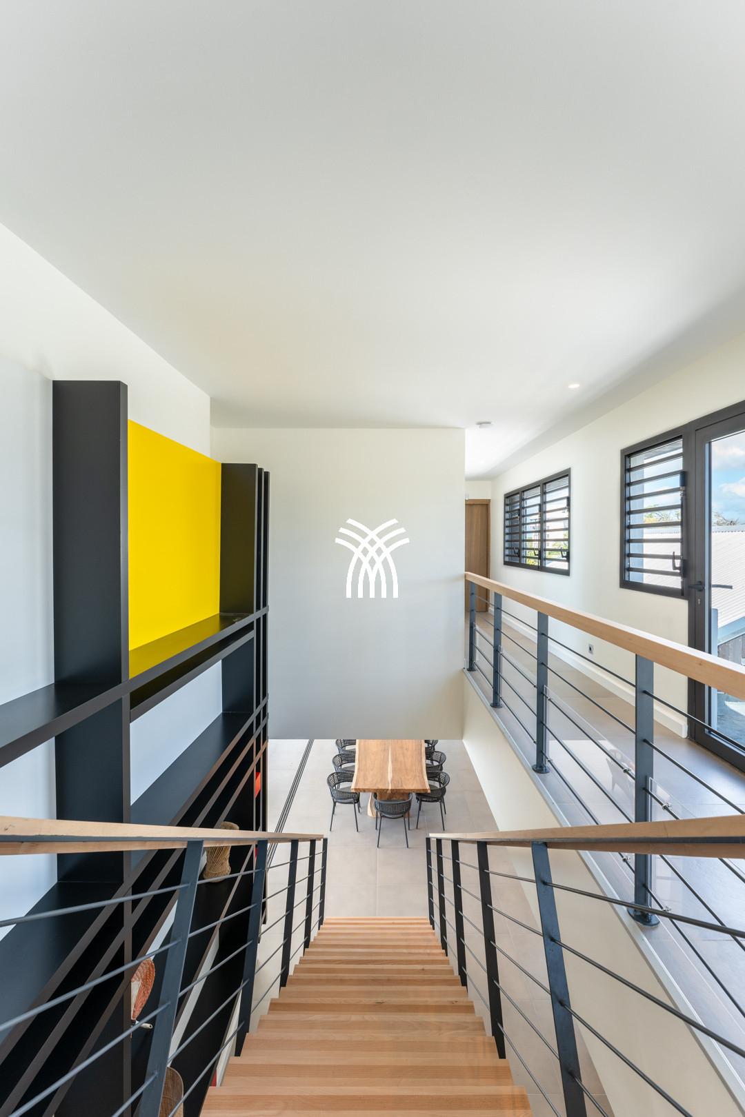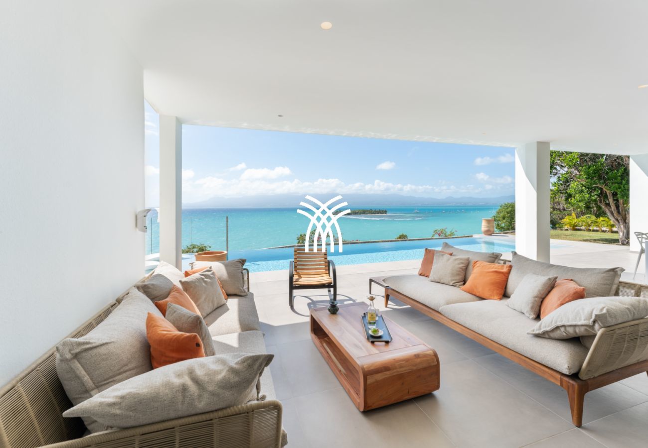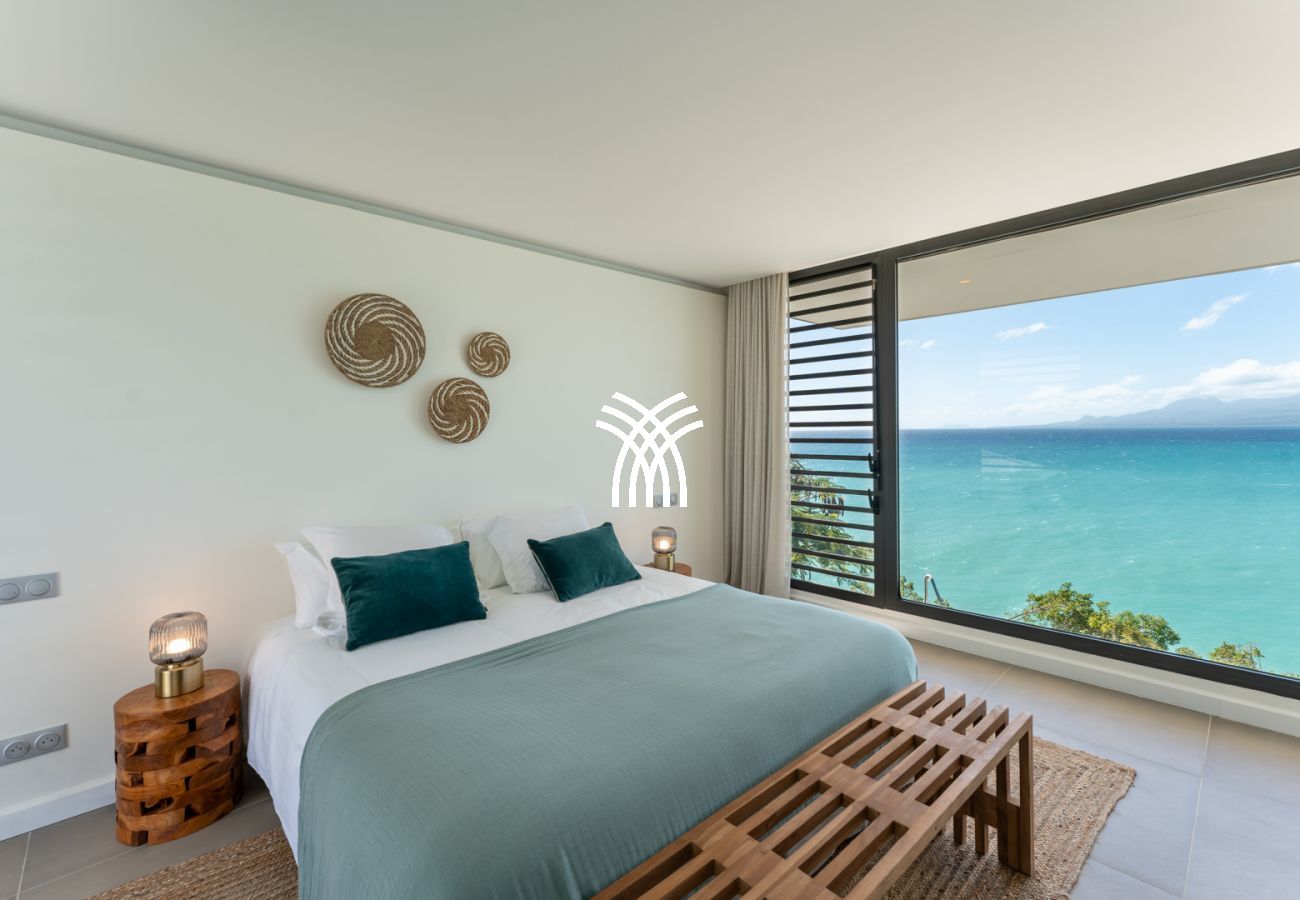 Built on two levels, the villa has five bedrooms, each with its own bathroom, and includes six toilets. Located in the heart of Le Gosier town, on the edge of a cliff, it offers an unobstructed view of the sea, which you can admire from the infinity pool or the various terraces.