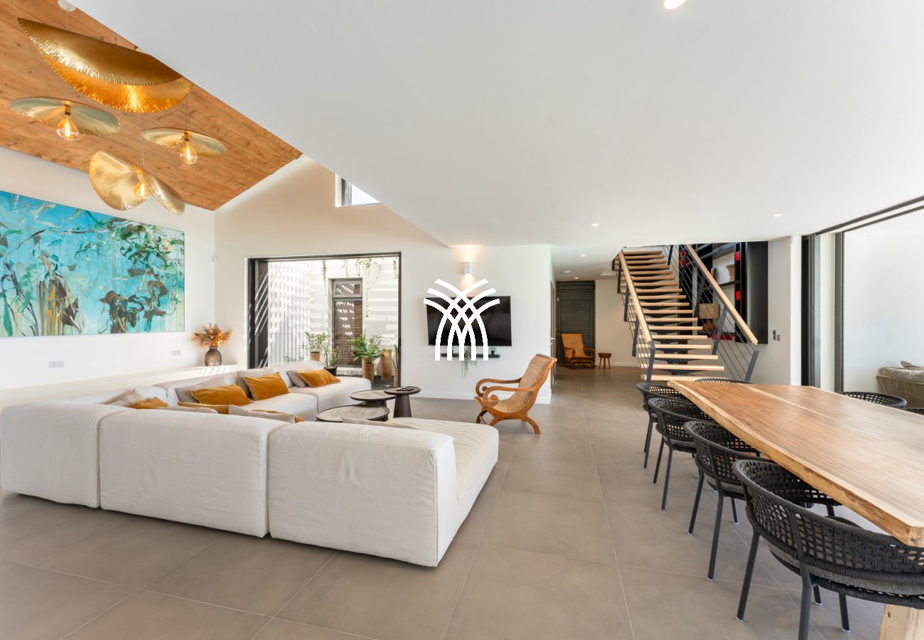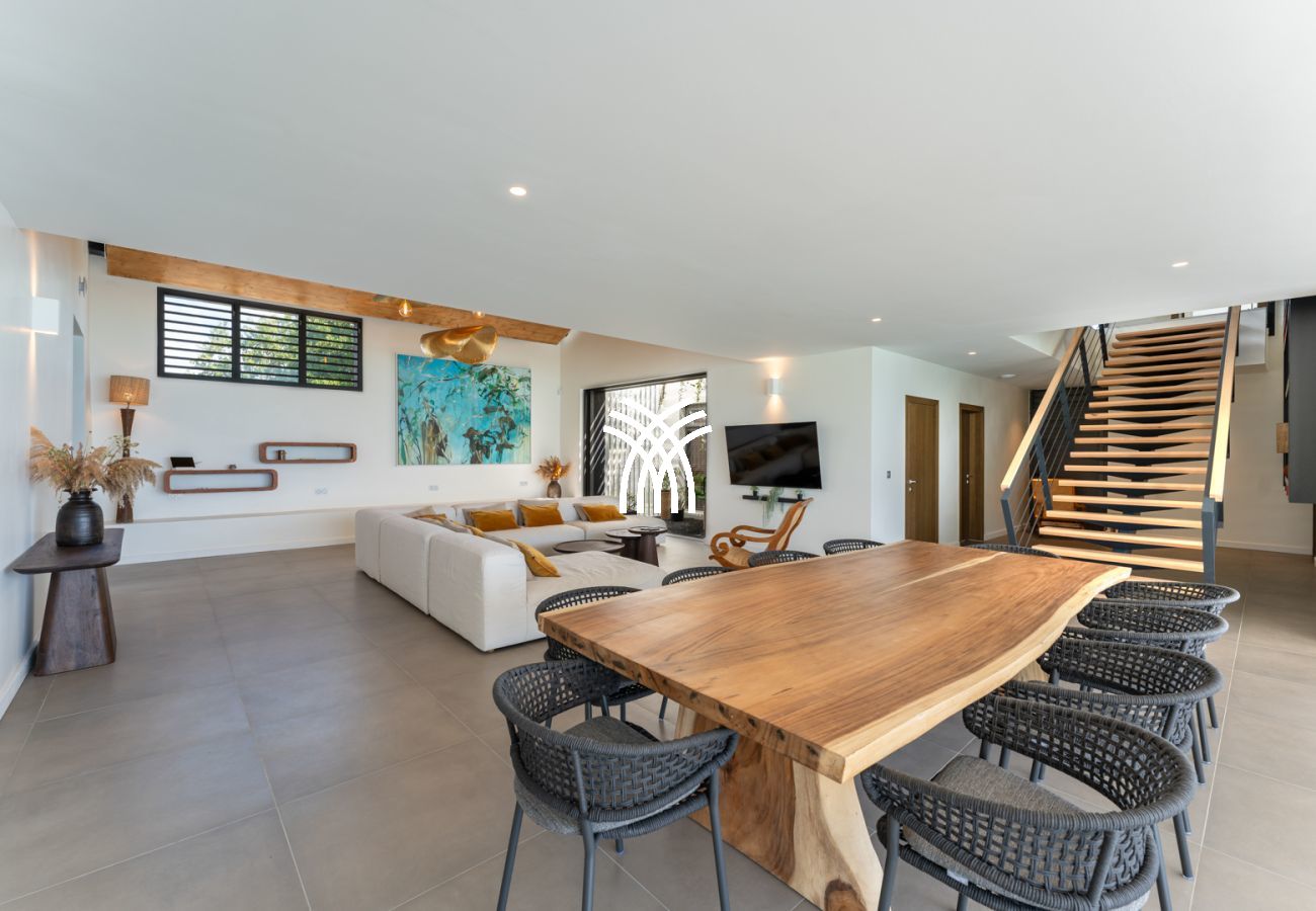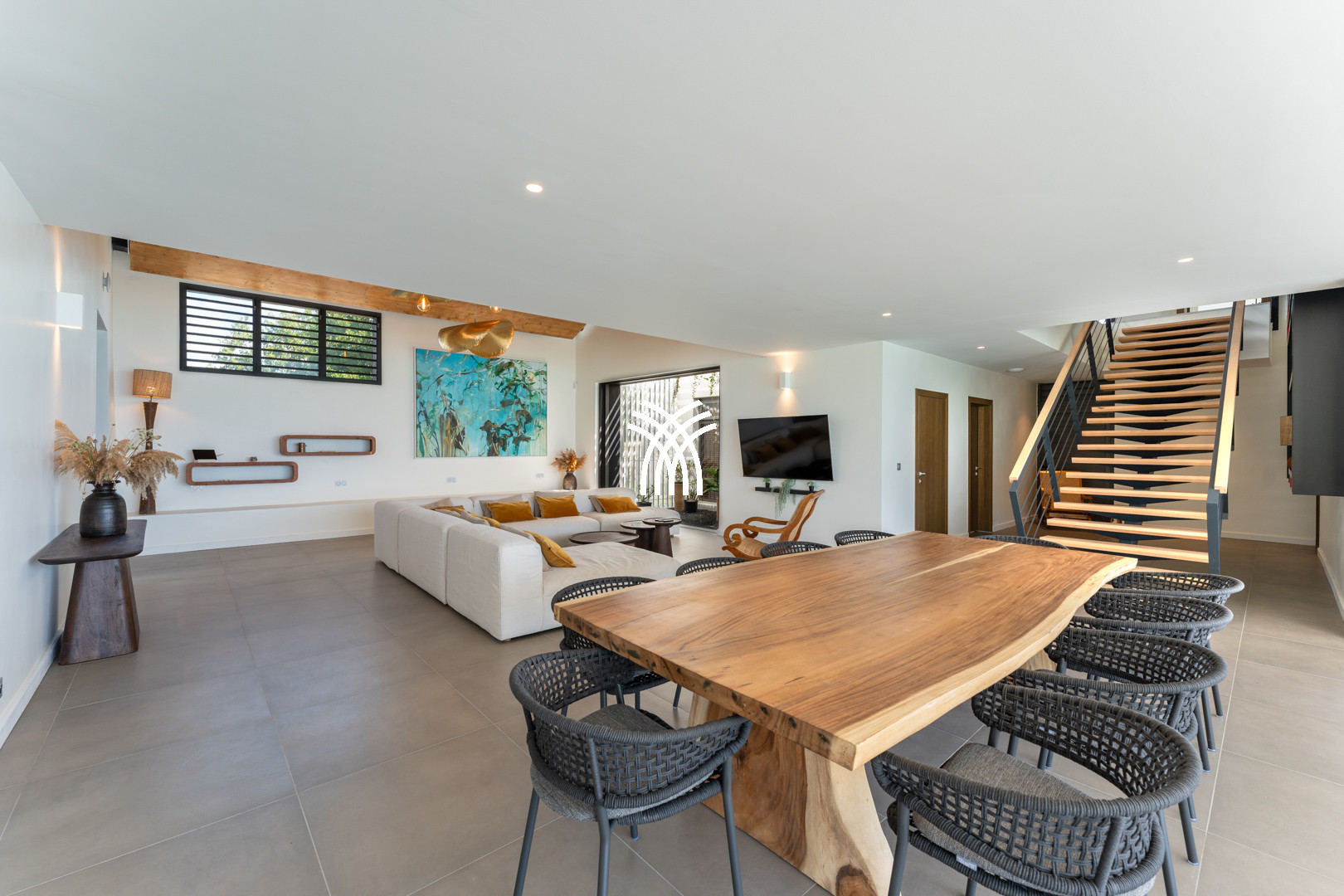 The decor of Villa GwaKana, both chic, sleek, and modern, creates an atmosphere of discreet luxury, making this place exceptionally exclusive. The living room, spacious and bathed in light, with its high vault, is a perfect living space, including a cozy TV lounge with a large corner sofa, ideal for spending time with family or friends. The indoor dining room, a natural extension of the open and fully equipped kitchen, has a solid wood table that can accommodate 10 guests.