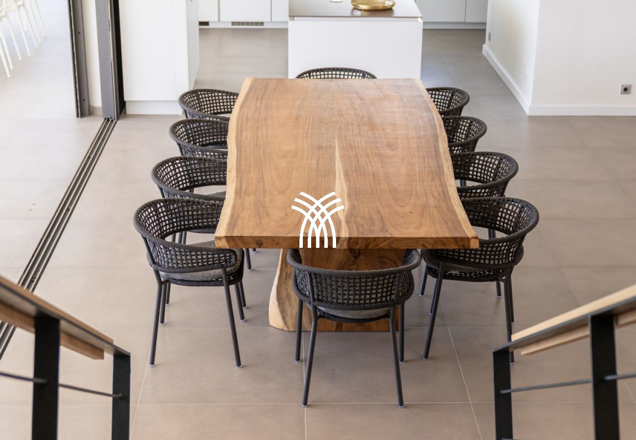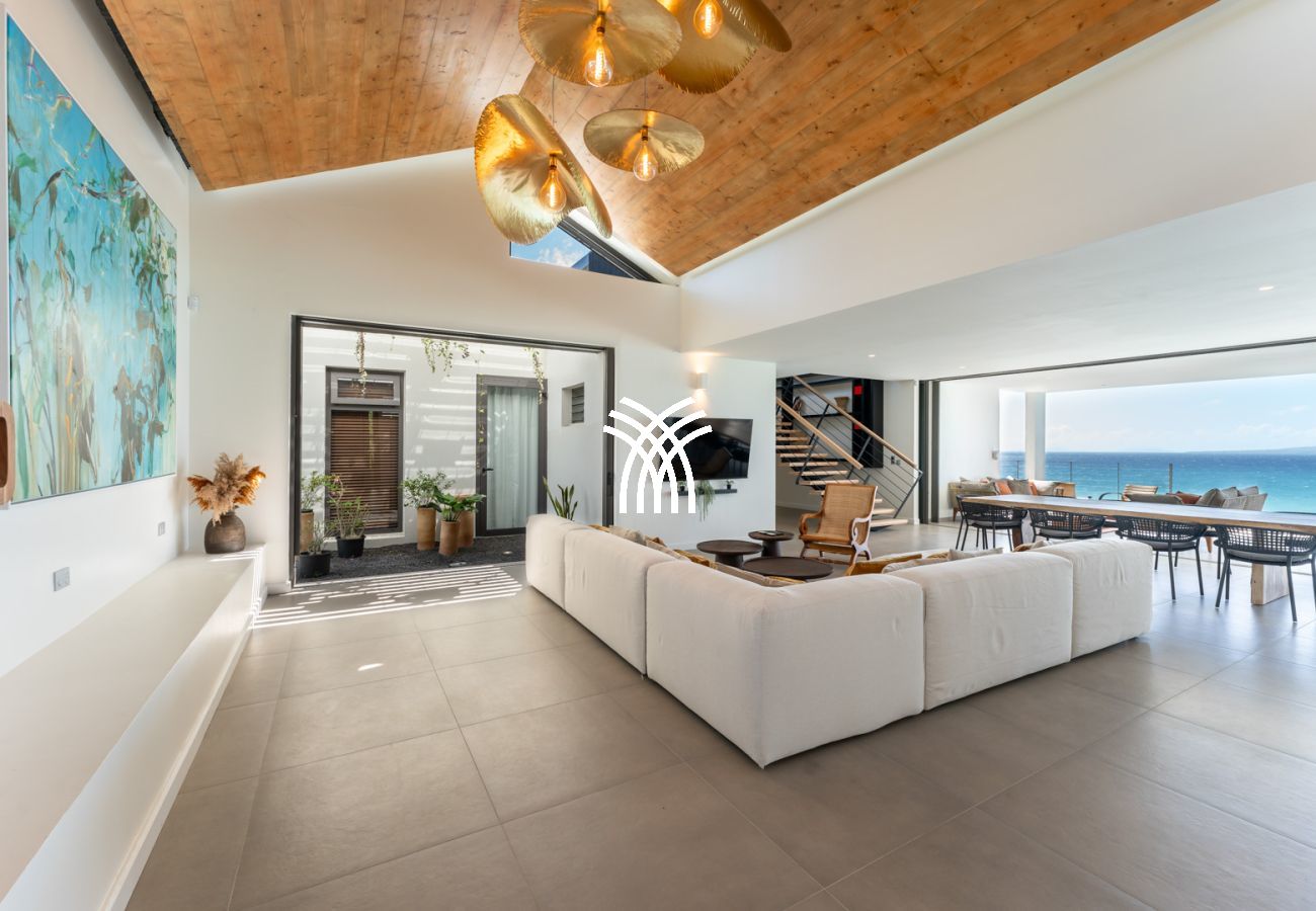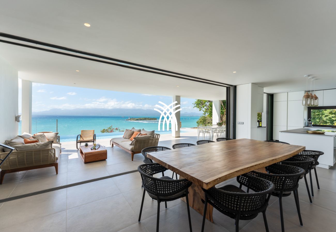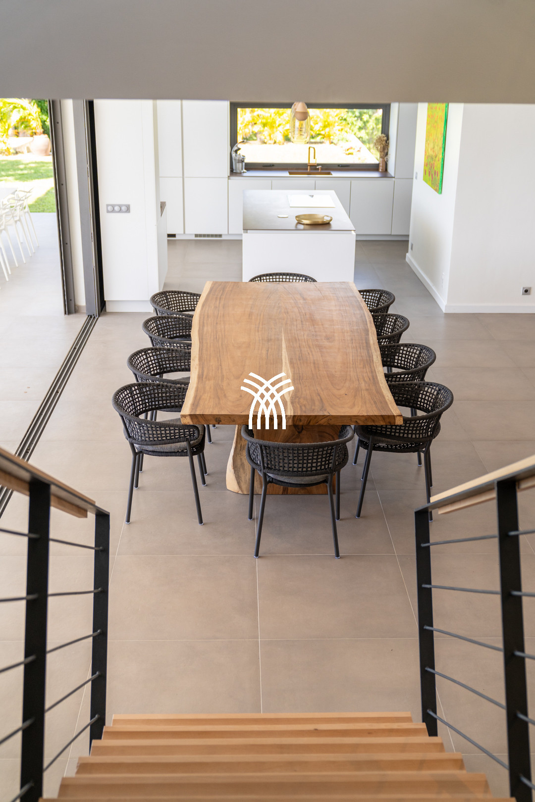 The decor of Villa GwaKana, both chic, sleek, and modern, creates an atmosphere of discreet luxury, making this place exceptionally exclusive. The living room, spacious and bathed in light, with its high vault, is a perfect living space, including a cozy TV lounge with a large corner sofa, ideal for spending time with family or friends. The indoor dining room, a natural extension of the open and fully equipped kitchen, has a solid wood table that can accommodate 10 guests.