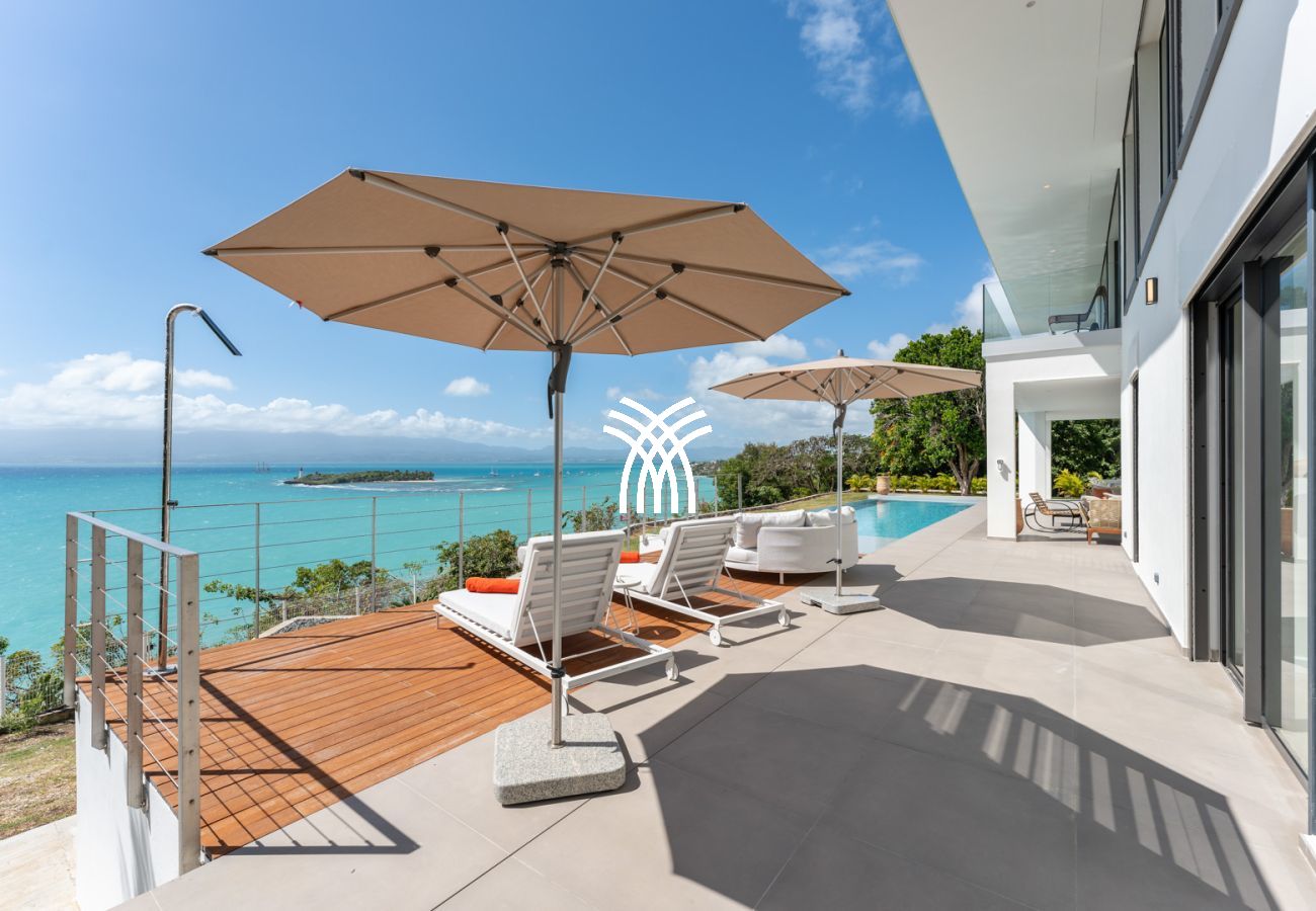 The covered terrace, a true haven of peace, offers a second dining area and a relaxing outdoor lounge, perfect for enjoying an aperitif while admiring the sunset. Next to the infinity pool, a sunbed, deck chairs, and umbrellas invite relaxation and idleness under the tropical sun.