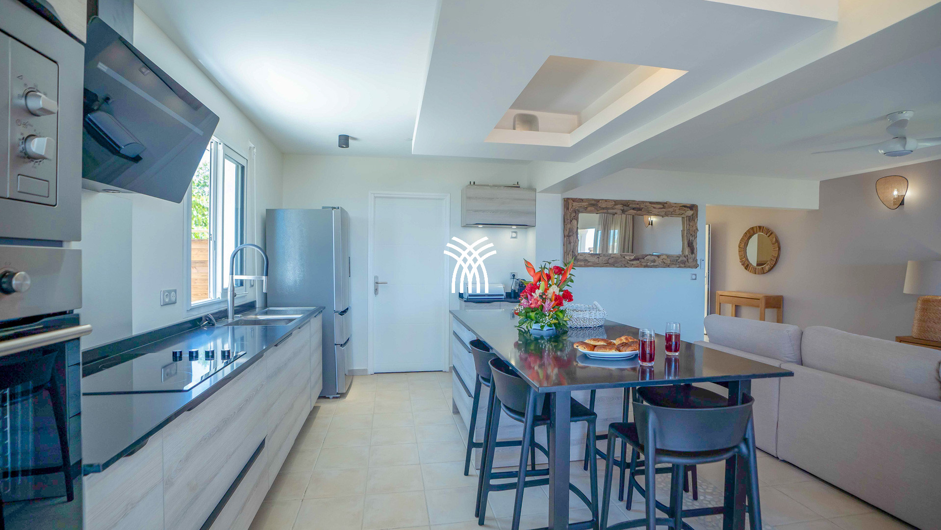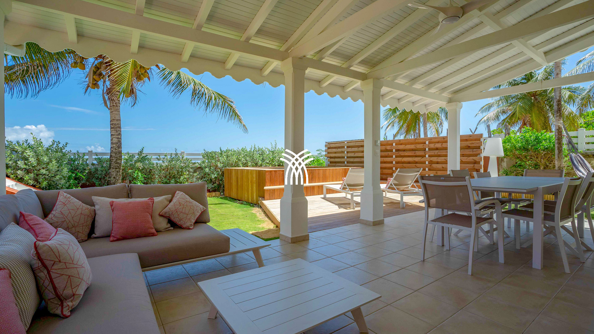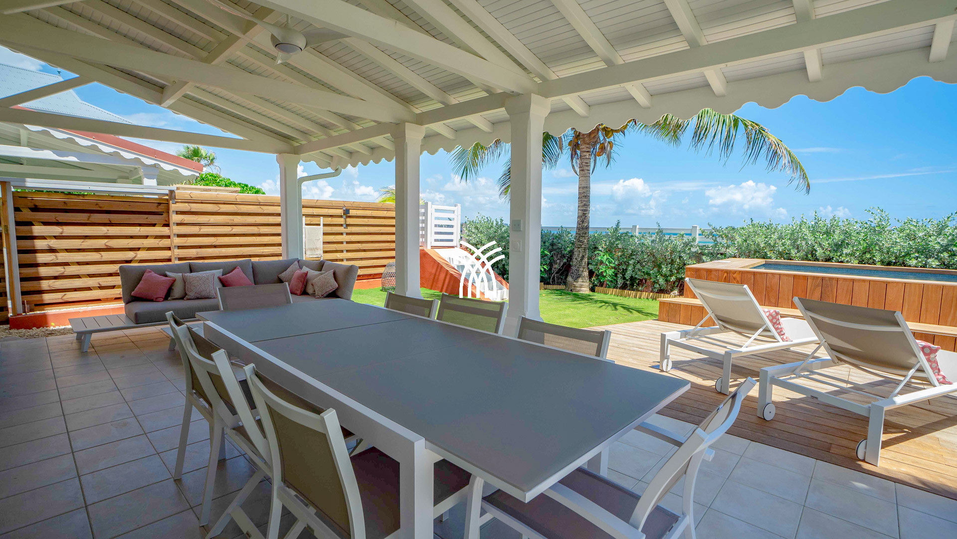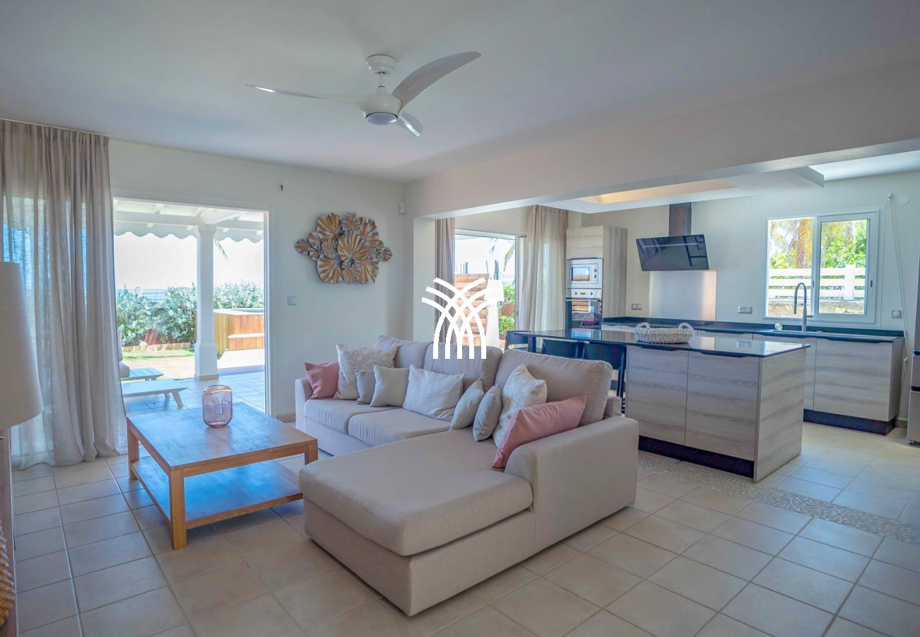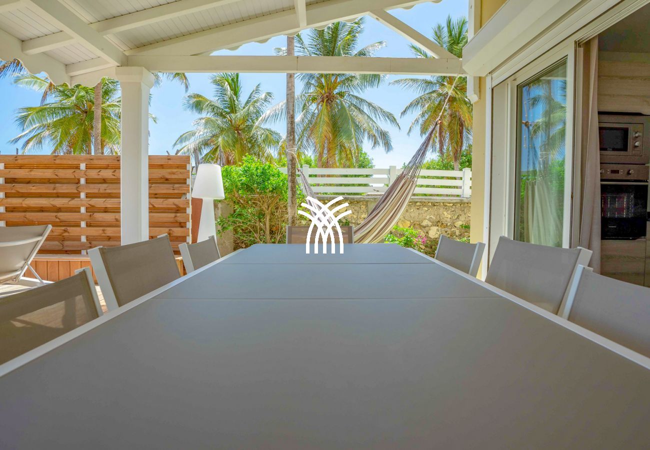 Behind its white shutters and light-bathed facade, the villa opens onto a vast living area extended by a fully equipped modern kitchen, designed for convivial moments. The living room comes alive with conversations, while the large terrace invites outdoor meals under the sea breeze. Further on, a shaded shelter advances towards the garden and the salt-water swimming pool, a true cocoon of freshness where one savours the art of doing nothing between coconut trees and azure reflections.