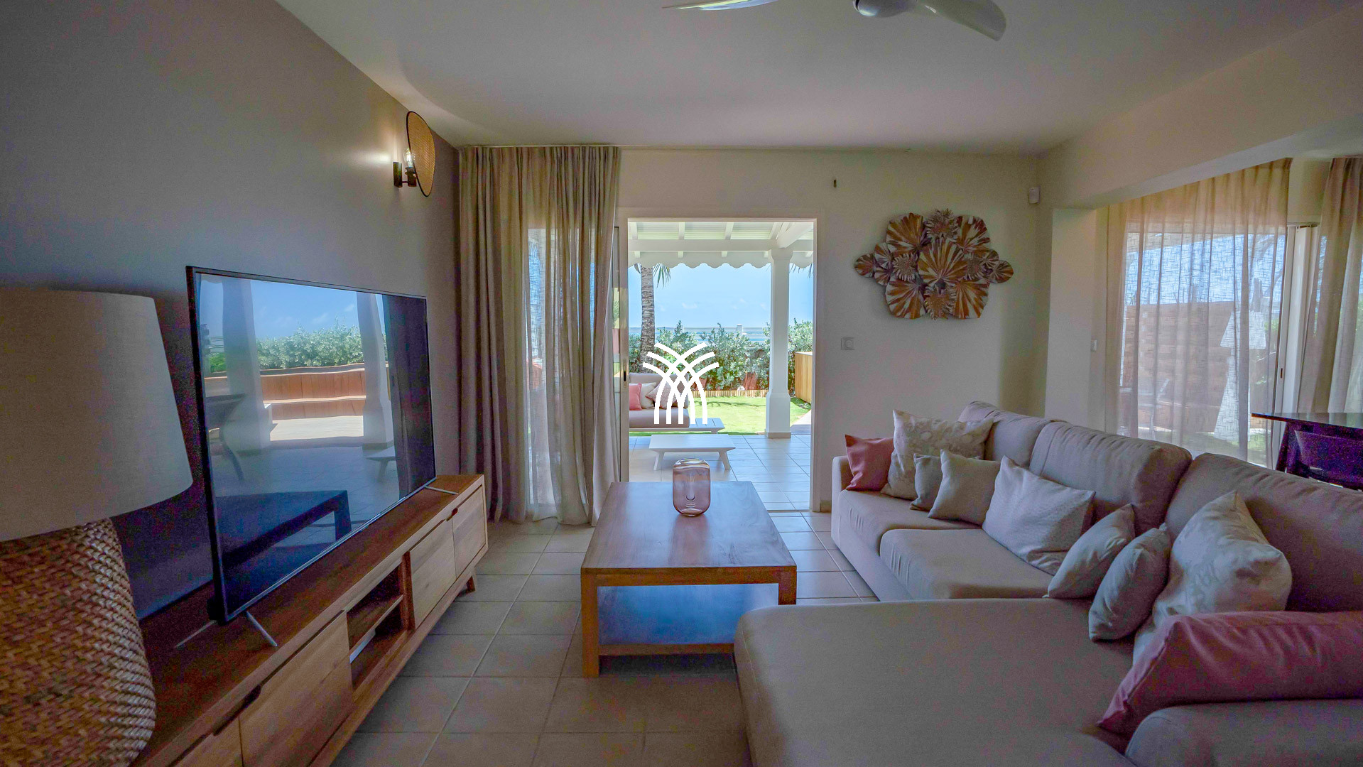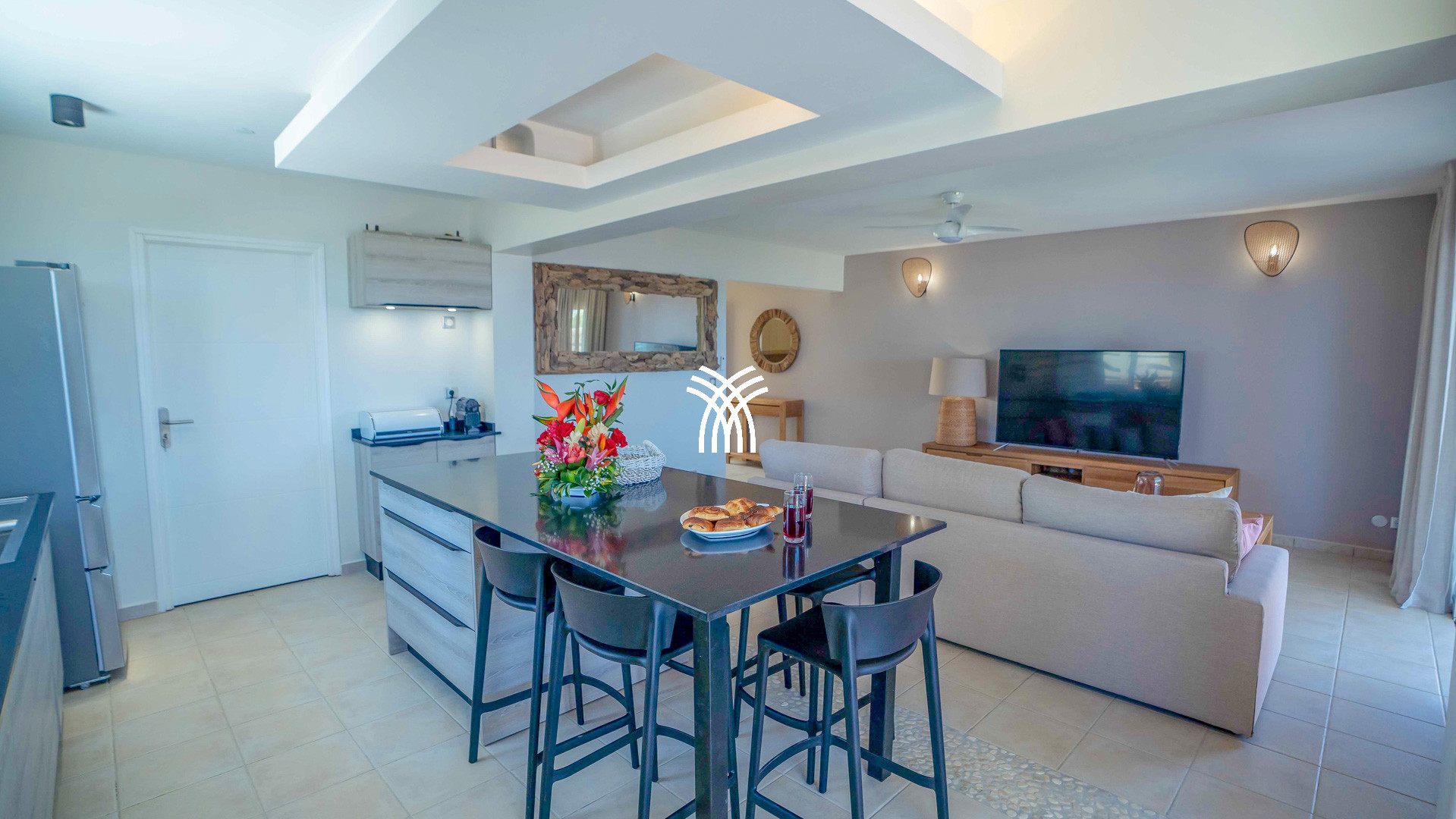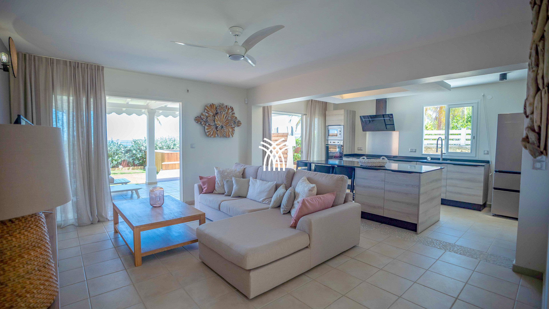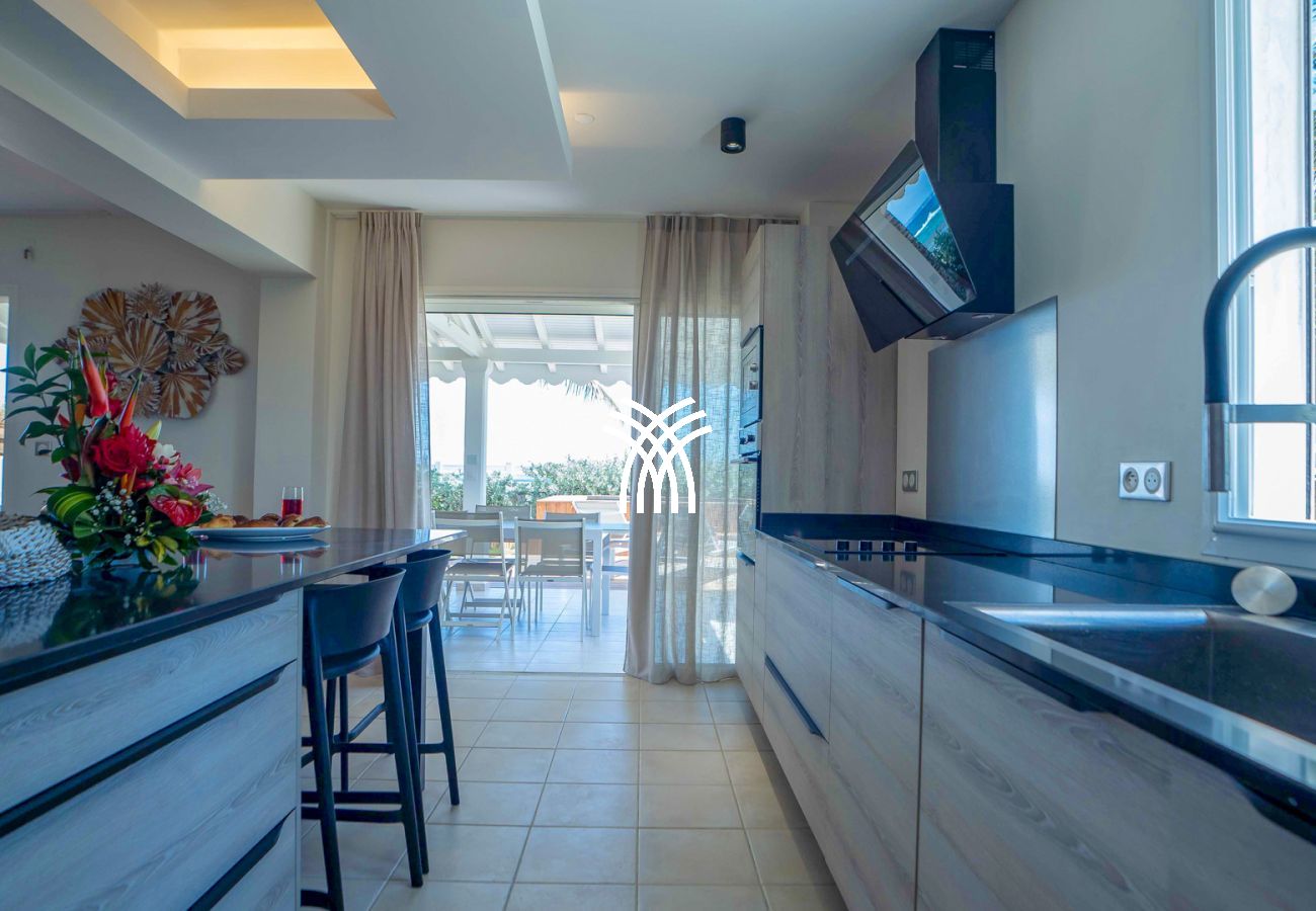 Behind its white shutters and light-bathed facade, the villa opens onto a vast living area extended by a fully equipped modern kitchen, designed for convivial moments. The living room comes alive with conversations, while the large terrace invites outdoor meals under the sea breeze. Further on, a shaded shelter advances towards the garden and the salt-water swimming pool, a true cocoon of freshness where one savours the art of doing nothing between coconut trees and azure reflections.
