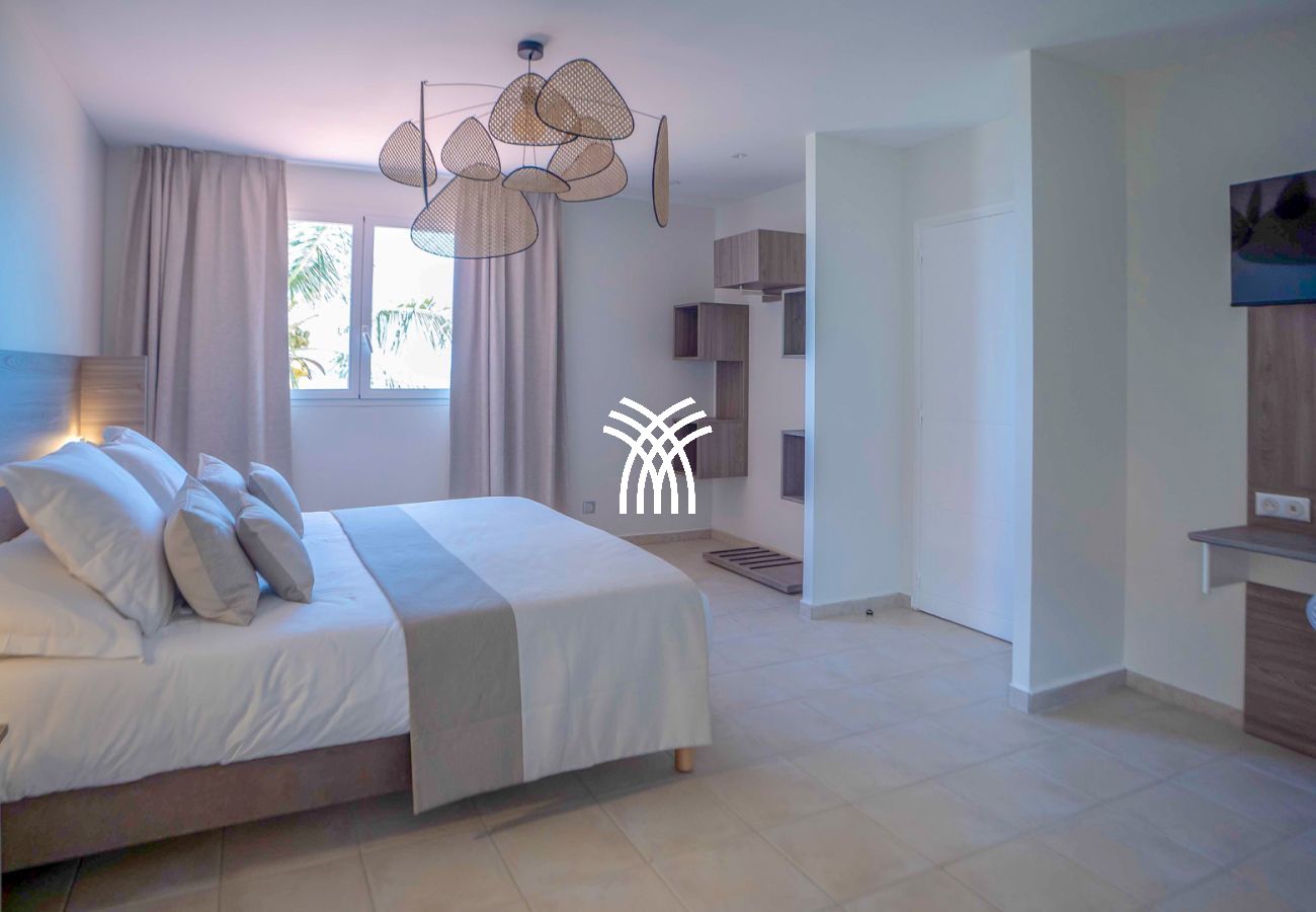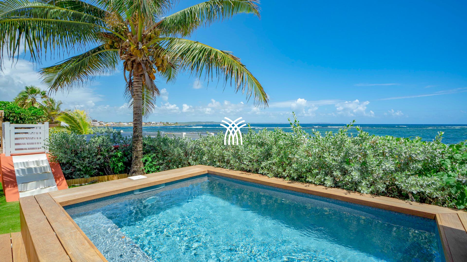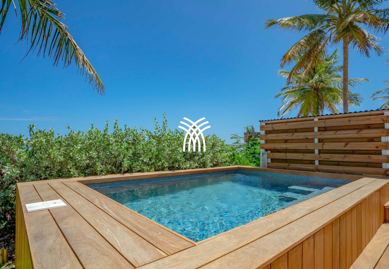 From the entrance, Villa Paloma reveals an open living space, bathed in light, where natural materials, soothing tones and tropical art of living blend together. The modern, fully equipped kitchen extends the convivial living area and invites you to prepare delicious meals shared on the outdoor terrace. The intimate garden, lined with coconut trees, features a beautiful salt water pool and a shaded shelter to savour Guadeloupe in complete tranquillity, between relaxation, aperitifs and sunsets over the marine horizon.