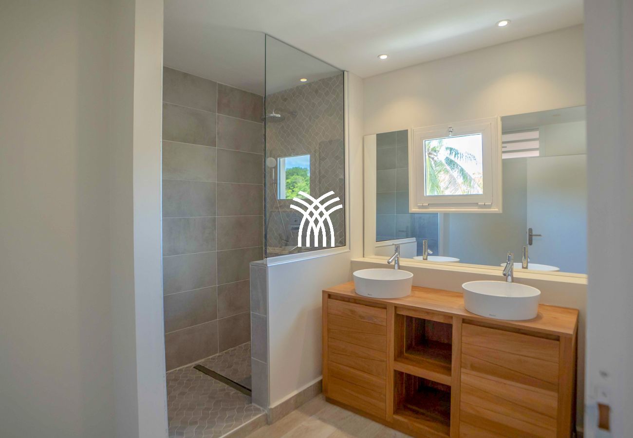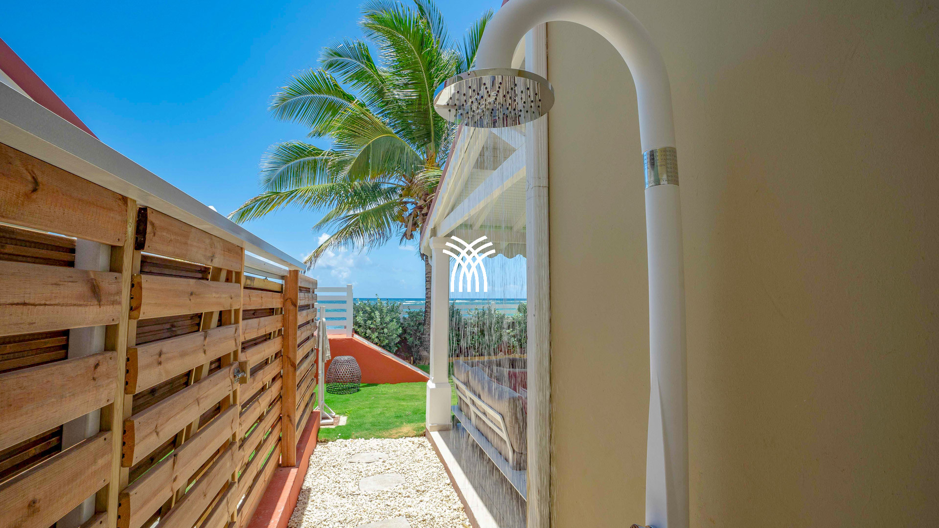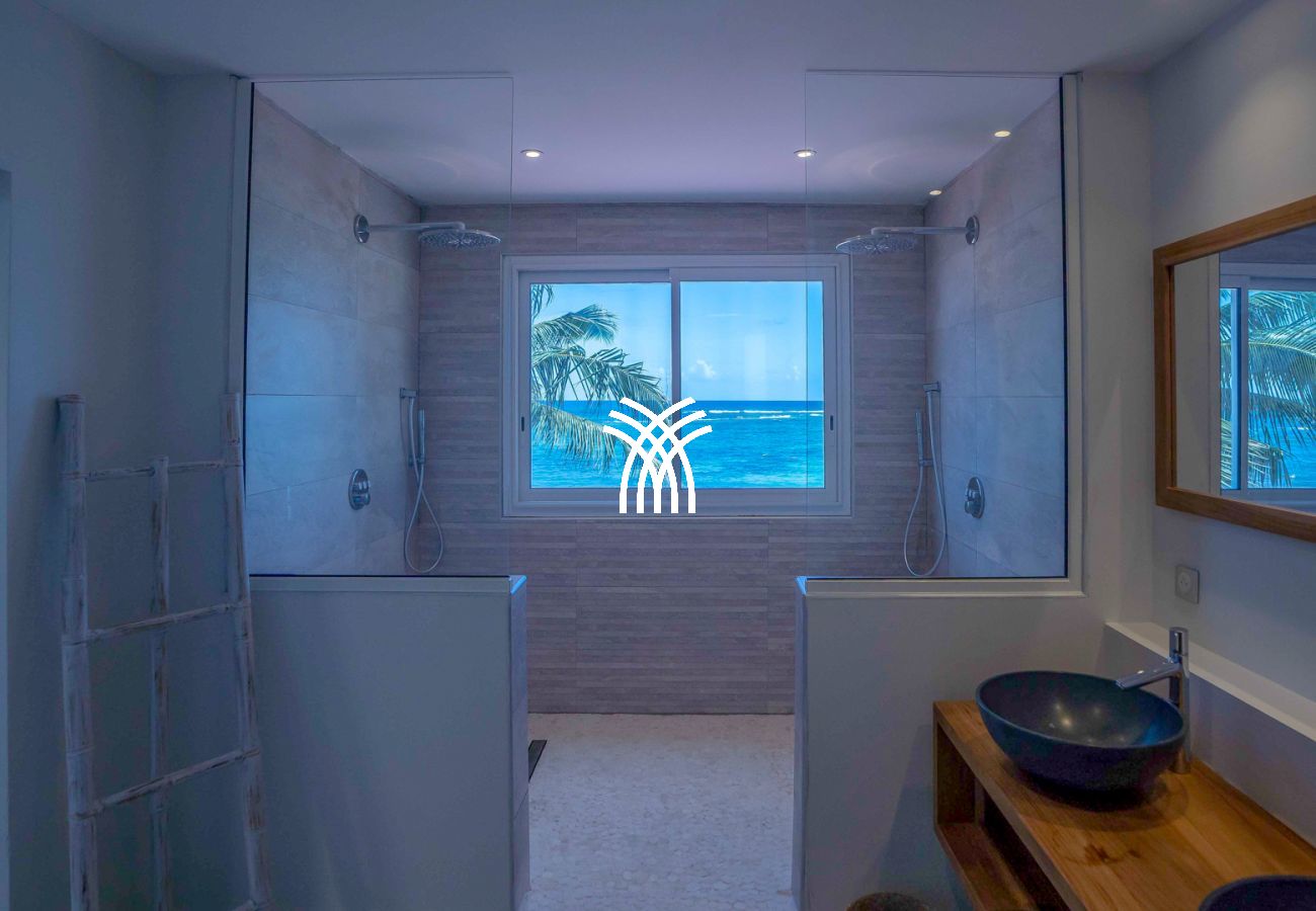 Outside, everything is designed for sensory pleasure: a punch bowl to refresh yourself at any time, an outdoor shower to relax after the beach, a gas barbecue for your Caribbean evenings, and sun loungers arranged under the sun to admire the changing shades of the sky. Every detail has been carefully imagined to make this luxury villa in Guadeloupe a living space that is both elegant and warm.