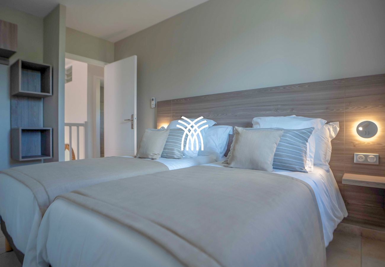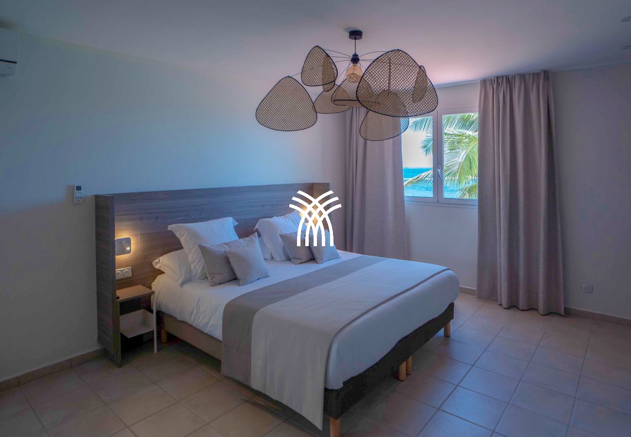 This luxury villa in Le Moule has four air-conditioned bedrooms spread across two levels, all carefully decorated to offer comfort and privacy. The main suites, with king-size beds and adjoining bathrooms, offer superb sea or garden views. The additional rooms, which can be configured as single or double beds, are perfectly suited to families or groups of friends. The entire space forms a welcoming cocoon, designed to accommodate up to eight people in a setting that is both modern and warm.