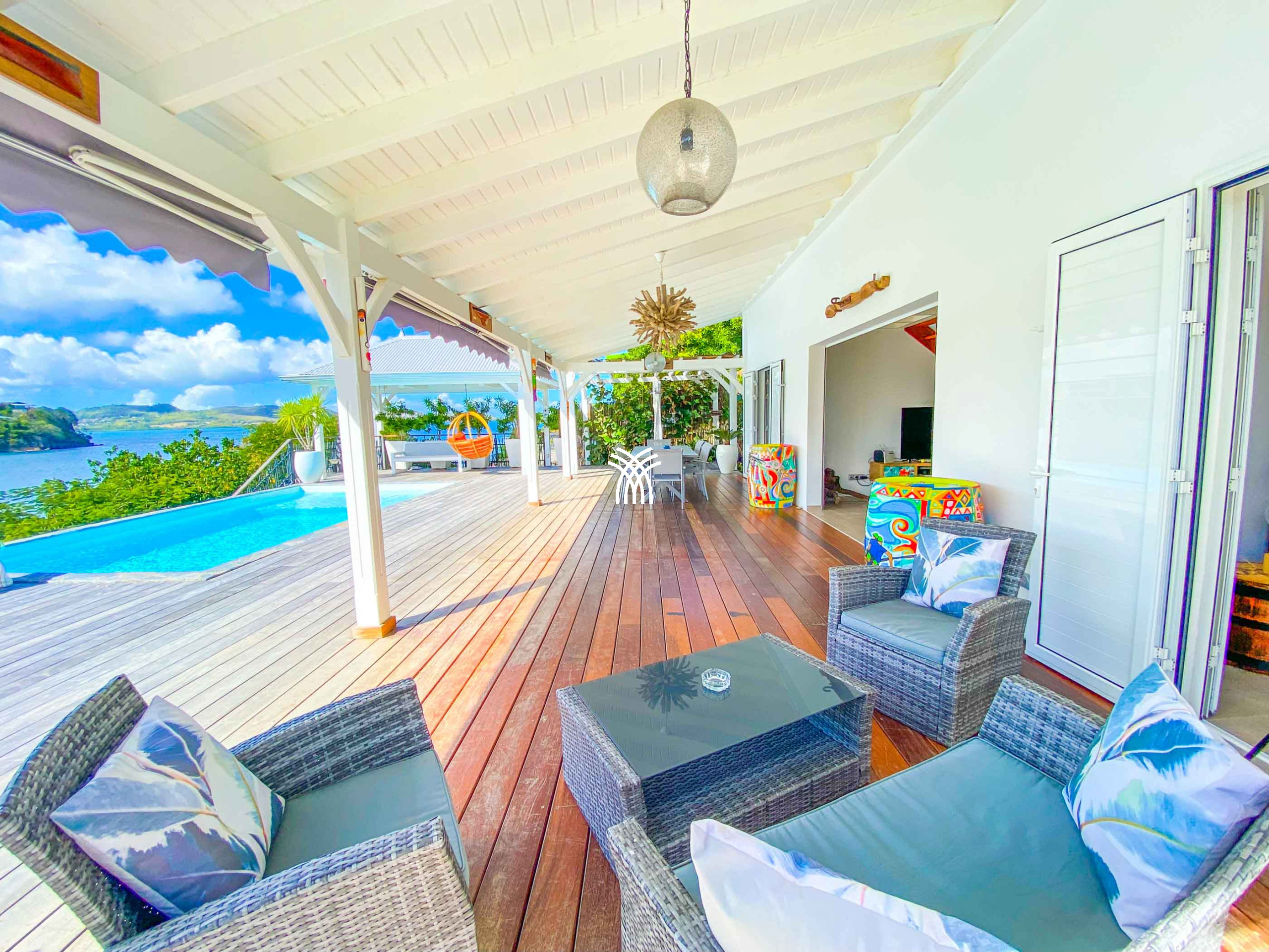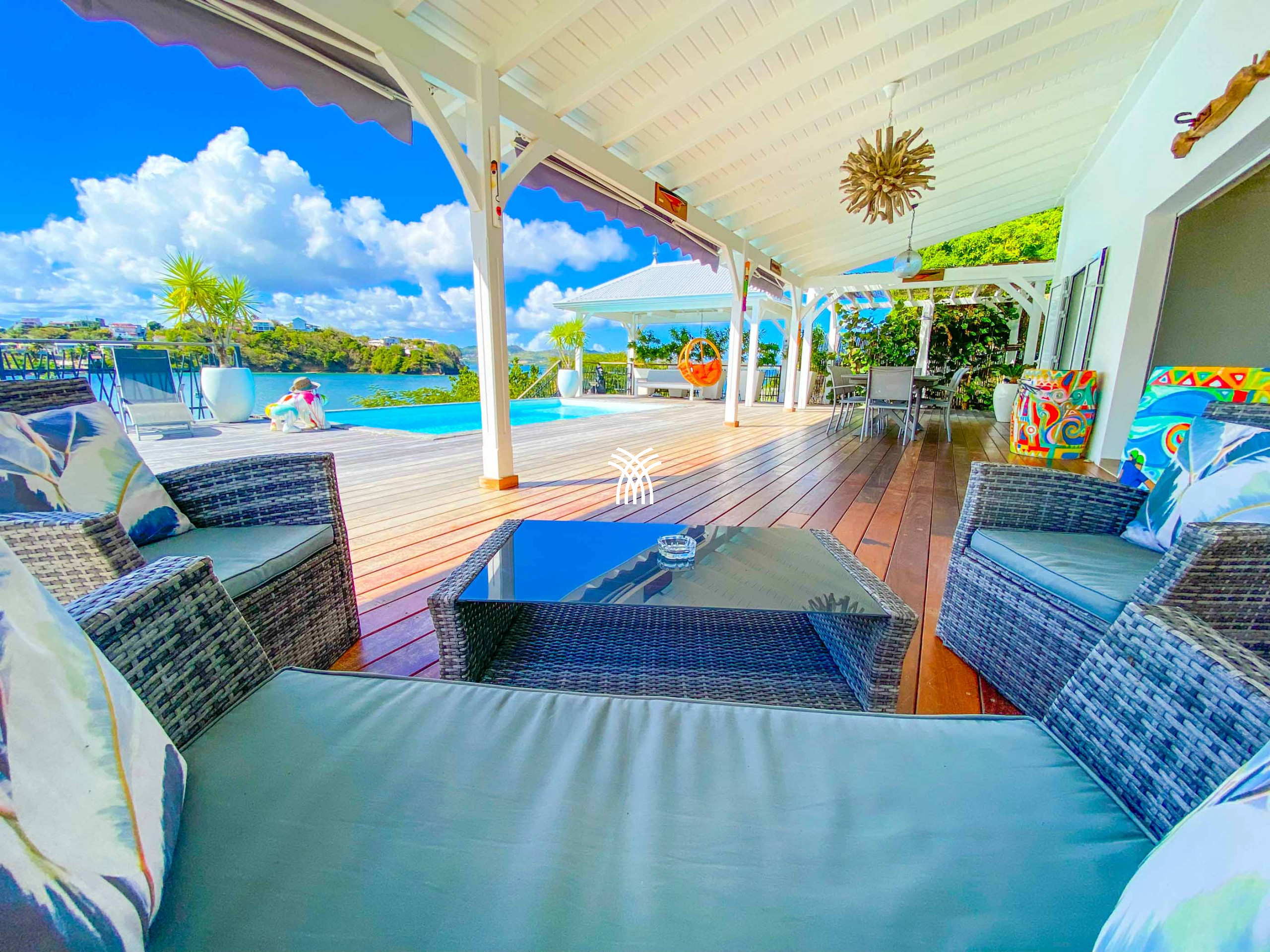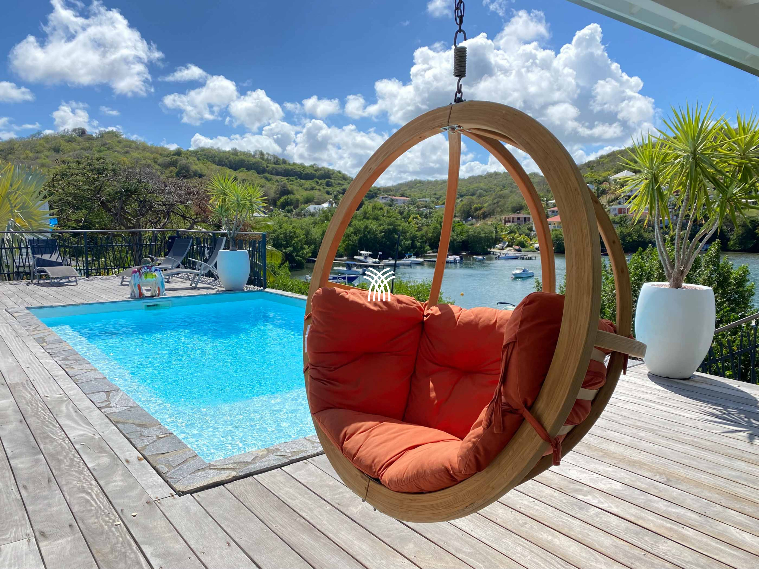 Suspended as if between sky and sea, Villa Oliver invites you to a total immersion in Caribbean nature. Its vast 150 m² landscaped terrace, overlooking the ocean, becomes the heart of the house, a living space in its own right where each moment is savoured facing the horizon. Below, a private pontoon allows direct access to the sea, while three kayaks are made available to explore the islets and navigate through turquoise waters. Naturally ventilated by the trade winds and entirely oriented towards the sea, this luxury villa for rent in Martinique offers a sensation of freedom and absolute serenity.