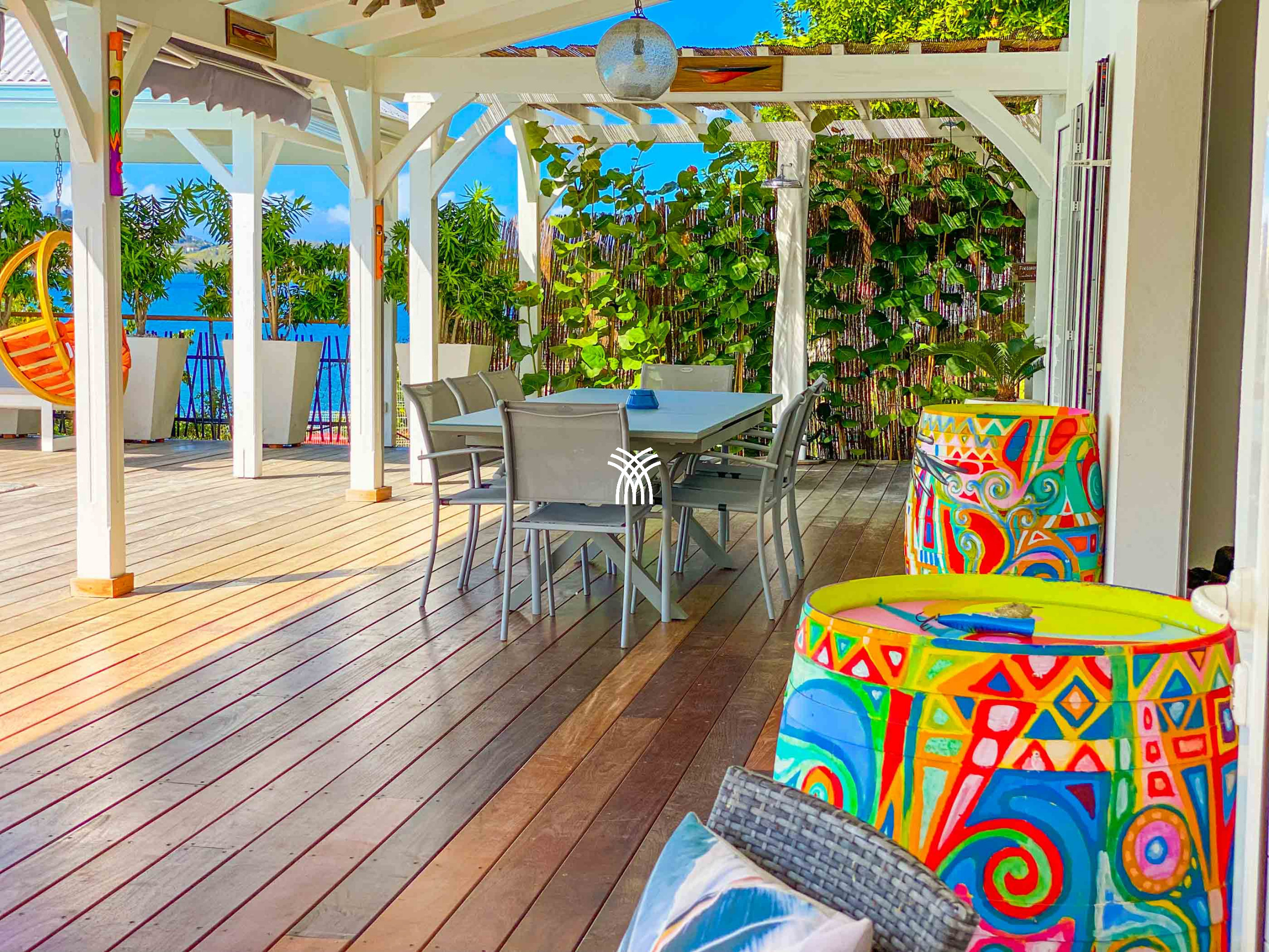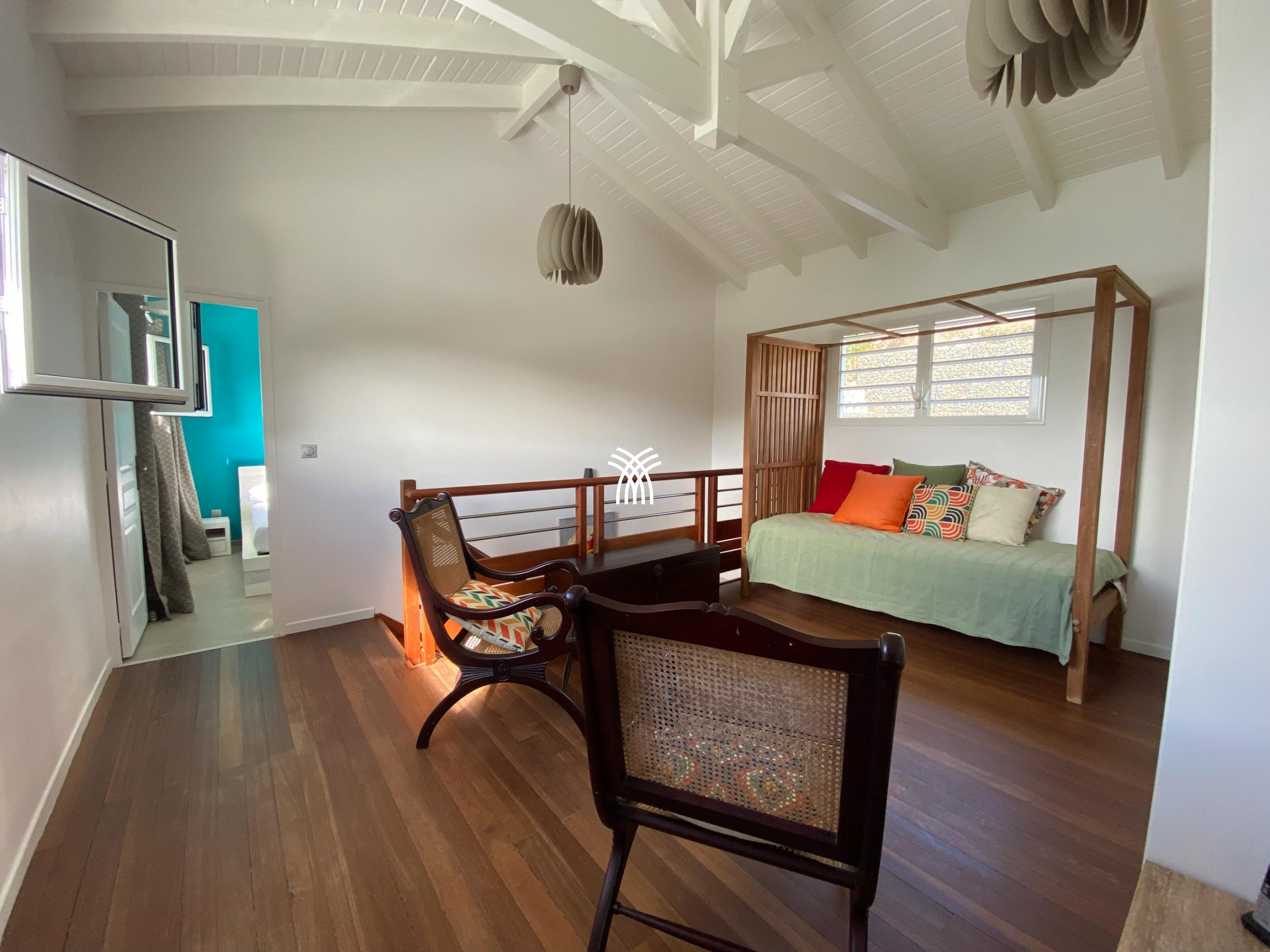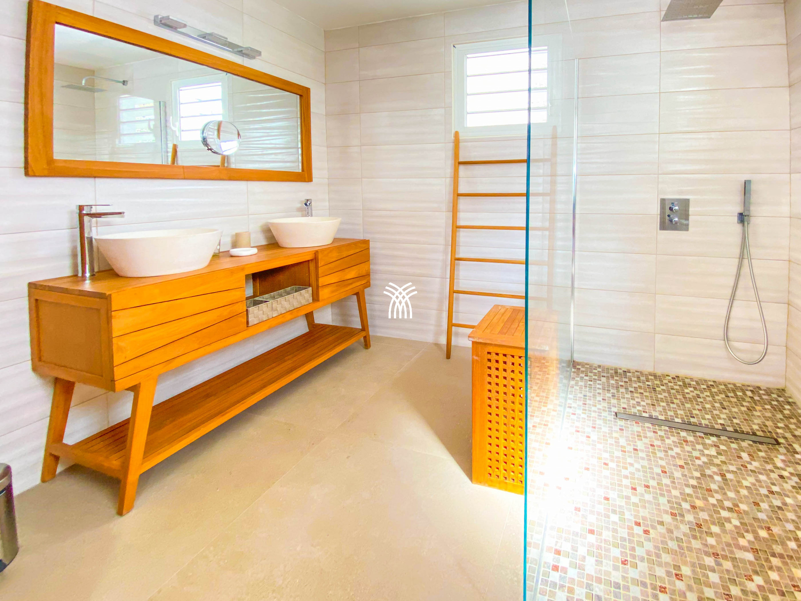 The interiors of the villa have been designed with a contemporary and refined spirit, subtly enriched by works by Caribbean artists. This alliance gives Villa Oliver an elegant and warm atmosphere, where each room dialogues with the exterior through large openings offering a permanent sea view, a true living painting in motion.