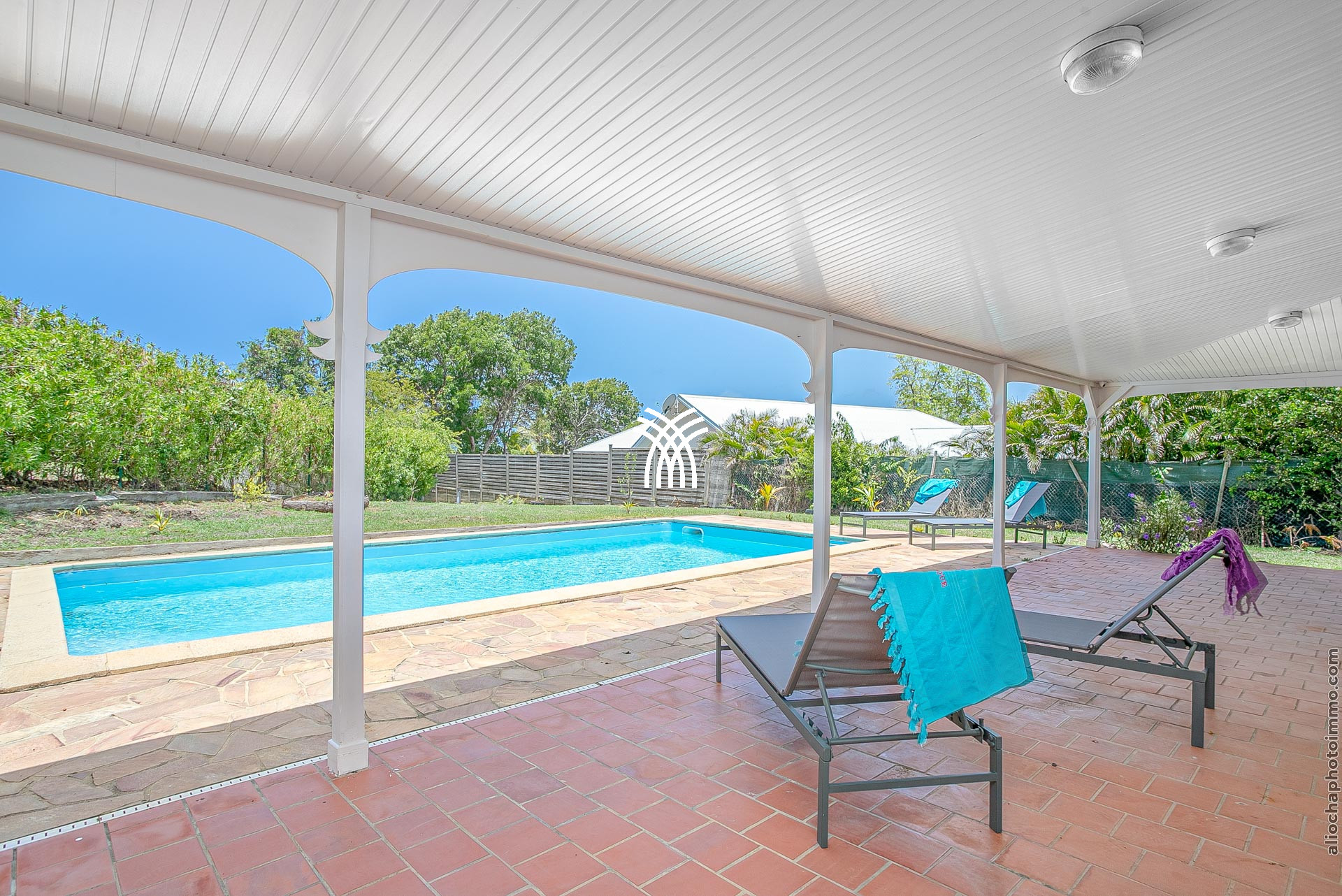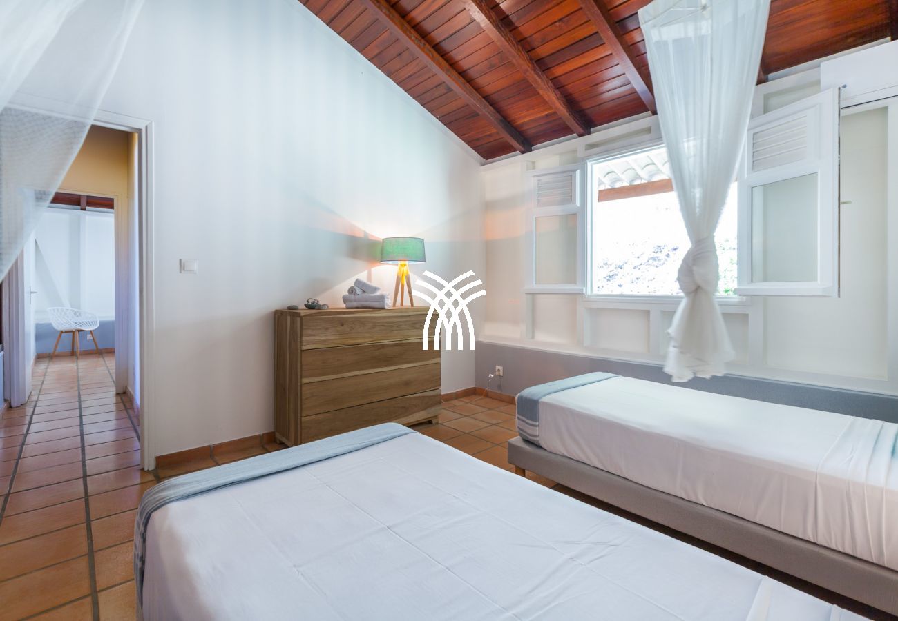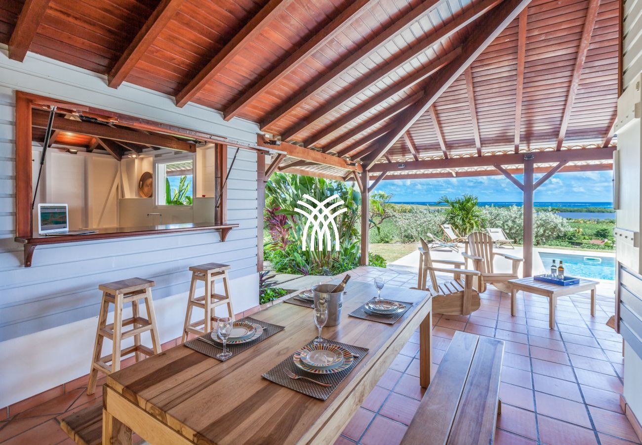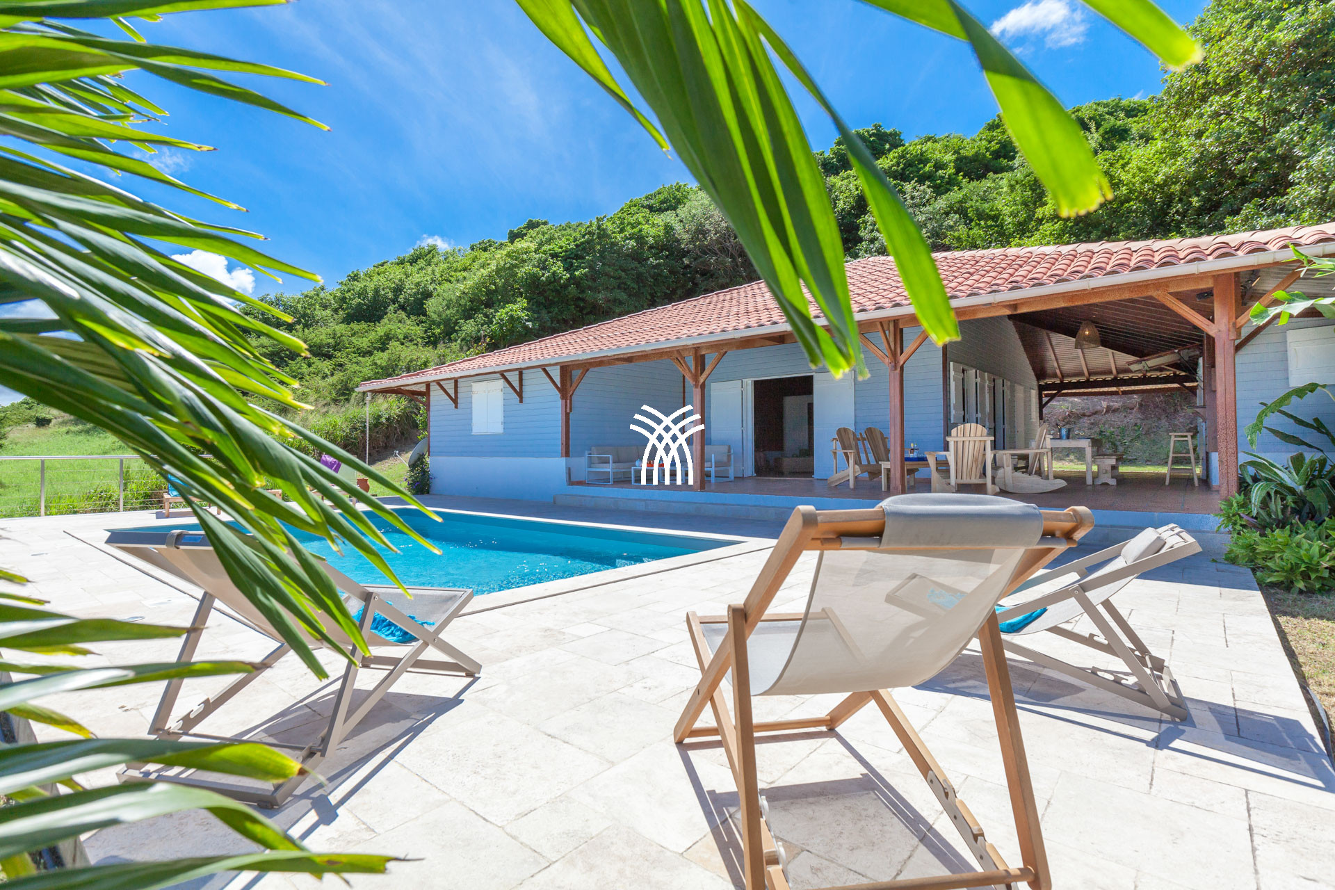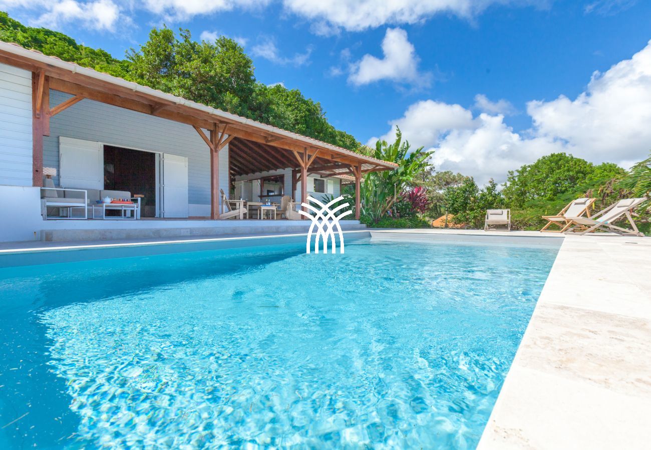 Outside, the vast terrace is the heart of the villa. Framed by lush vegetation, it transforms into a true outdoor living and dining room, perfect for enjoying meals in complete conviviality or relaxing to the rhythm of the trade winds. In the centre of the garden, the pool invites delightful moments of relaxation, offering an ideal space to cool off and recharge.