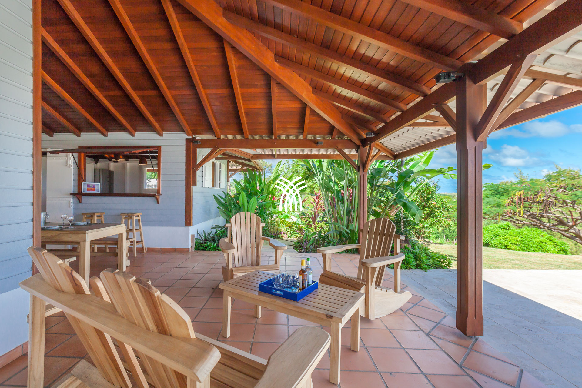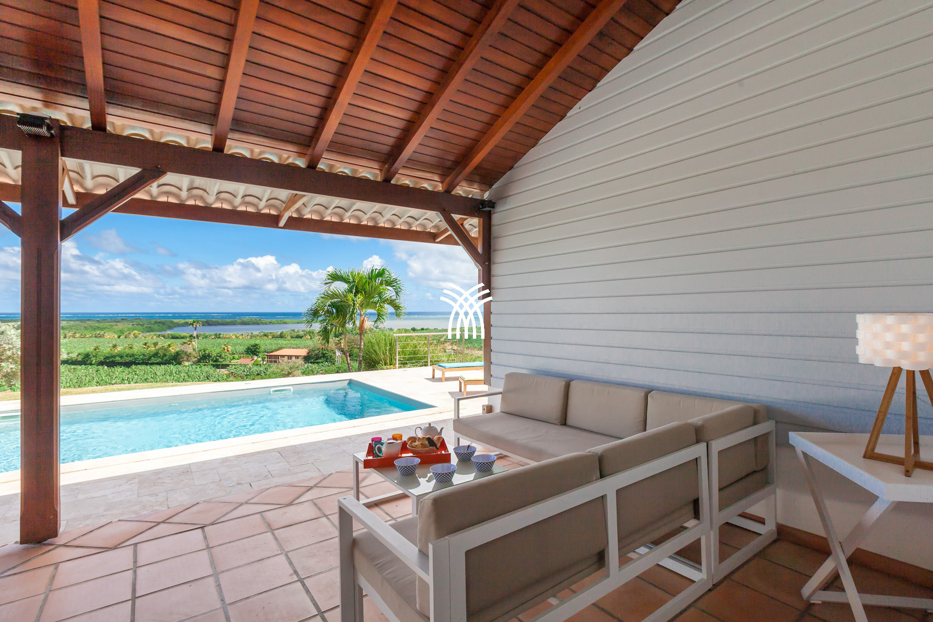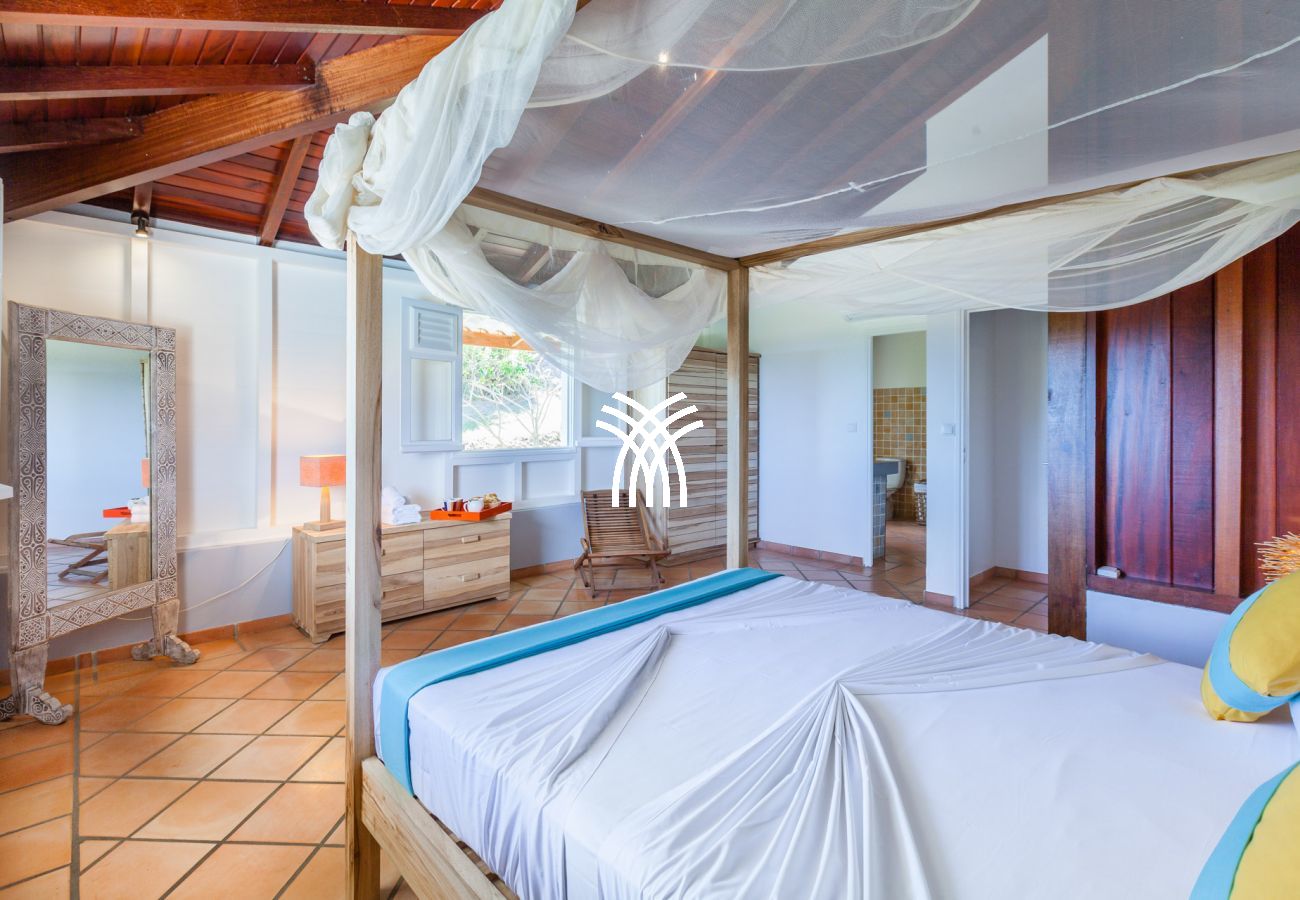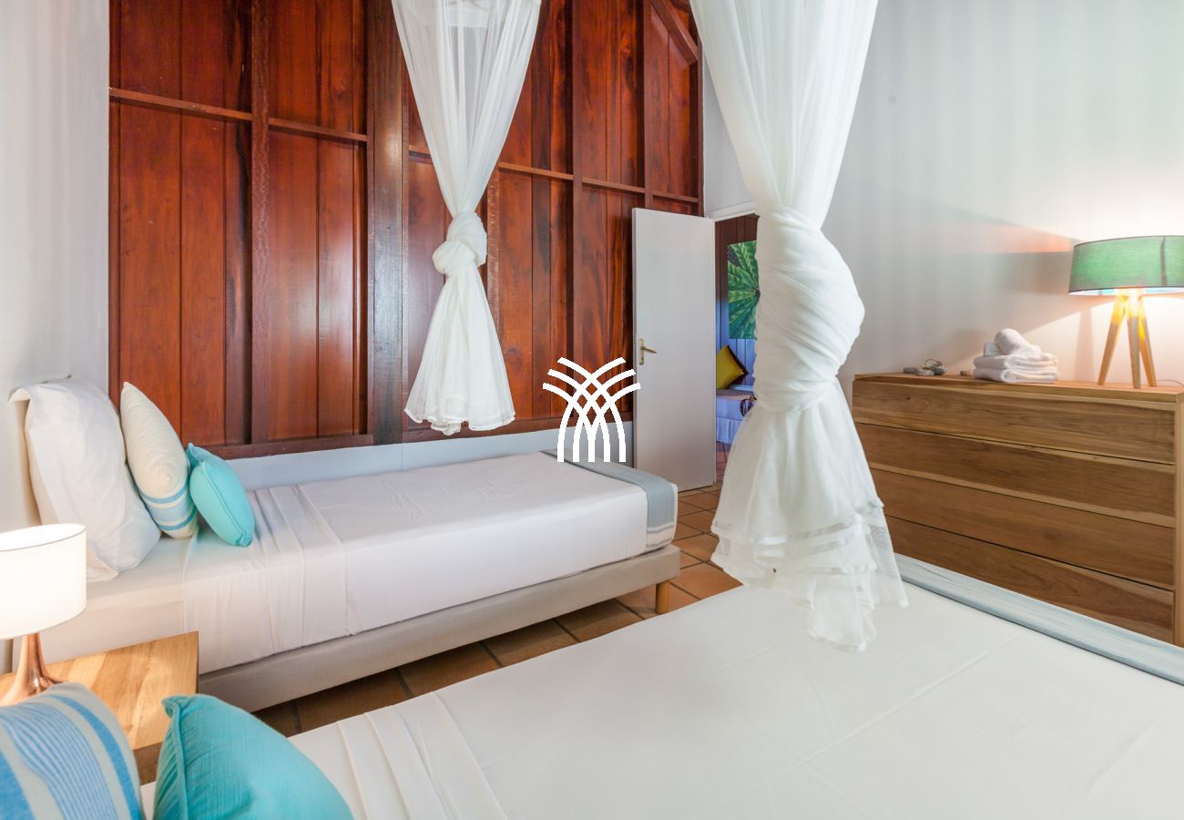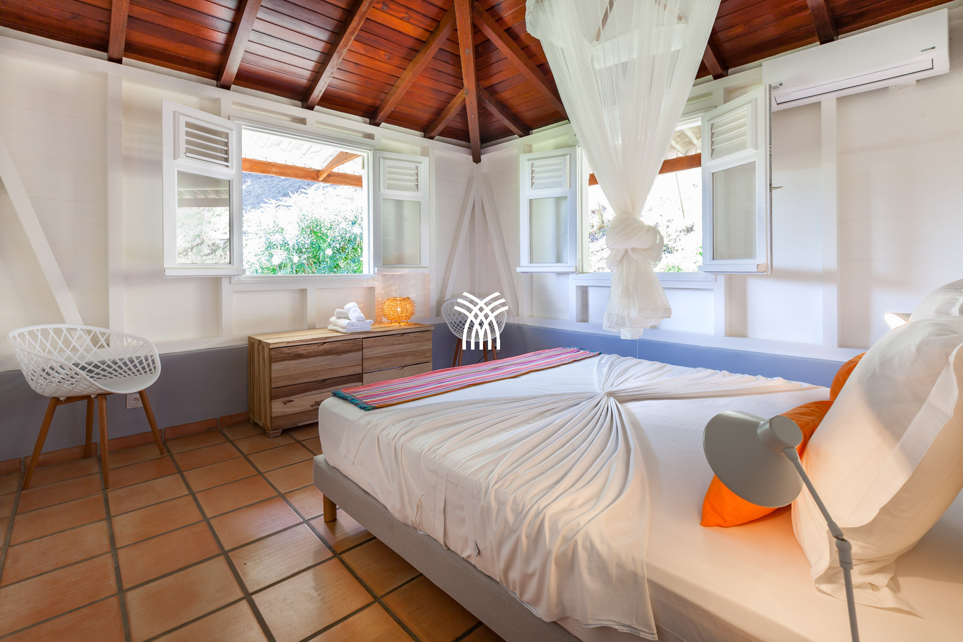 Outside, the vast terrace is the heart of the villa. Framed by lush vegetation, it transforms into a true outdoor living and dining room, perfect for enjoying meals in complete conviviality or relaxing to the rhythm of the trade winds. In the centre of the garden, the pool invites delightful moments of relaxation, offering an ideal space to cool off and recharge.
