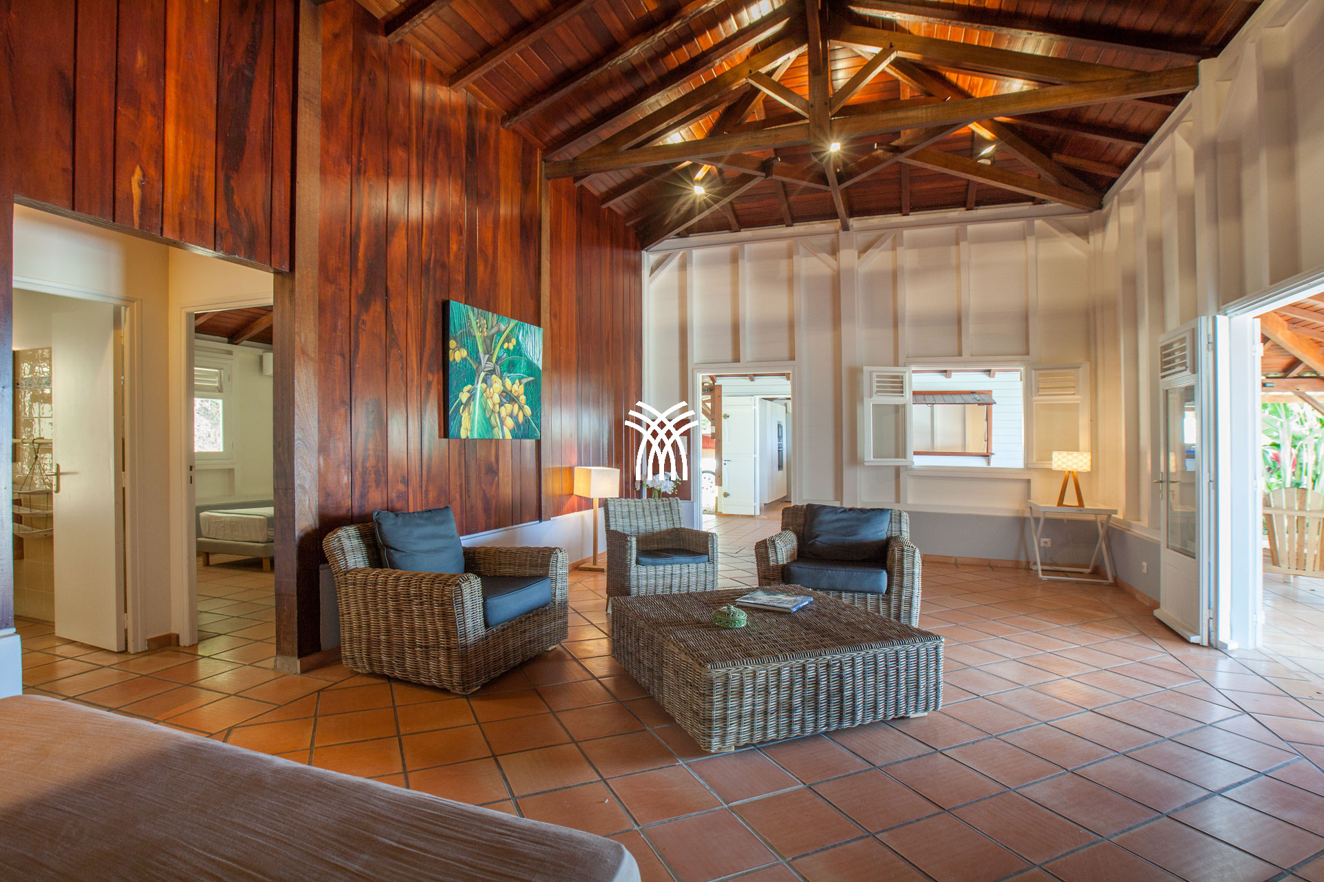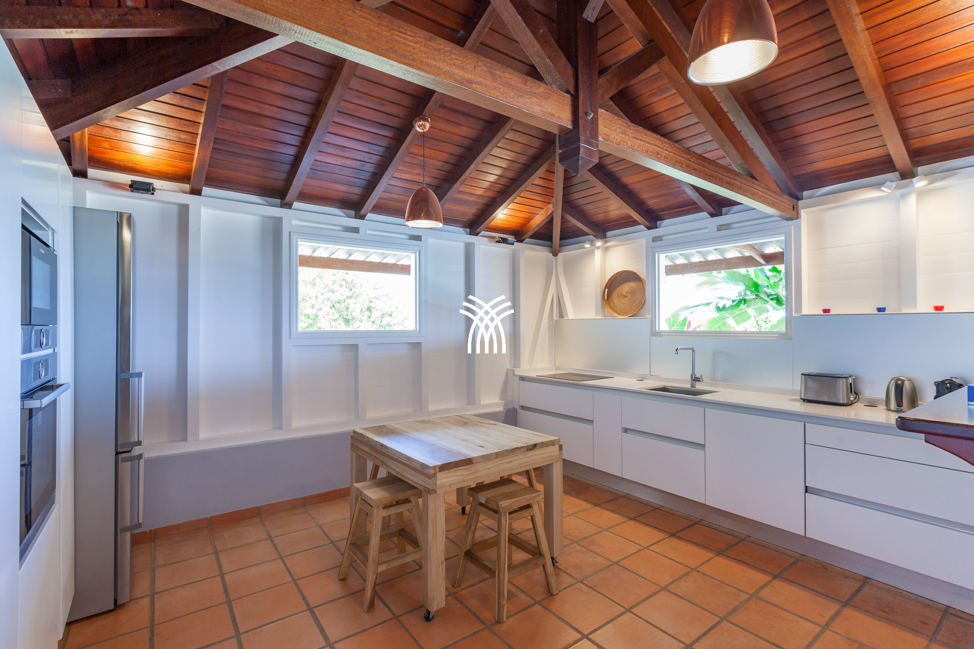 Designed for those seeking a luxury villa rental in Vauclin, Villa Azura seduces with its subtle architecture that elegantly blends traditional Creole codes with a modern and refined aesthetic. Warm wood, design furniture lines, and light flooding the rooms through shutters and bay windows create an atmosphere both sophisticated and welcoming. Generous volumes, exposed framework, and careful finishes highlight the property's unique character.