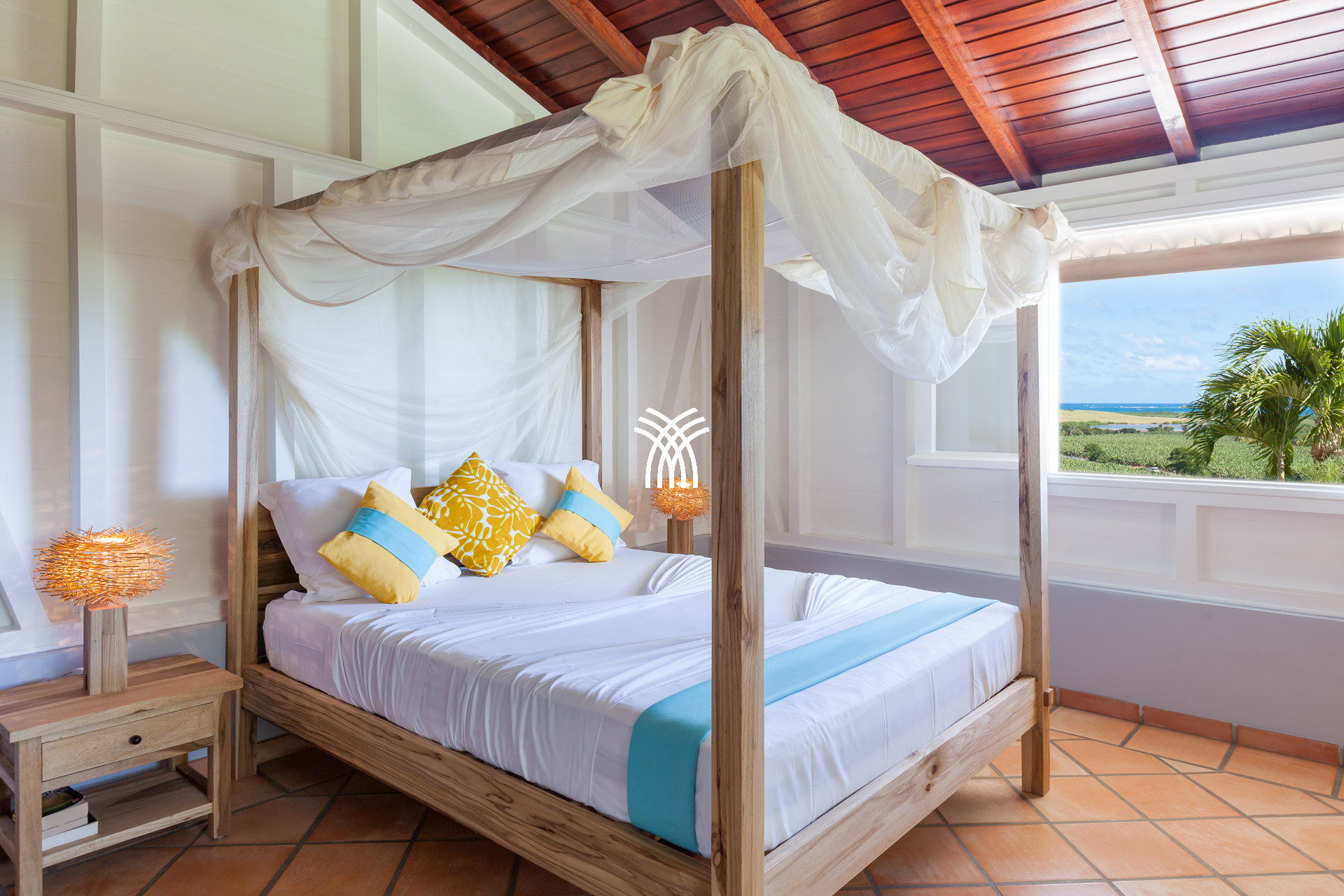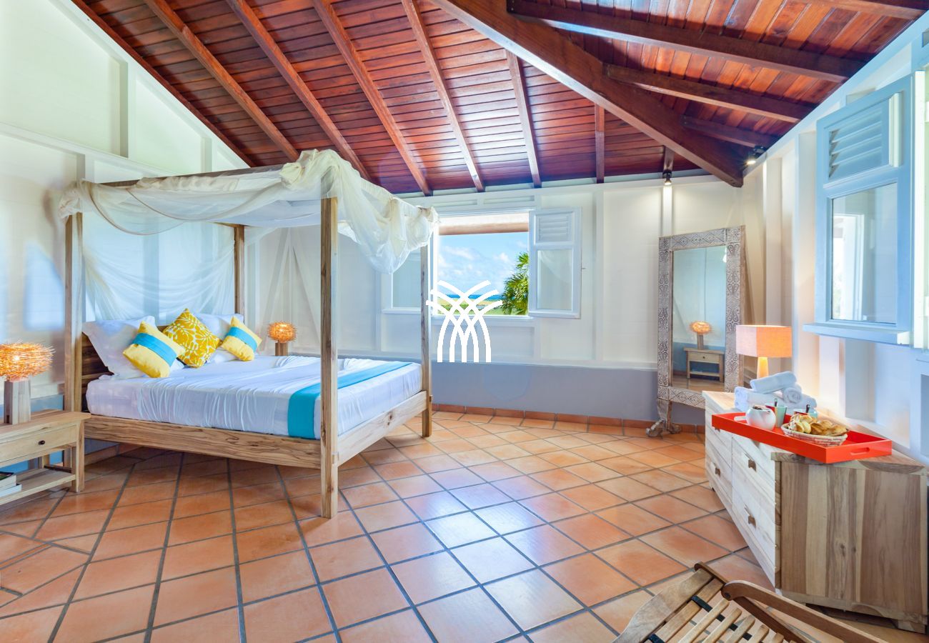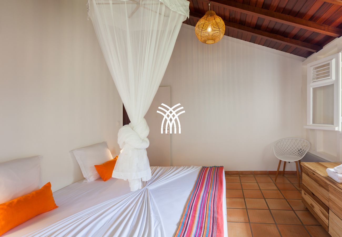 Queen size canopy bed, air conditioning, bathroom with sink and separate toilet, wardrobe, chest of drawers, mosquito net, terrace access, sea view