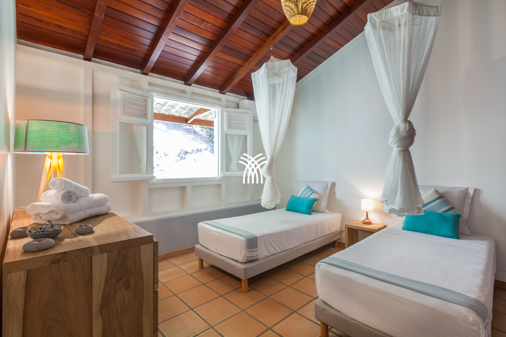 Twin beds 2x90x190, air conditioning, bathroom with shower and toilet, wall cupboard and chest of drawers, mosquito net, countryside view