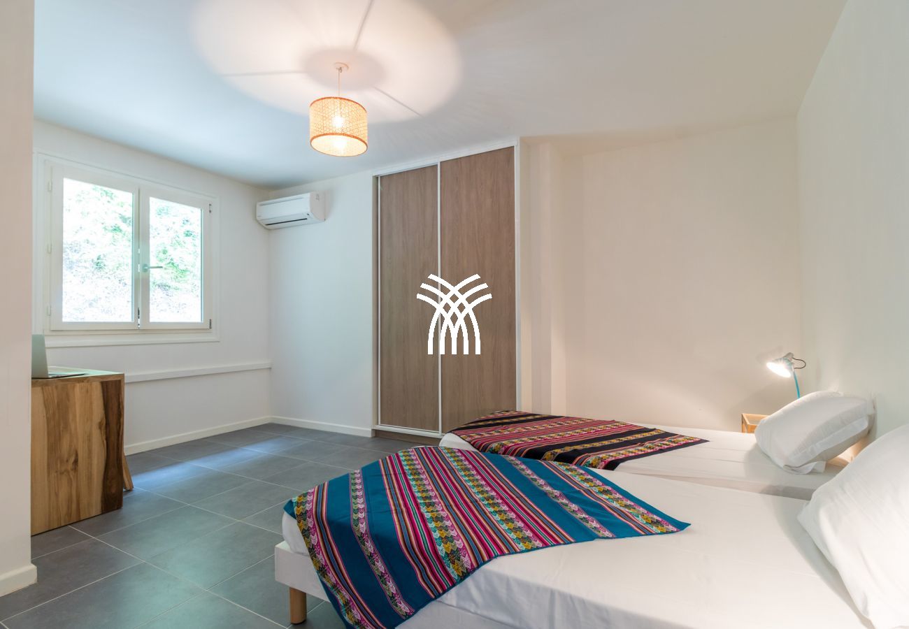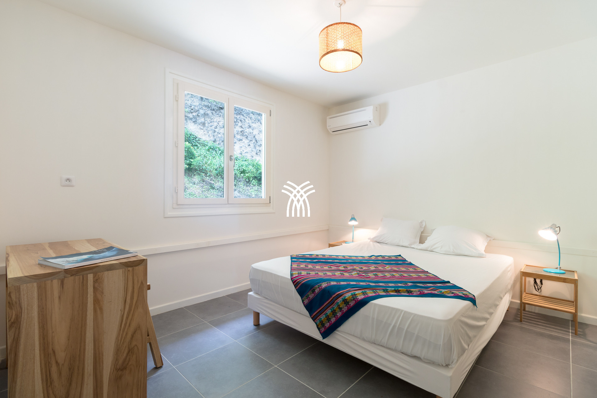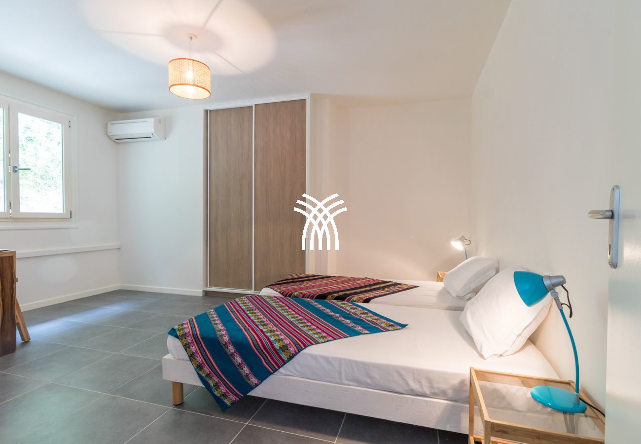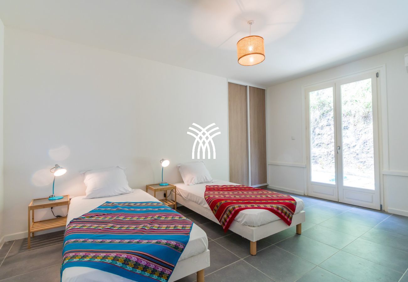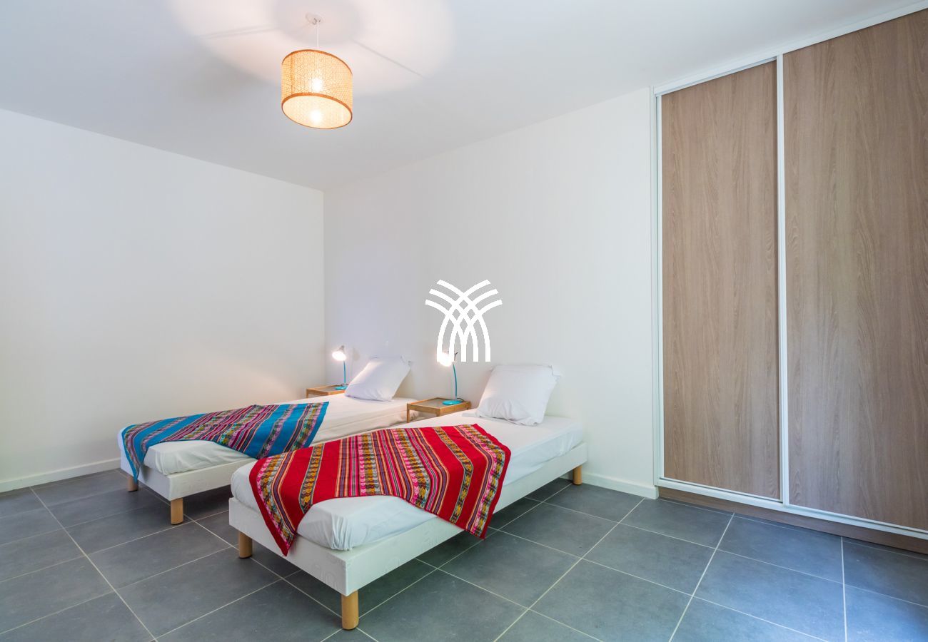 Facing the sea, the living room, kitchen, and dining area provide a spectacular view of the horizon, where the pool, sky, sea, and surrounding nature come together seamlessly. Villa Moon accommodates up to thirteen guests across two suites, a double room, a family room, and a mezzanine. The master suite, with its refined decor, opens onto the terrace. This room, with its 160x200 bed, bedside tables, desk, and television, offers a direct sea view. The en-suite bathroom features an Italian shower, double sink, and separate toilet. The second suite, embraced by tropical greenery, exudes a serene and feminine ambiance with a 180x200 bed, desk, and private bathroom with shower and toilet. The family room, located on the garden side, provides five beds: a 160x200 bed, two 90x190 bunk beds, and a single bed. The fourth room, featuring a colonial-style four-poster bed (180x200), shares a spacious bathroom with the family room, equipped with two showers and two sinks. Additional sleeping arrangements are available on the mezzanine with a sofa bed.