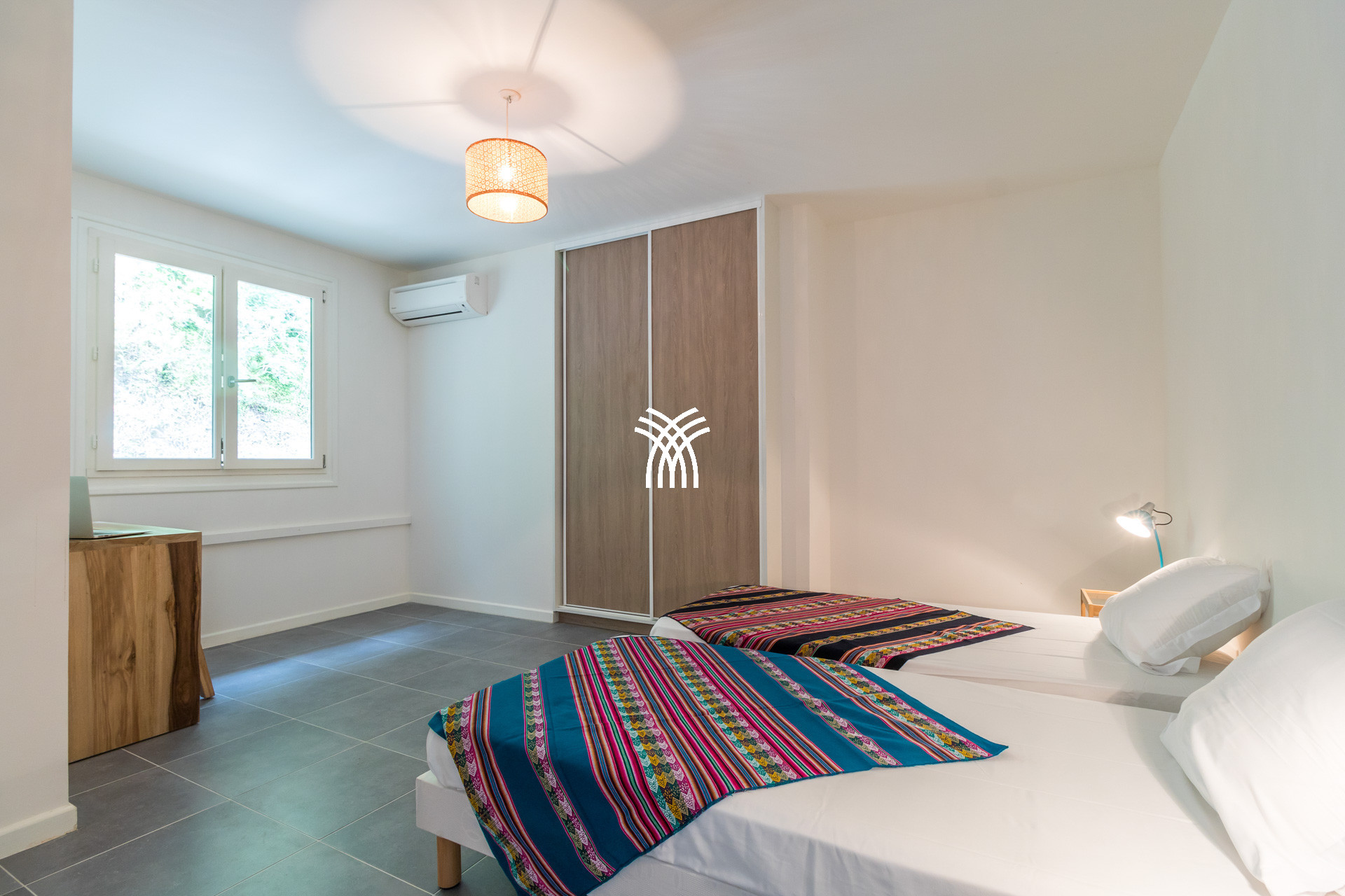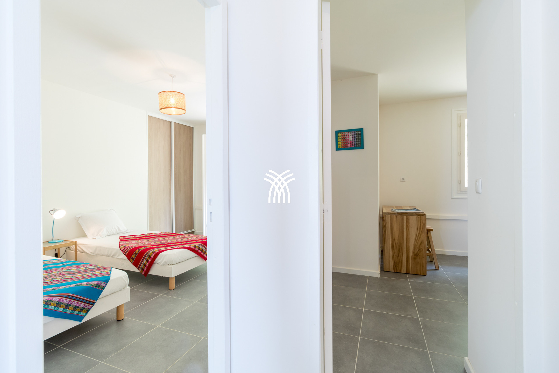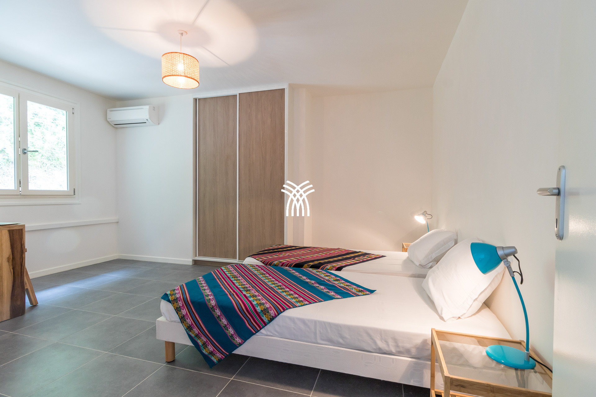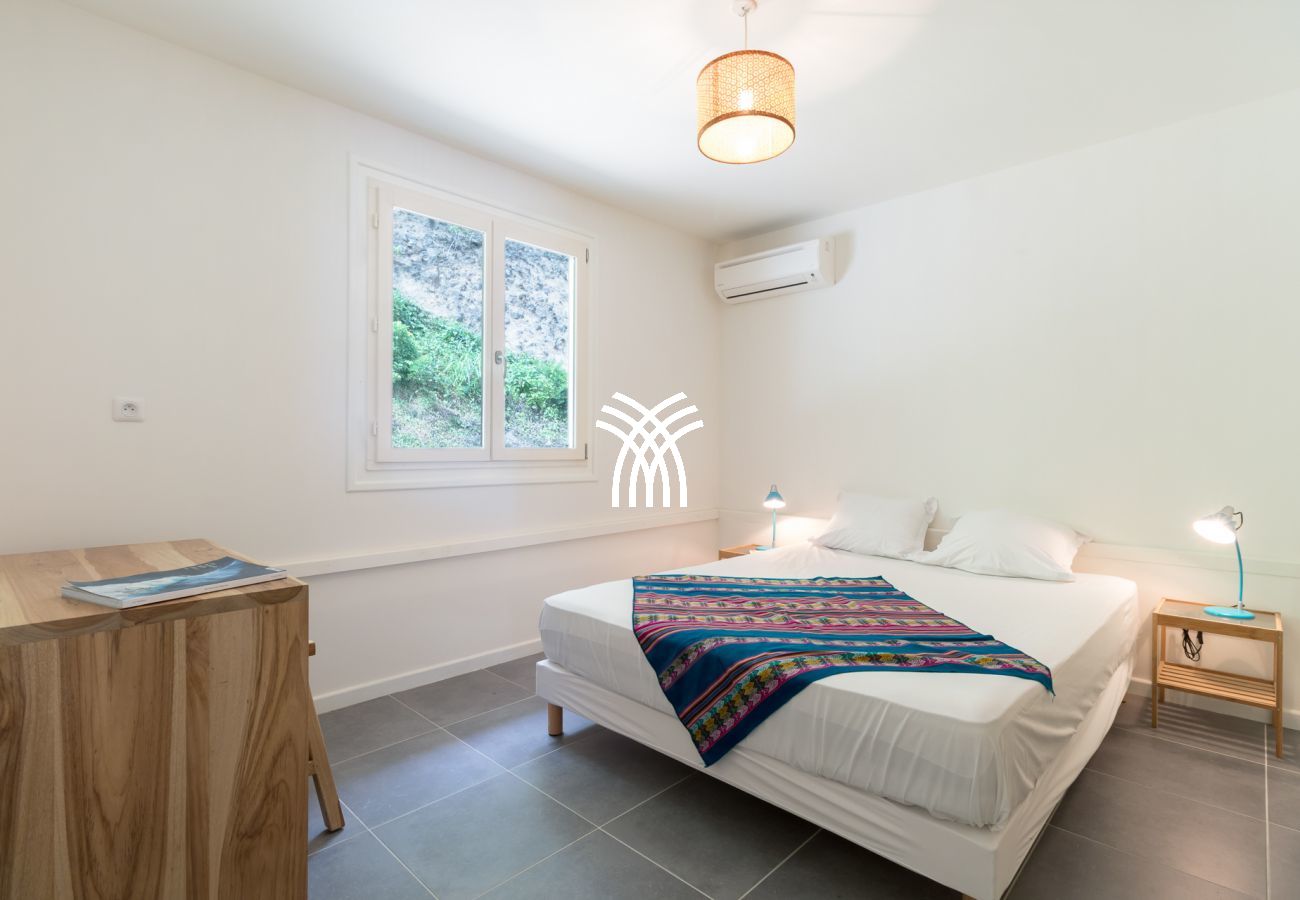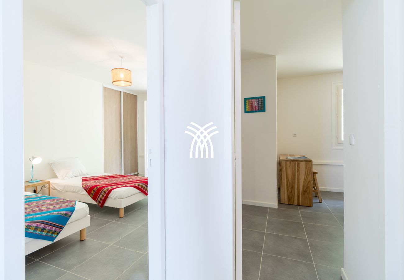 Facing the sea, the living room, kitchen, and dining area provide a spectacular view of the horizon, where the pool, sky, sea, and surrounding nature come together seamlessly. Villa Moon accommodates up to thirteen guests across two suites, a double room, a family room, and a mezzanine. The master suite, with its refined decor, opens onto the terrace. This room, with its 160x200 bed, bedside tables, desk, and television, offers a direct sea view. The en-suite bathroom features an Italian shower, double sink, and separate toilet. The second suite, embraced by tropical greenery, exudes a serene and feminine ambiance with a 180x200 bed, desk, and private bathroom with shower and toilet. The family room, located on the garden side, provides five beds: a 160x200 bed, two 90x190 bunk beds, and a single bed. The fourth room, featuring a colonial-style four-poster bed (180x200), shares a spacious bathroom with the family room, equipped with two showers and two sinks. Additional sleeping arrangements are available on the mezzanine with a sofa bed.
