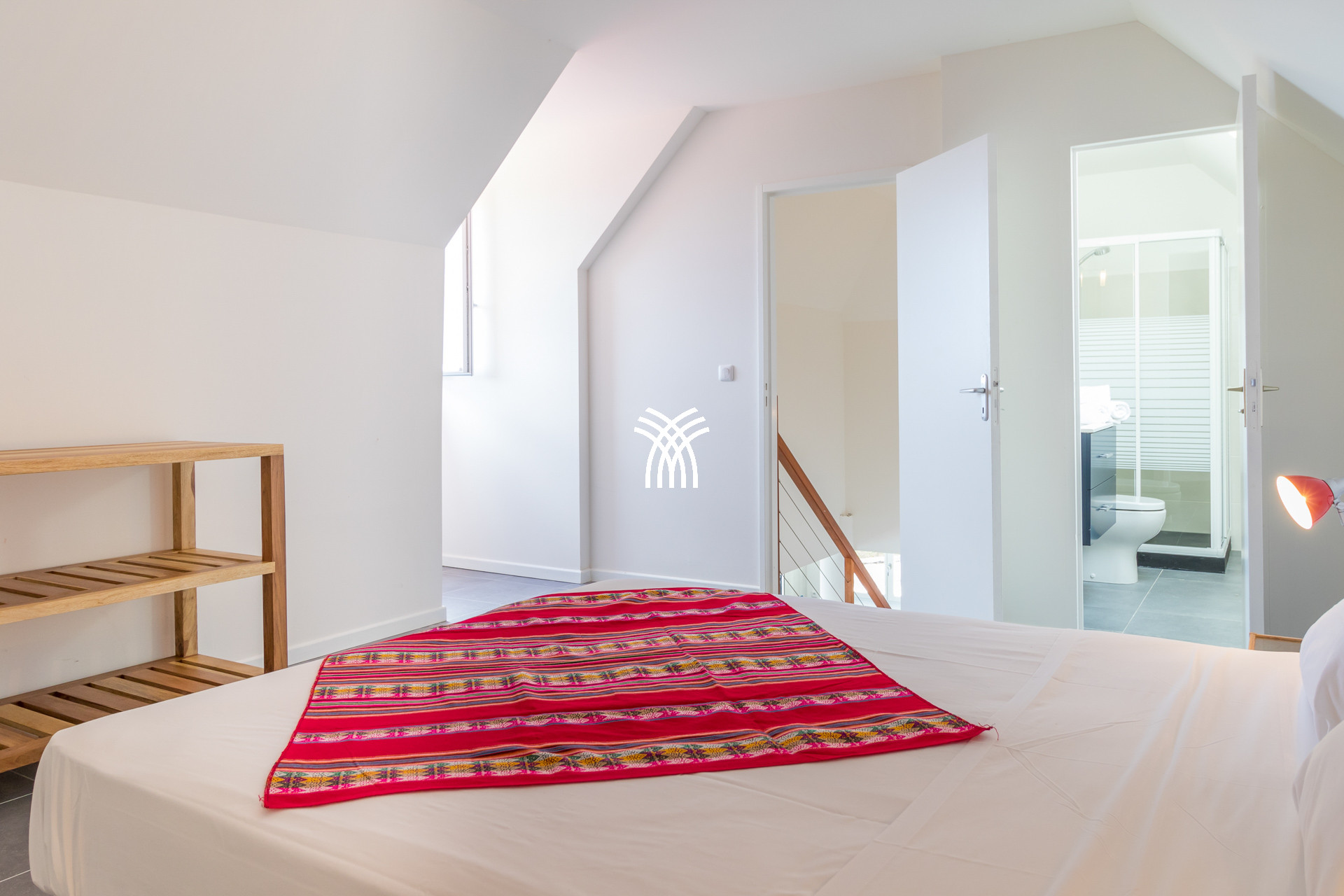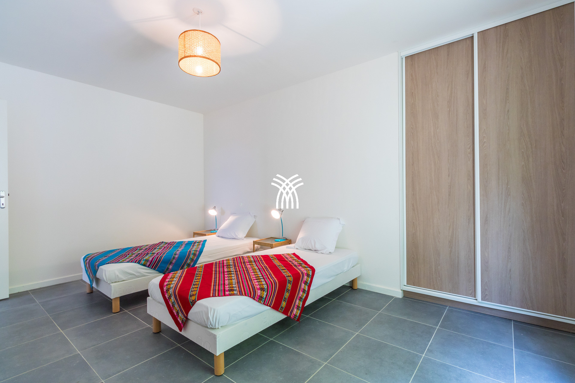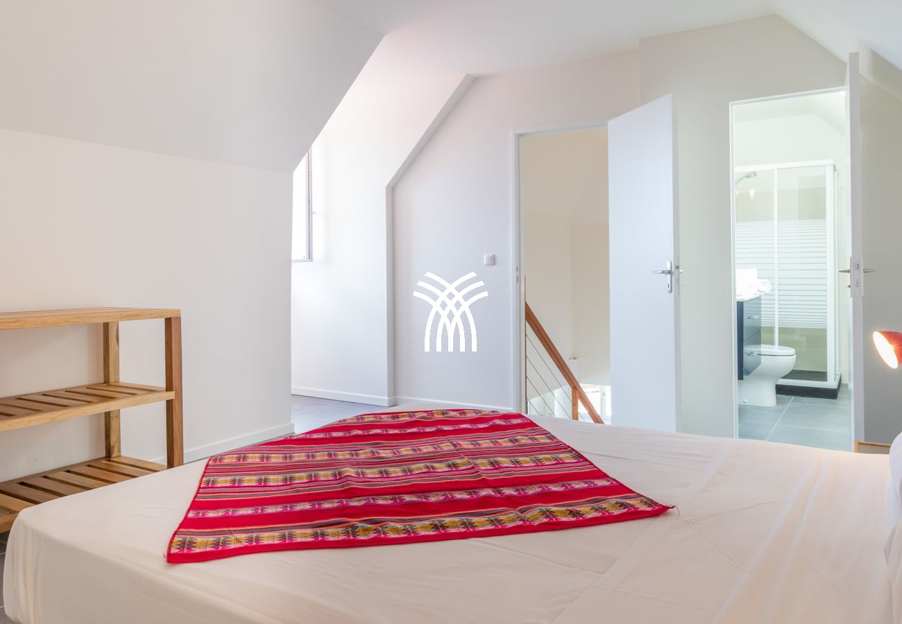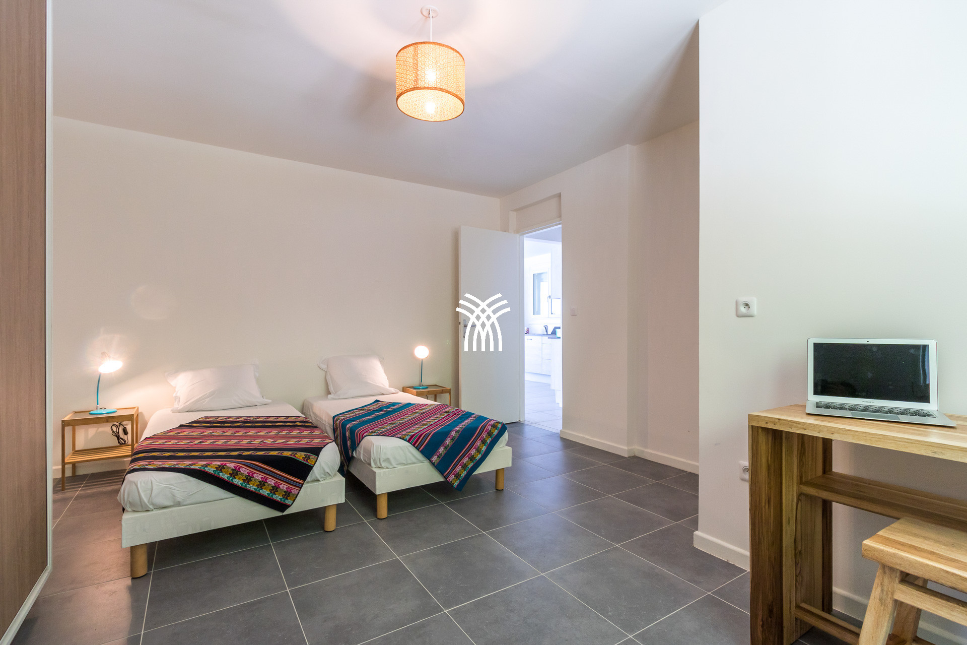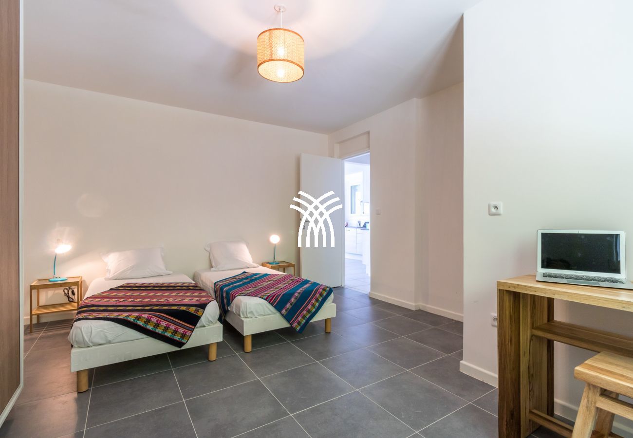 Facing the sea, the living room, kitchen, and dining area provide a spectacular view of the horizon, where the pool, sky, sea, and surrounding nature come together seamlessly. Villa Moon accommodates up to thirteen guests across two suites, a double room, a family room, and a mezzanine. The master suite, with its refined decor, opens onto the terrace. This room, with its 160x200 bed, bedside tables, desk, and television, offers a direct sea view. The en-suite bathroom features an Italian shower, double sink, and separate toilet. The second suite, embraced by tropical greenery, exudes a serene and feminine ambiance with a 180x200 bed, desk, and private bathroom with shower and toilet. The family room, located on the garden side, provides five beds: a 160x200 bed, two 90x190 bunk beds, and a single bed. The fourth room, featuring a colonial-style four-poster bed (180x200), shares a spacious bathroom with the family room, equipped with two showers and two sinks. Additional sleeping arrangements are available on the mezzanine with a sofa bed.