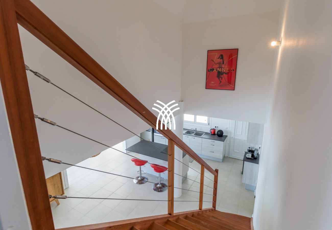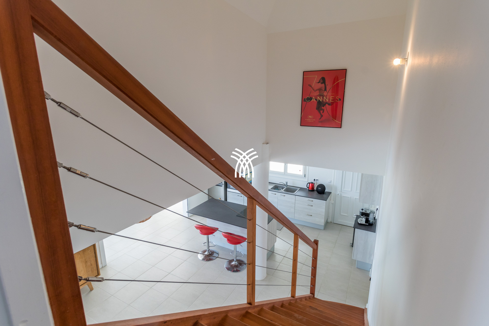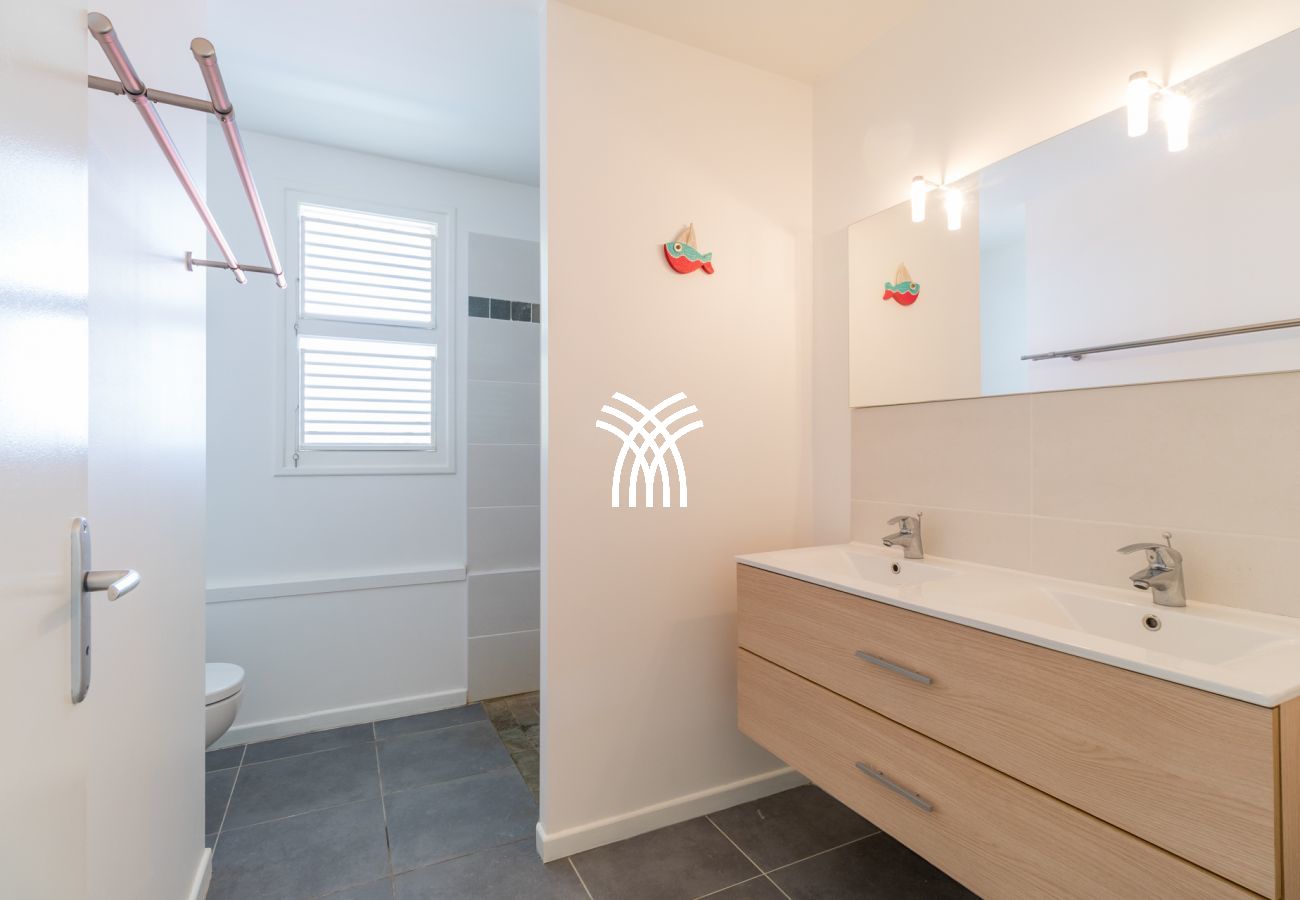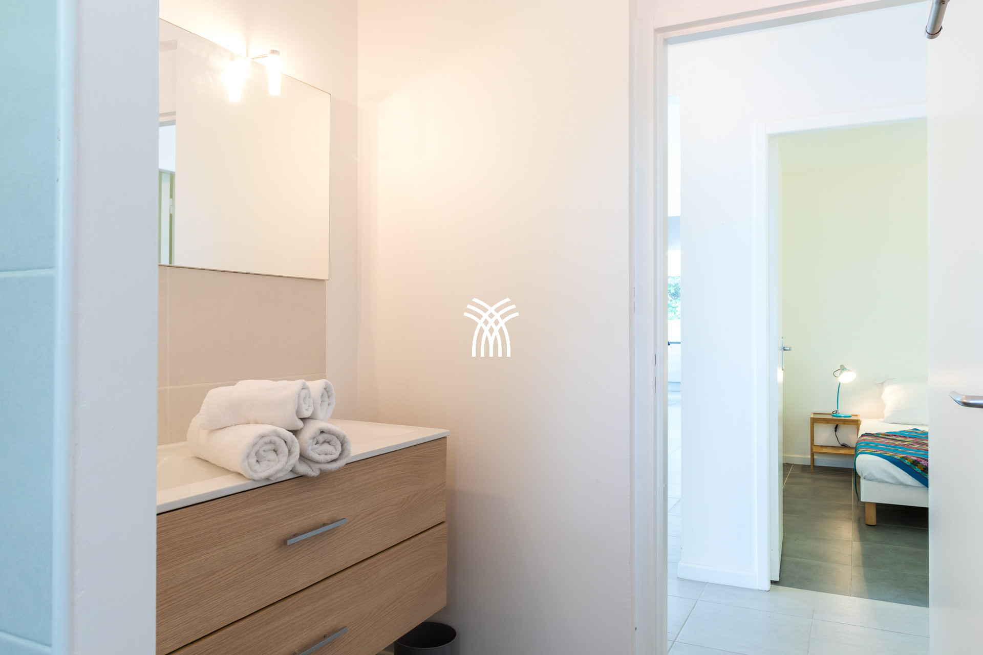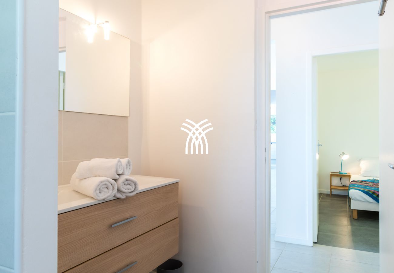 Facing the sea, the living room, kitchen, and dining area provide a spectacular view of the horizon, where the pool, sky, sea, and surrounding nature come together seamlessly. Villa Moon accommodates up to thirteen guests across two suites, a double room, a family room, and a mezzanine. The master suite, with its refined decor, opens onto the terrace. This room, with its 160x200 bed, bedside tables, desk, and television, offers a direct sea view. The en-suite bathroom features an Italian shower, double sink, and separate toilet. The second suite, embraced by tropical greenery, exudes a serene and feminine ambiance with a 180x200 bed, desk, and private bathroom with shower and toilet. The family room, located on the garden side, provides five beds: a 160x200 bed, two 90x190 bunk beds, and a single bed. The fourth room, featuring a colonial-style four-poster bed (180x200), shares a spacious bathroom with the family room, equipped with two showers and two sinks. Additional sleeping arrangements are available on the mezzanine with a sofa bed.