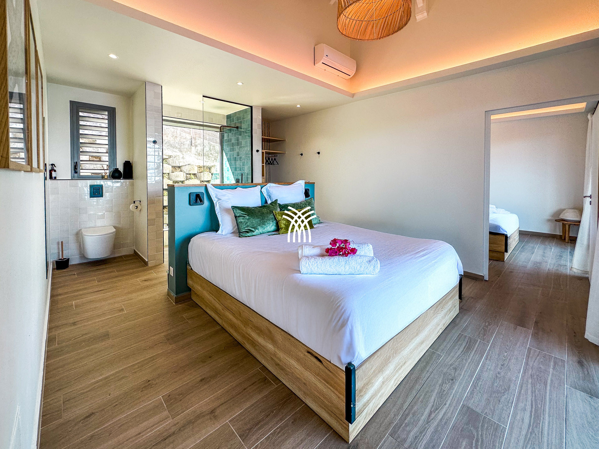 Located downstream, Villa Baya immerses you in a lush environment with a magnificent view of the tropical garden and the atypical landscapes of Les Saintes. It offers the same generous surface area of 100m² with two welcoming bedrooms, a living room open to the outside, a shaded terrace, and a private pool. Its calm and intimate atmosphere is ideal for couples or families seeking serenity.