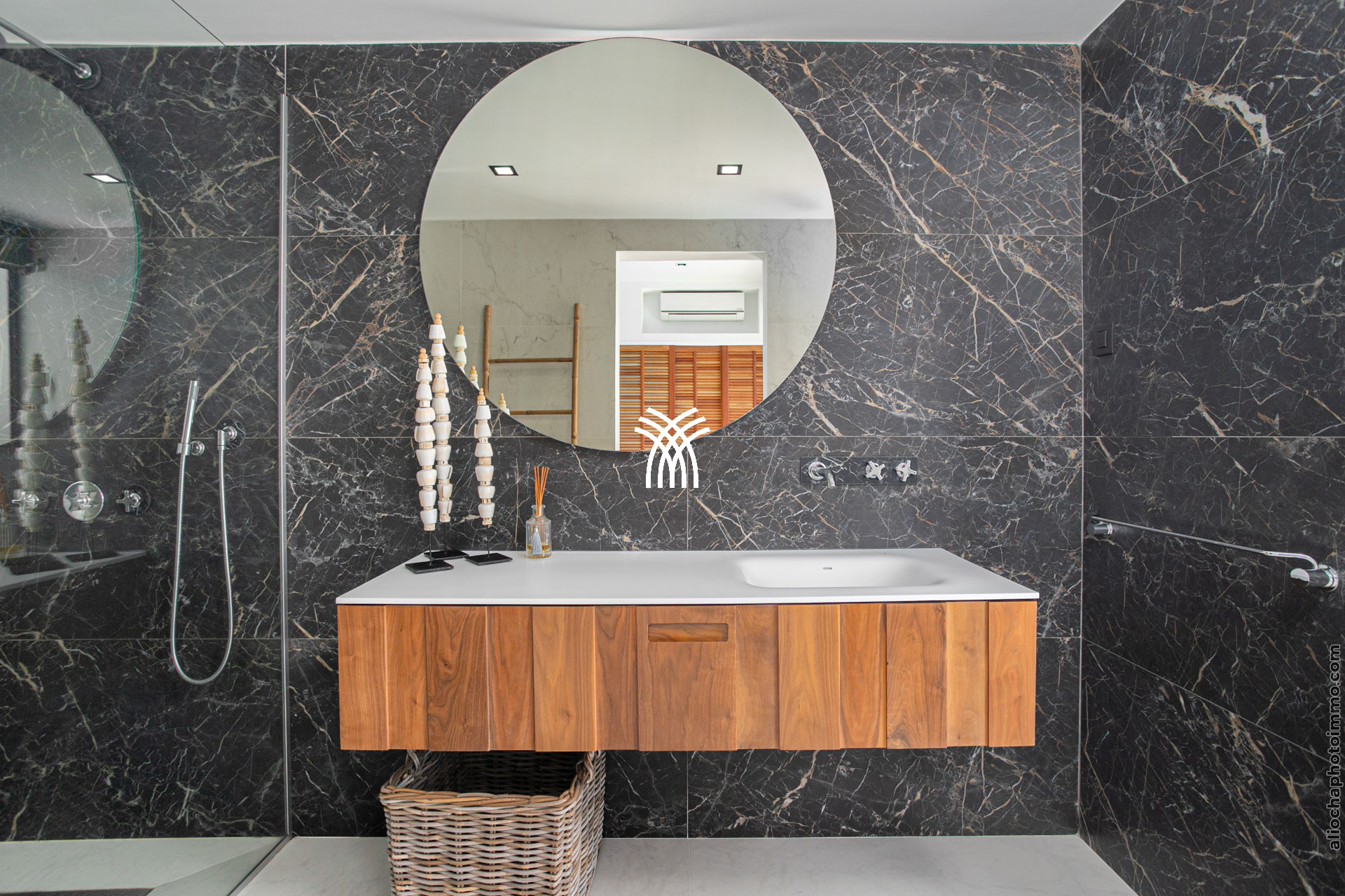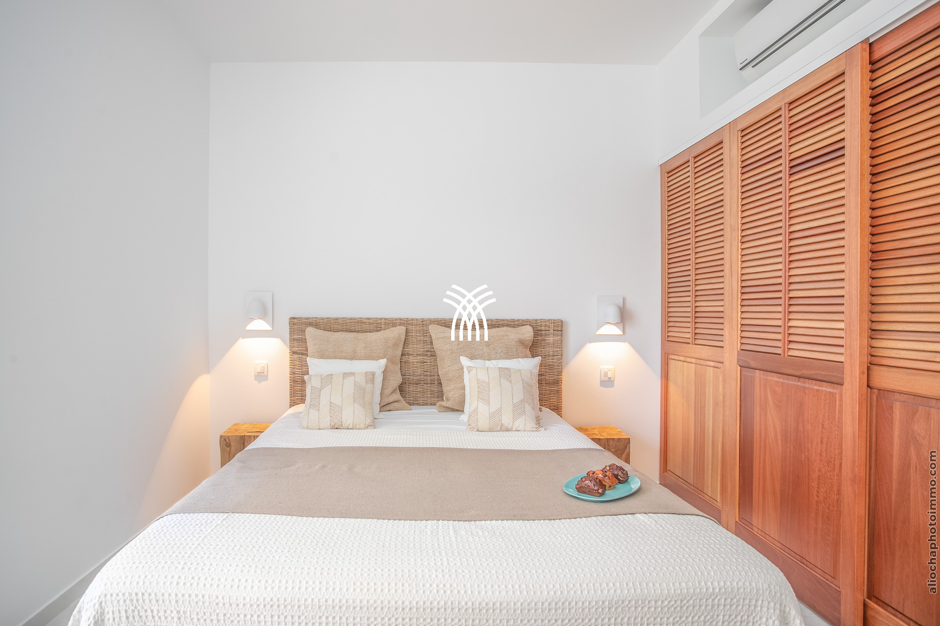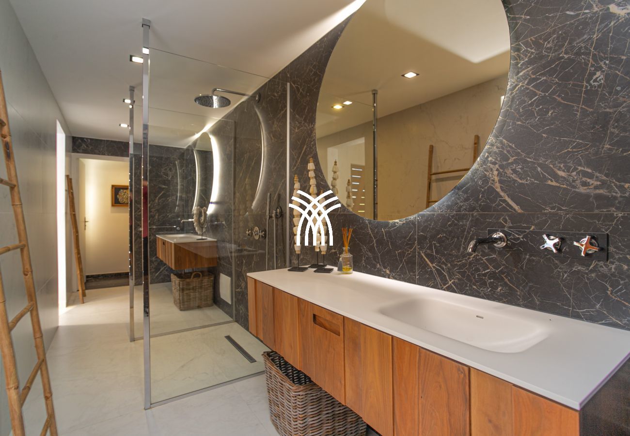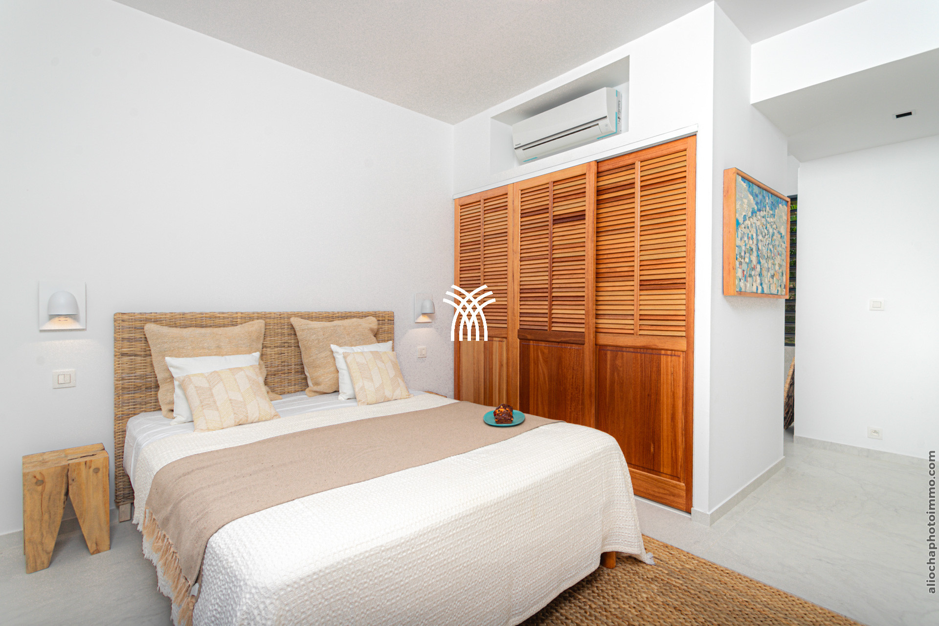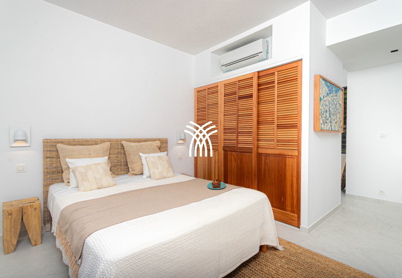 The villa features three elegant suites, each offering a stunning sea view and direct access to the terrace through large sliding glass doors. The master suite, worthy of a 5-star hotel, spans 30 m² and includes a king-size bed, a sofa, and ample storage space. Its open-air shower room, with noble materials such as marble and wood, is a true haven of serenity. The second bedroom, smaller but equally warm, also offers a beautiful sea view and a private bathroom. The third bedroom, accessible via a staircase lined with tropical plants, has its own terrace overlooking the garden and the sea.