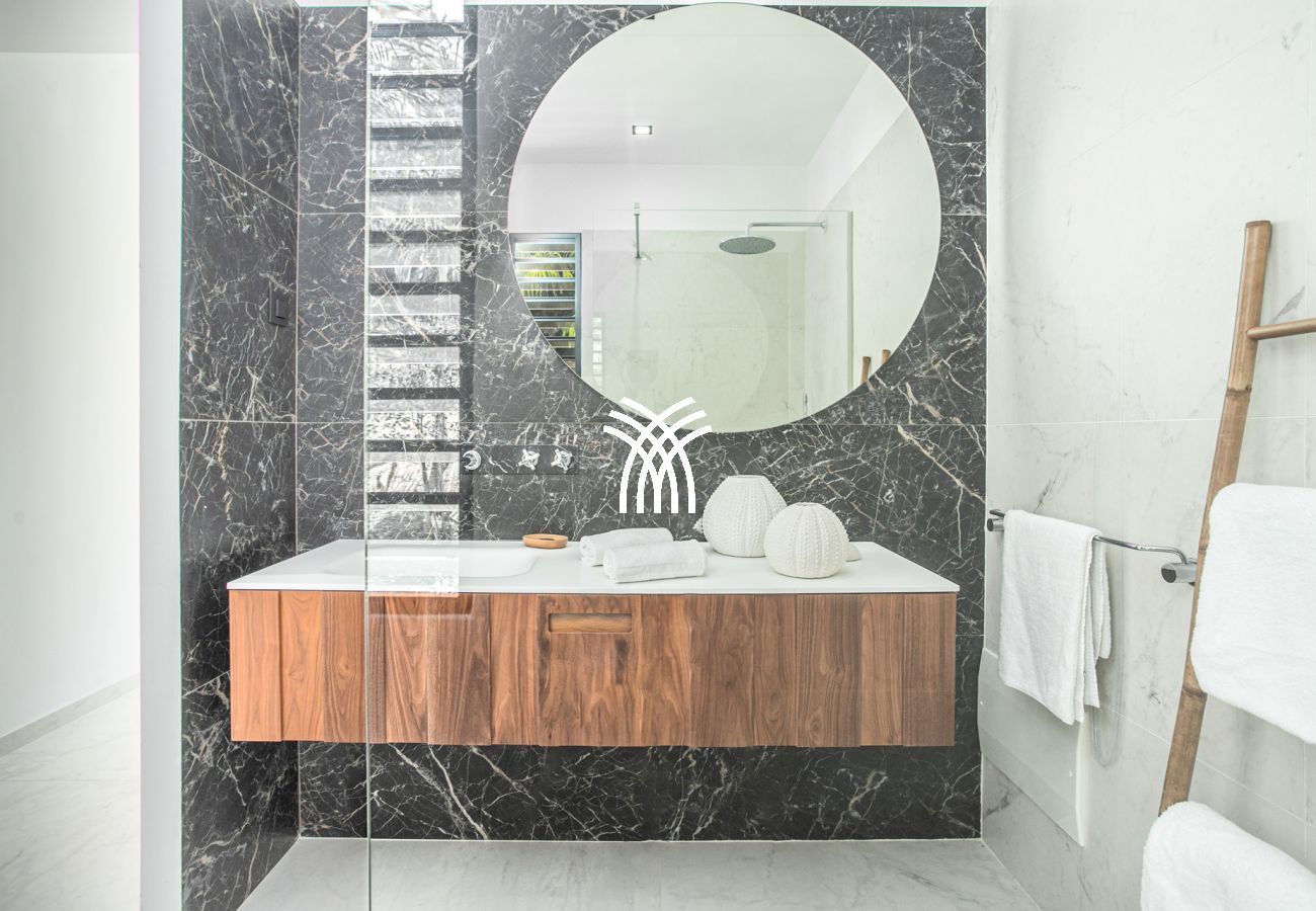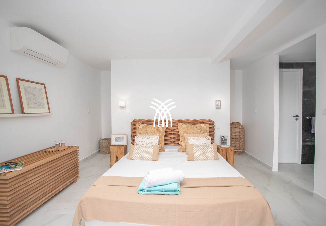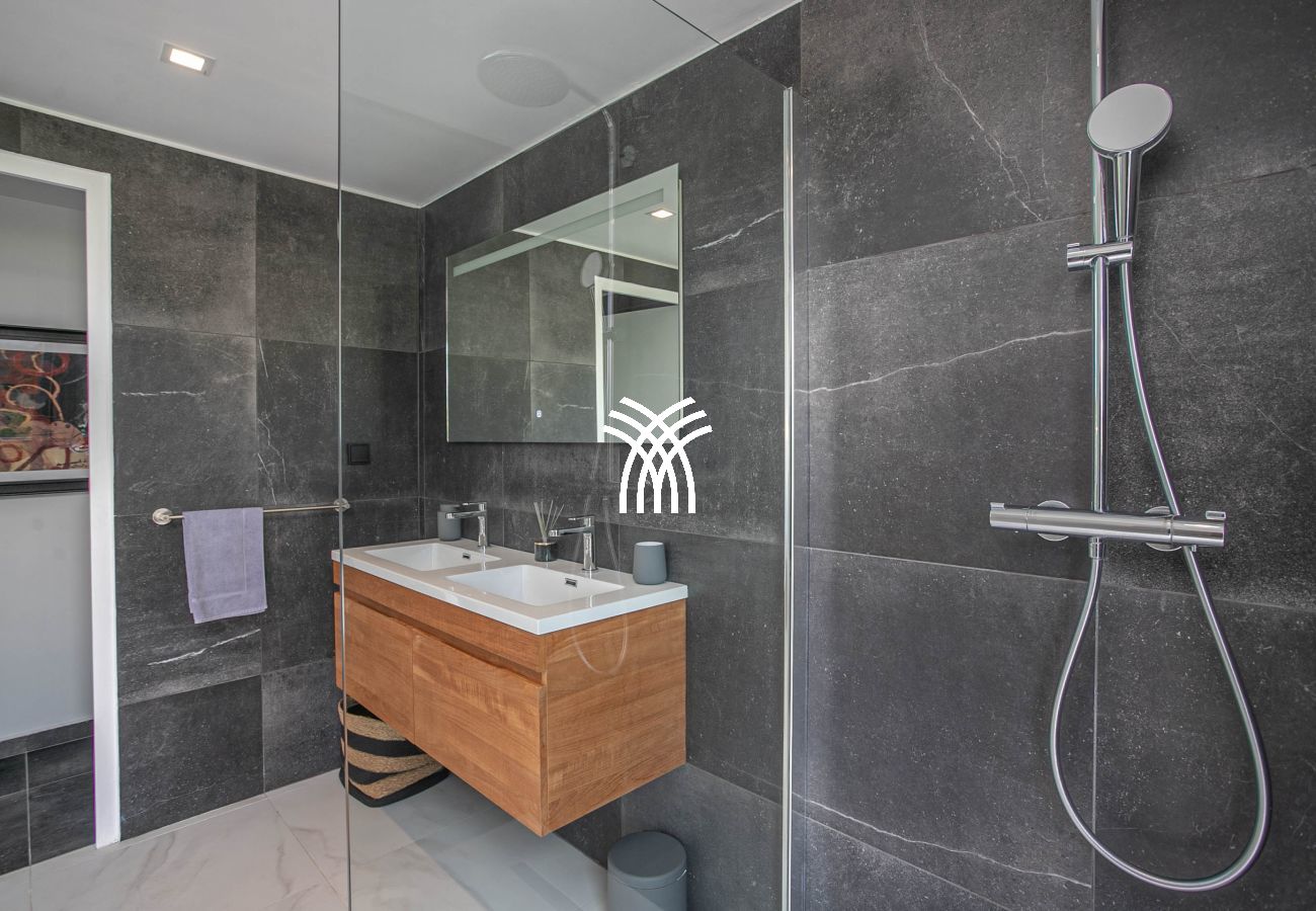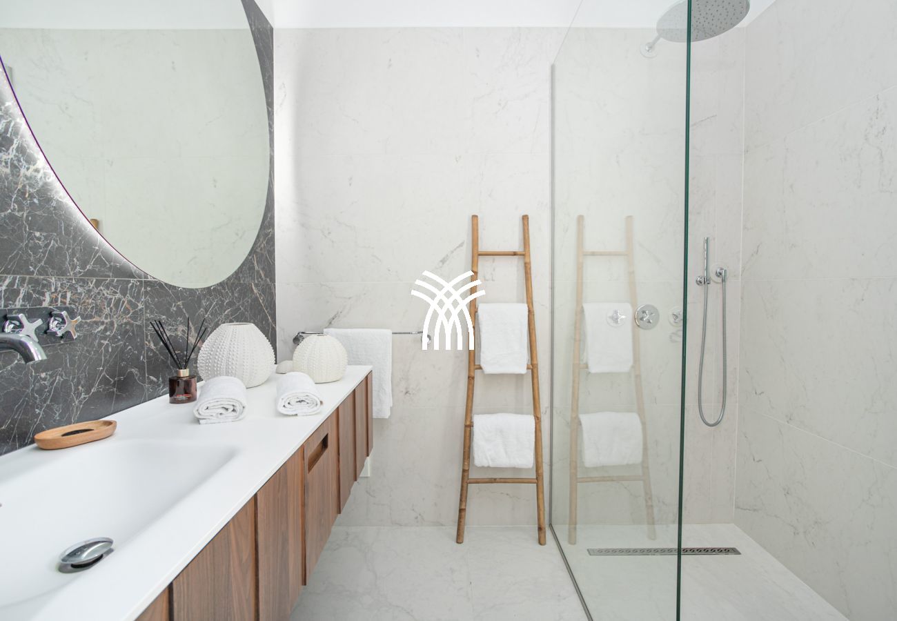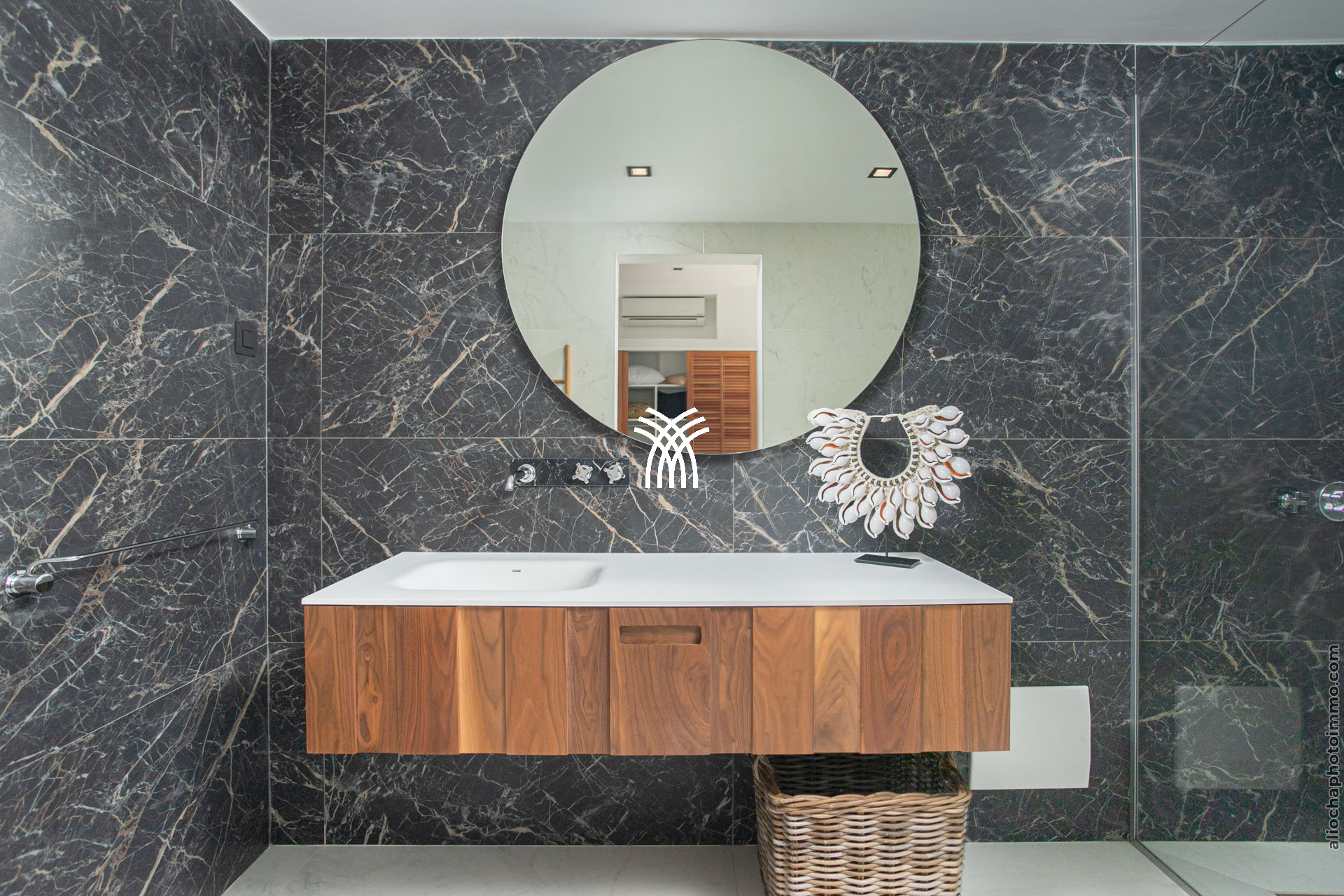The villa features three elegant suites, each offering a stunning sea view and direct access to the terrace through large sliding glass doors. The master suite, worthy of a 5-star hotel, spans 30 m² and includes a king-size bed, a sofa, and ample storage space. Its open-air shower room, with noble materials such as marble and wood, is a true haven of serenity. The second bedroom, smaller but equally warm, also offers a beautiful sea view and a private bathroom. The third bedroom, accessible via a staircase lined with tropical plants, has its own terrace overlooking the garden and the sea.